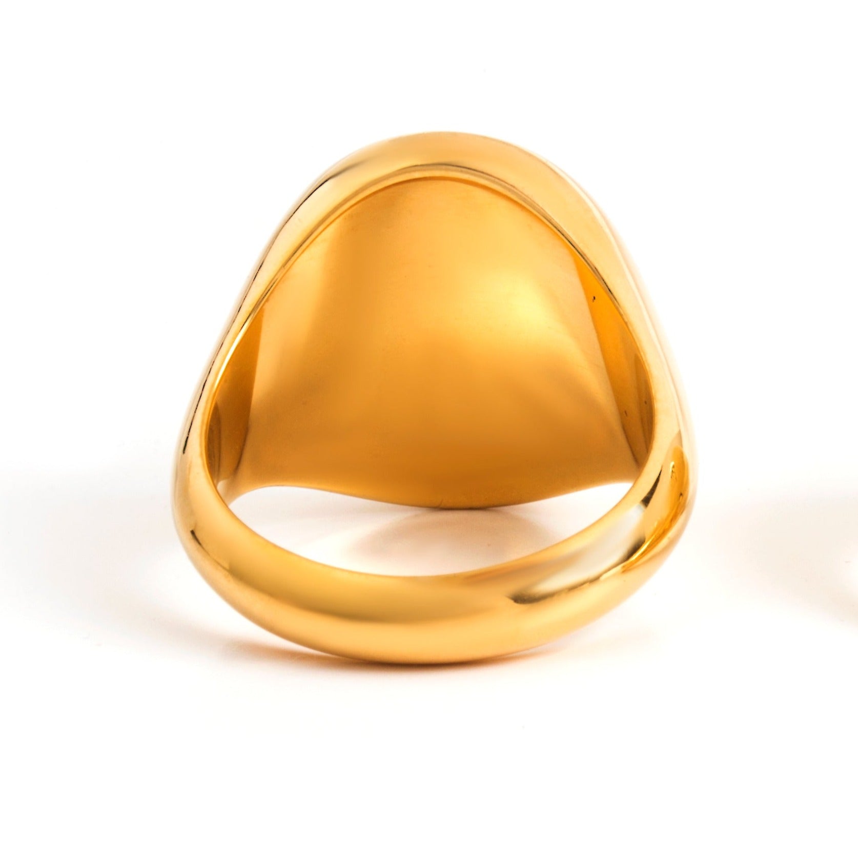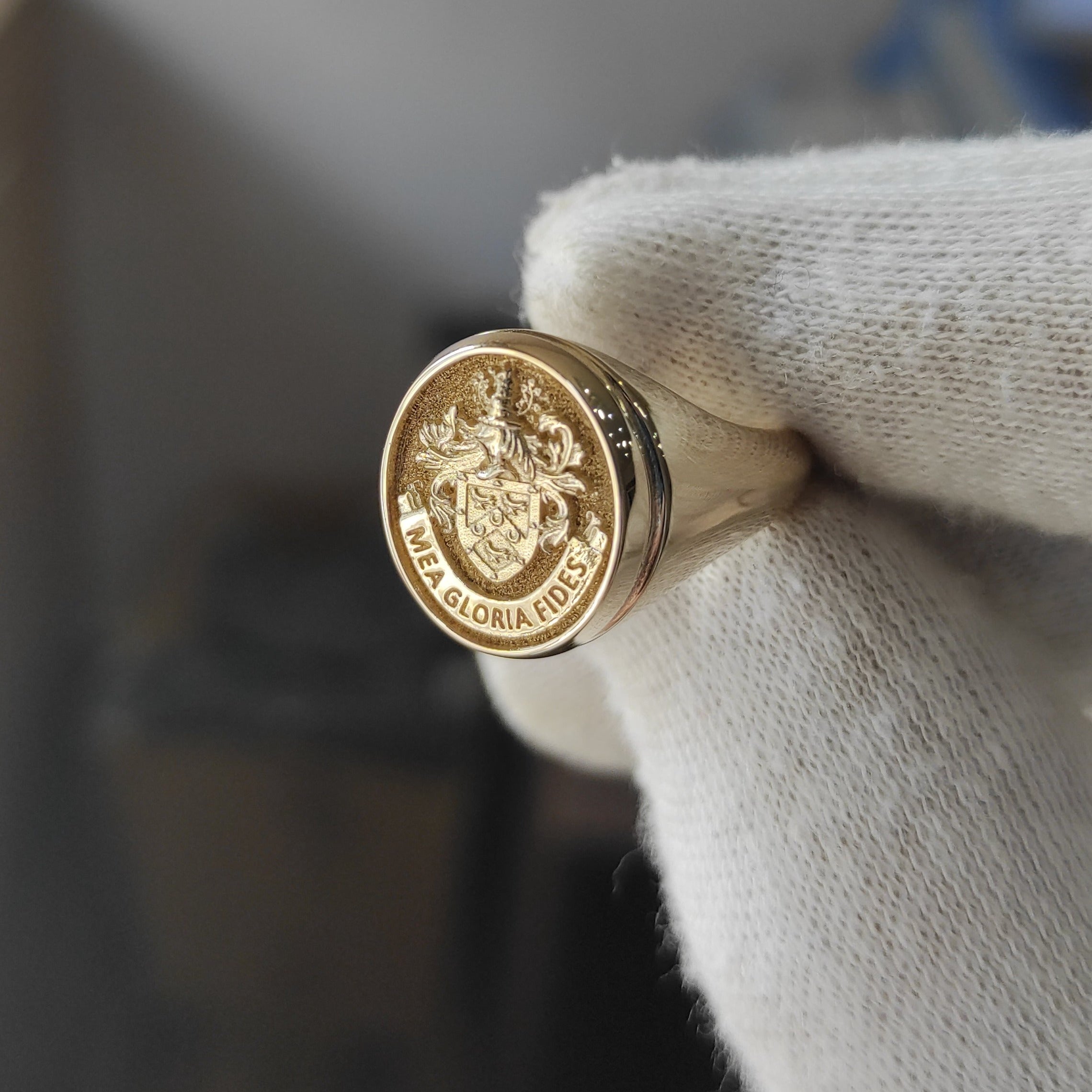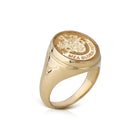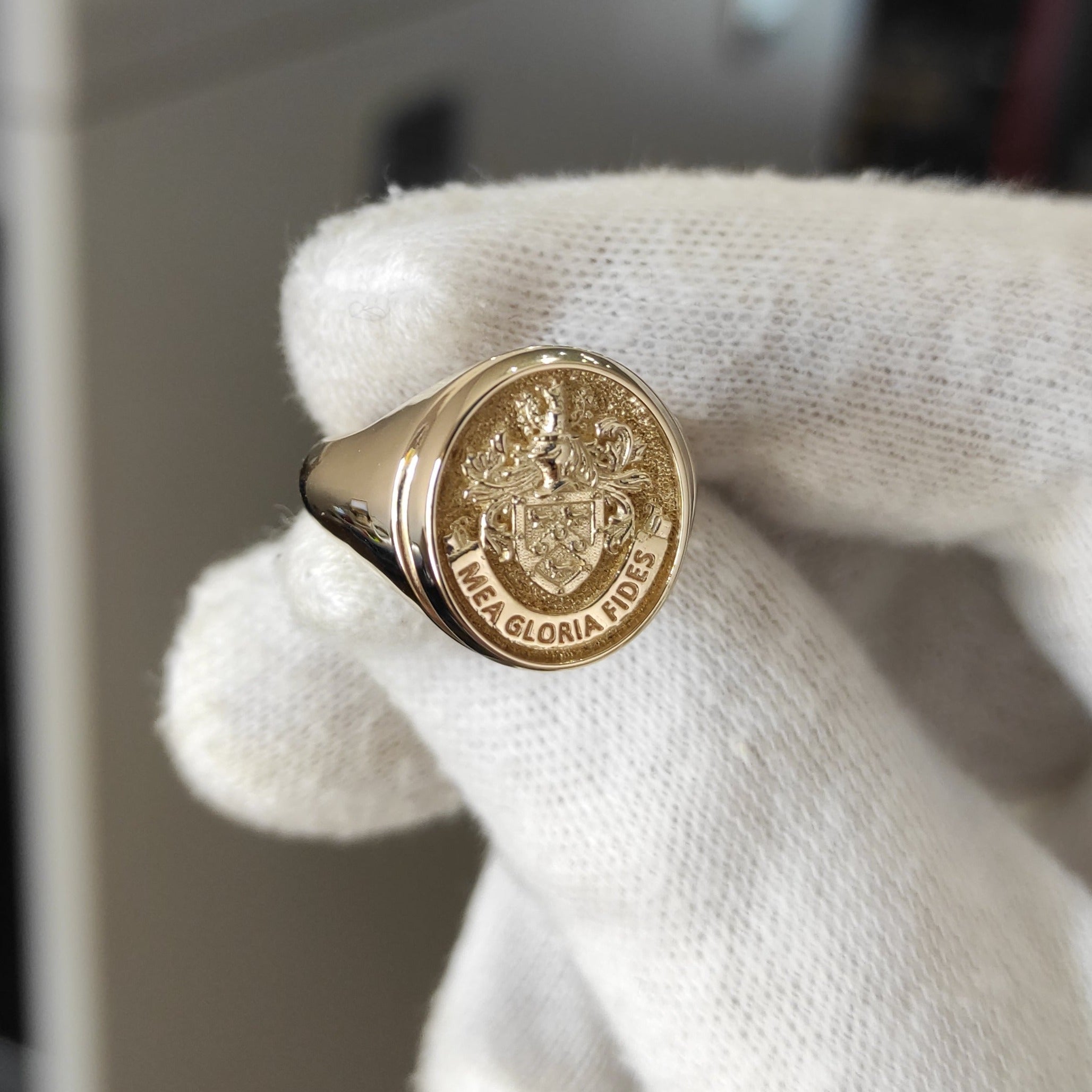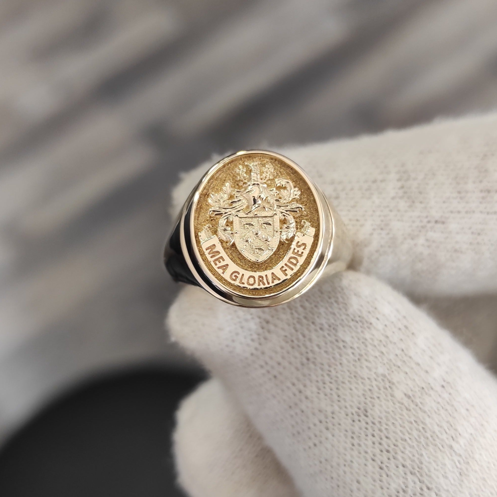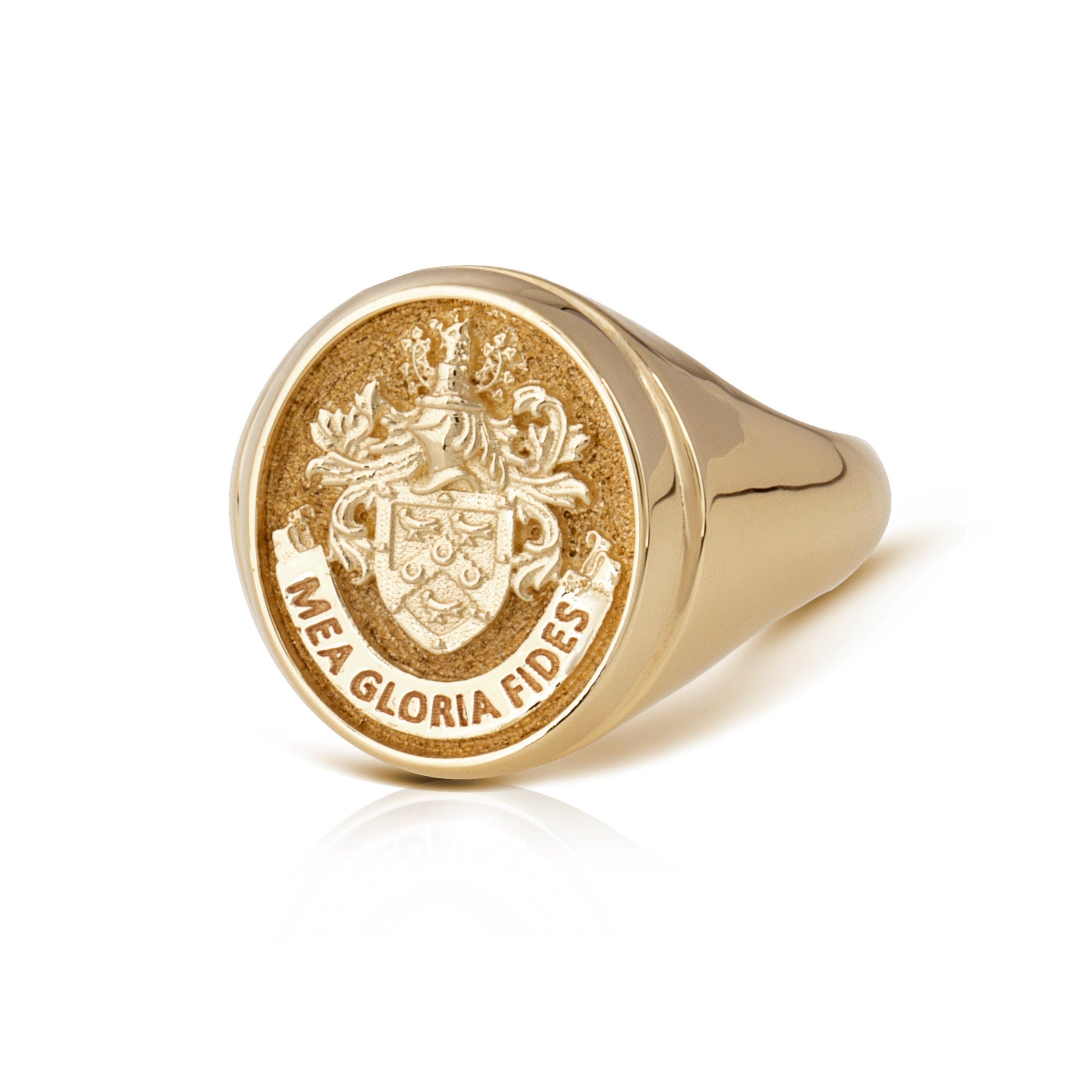 A Custom Family Crest signet ring made out of 9K Solid Gold, 14K Solid Gold, or 18K Solid Gold. Choose a Yellow Gold, White Gold, or a Rose Gold finish.