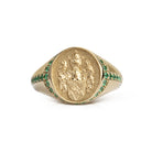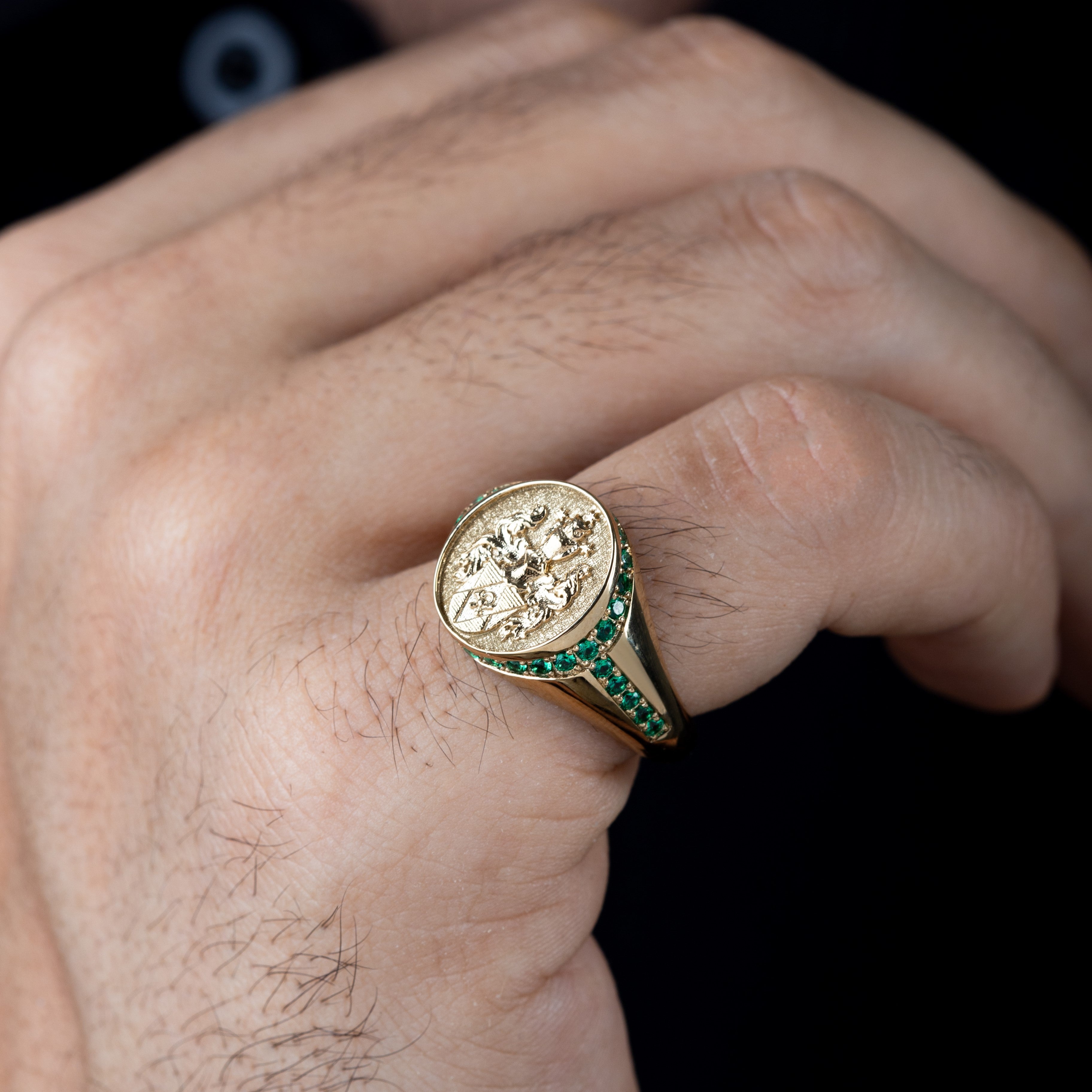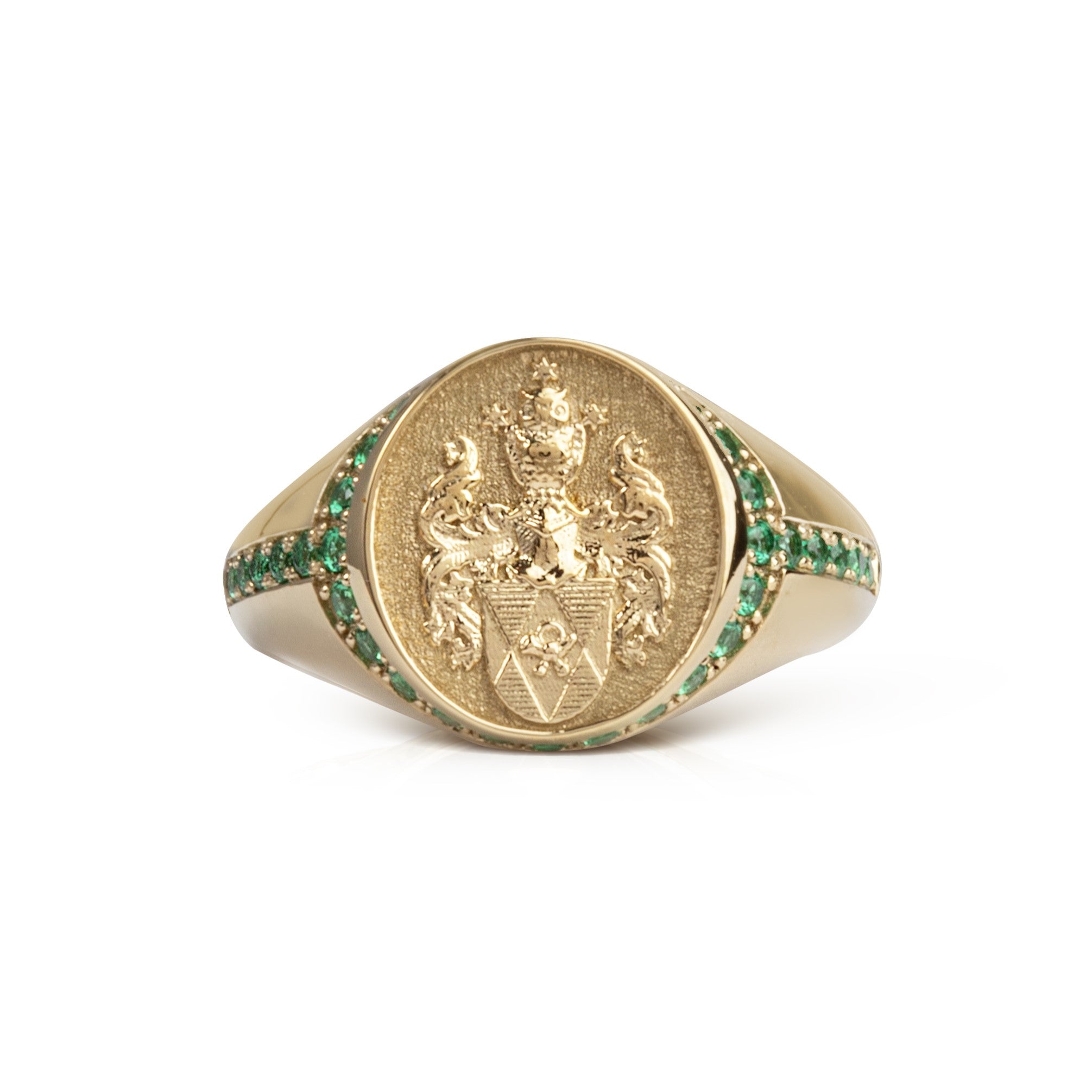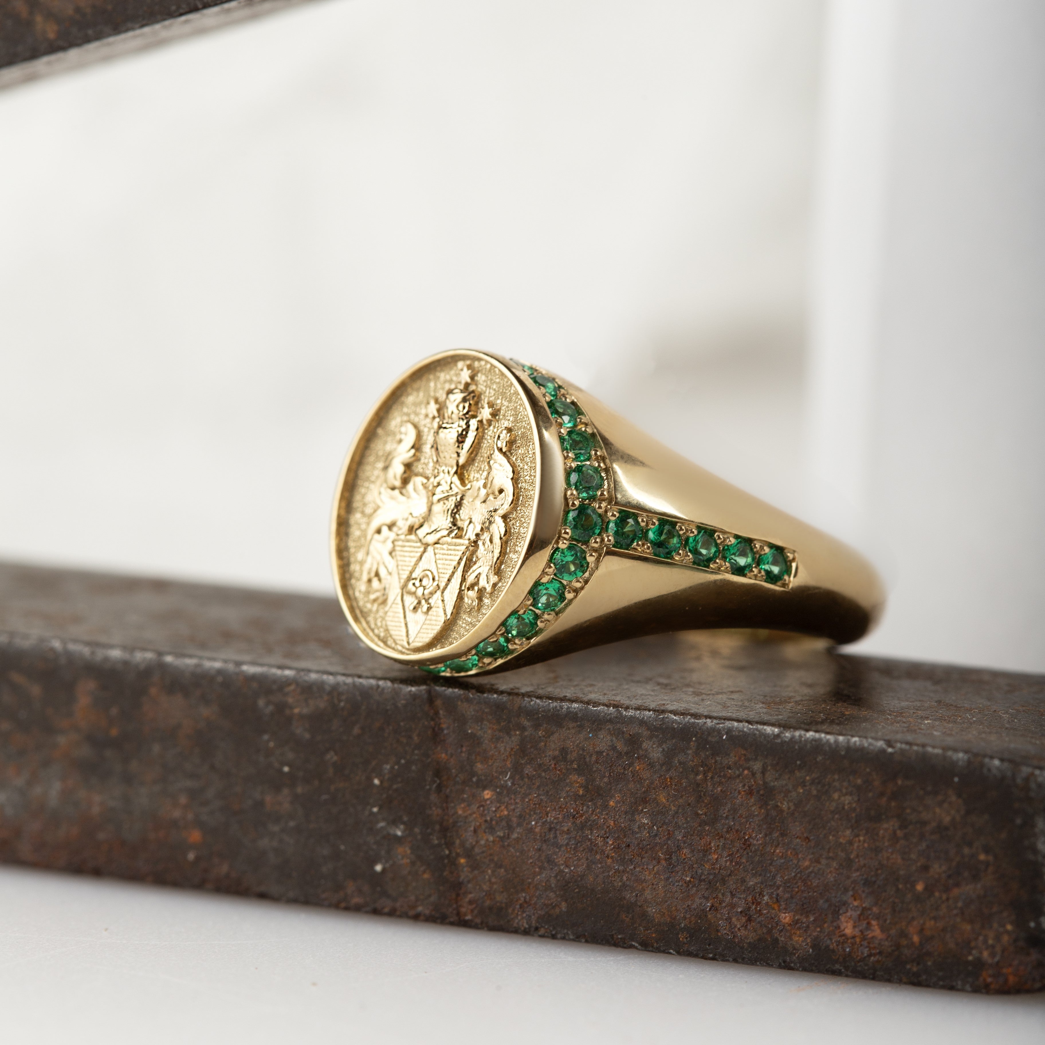 A family crest signet ring that can be personalized with your own crest. We can set different gemstones instead of diamonds, such as red ruby, blue sapphires, green emerald or a combination.