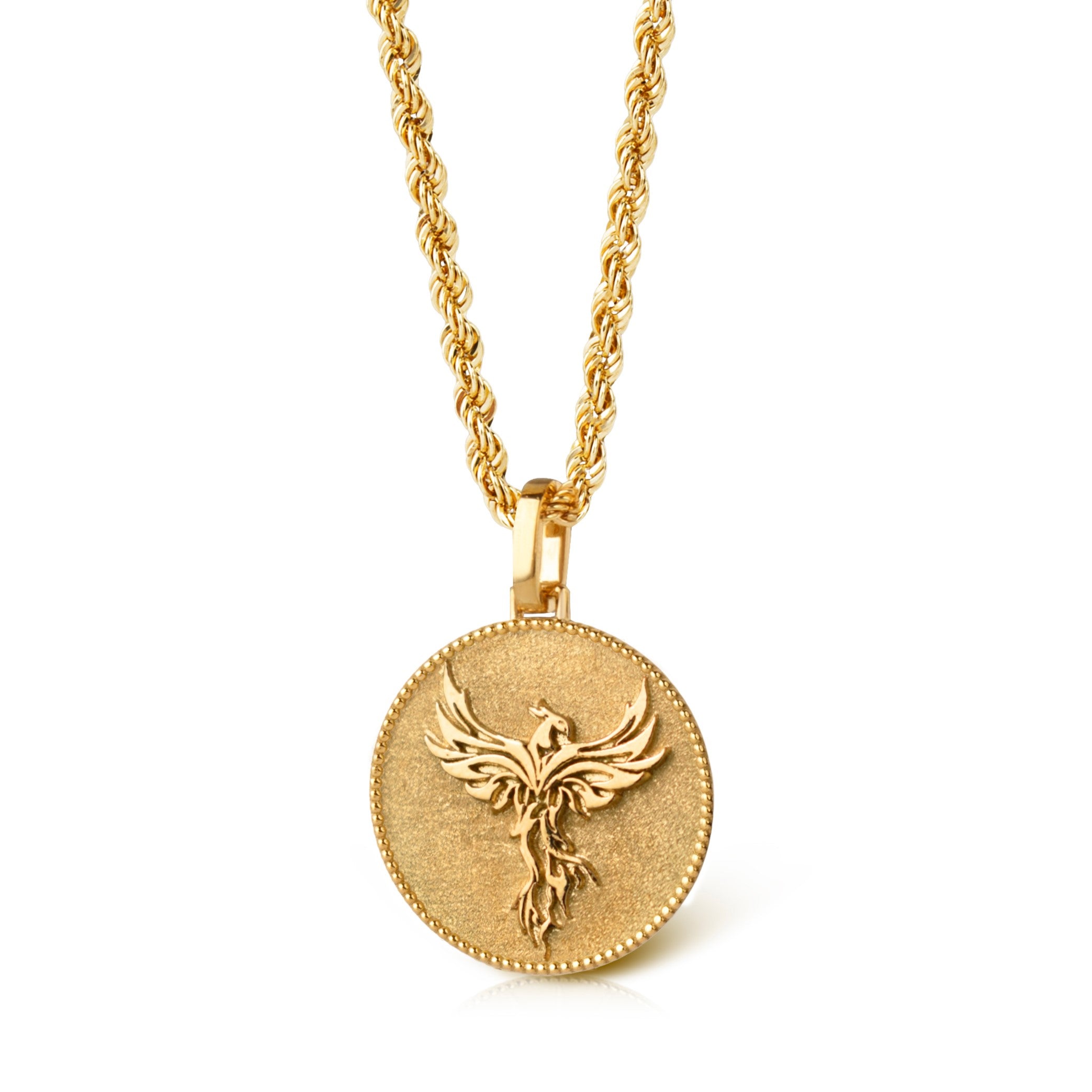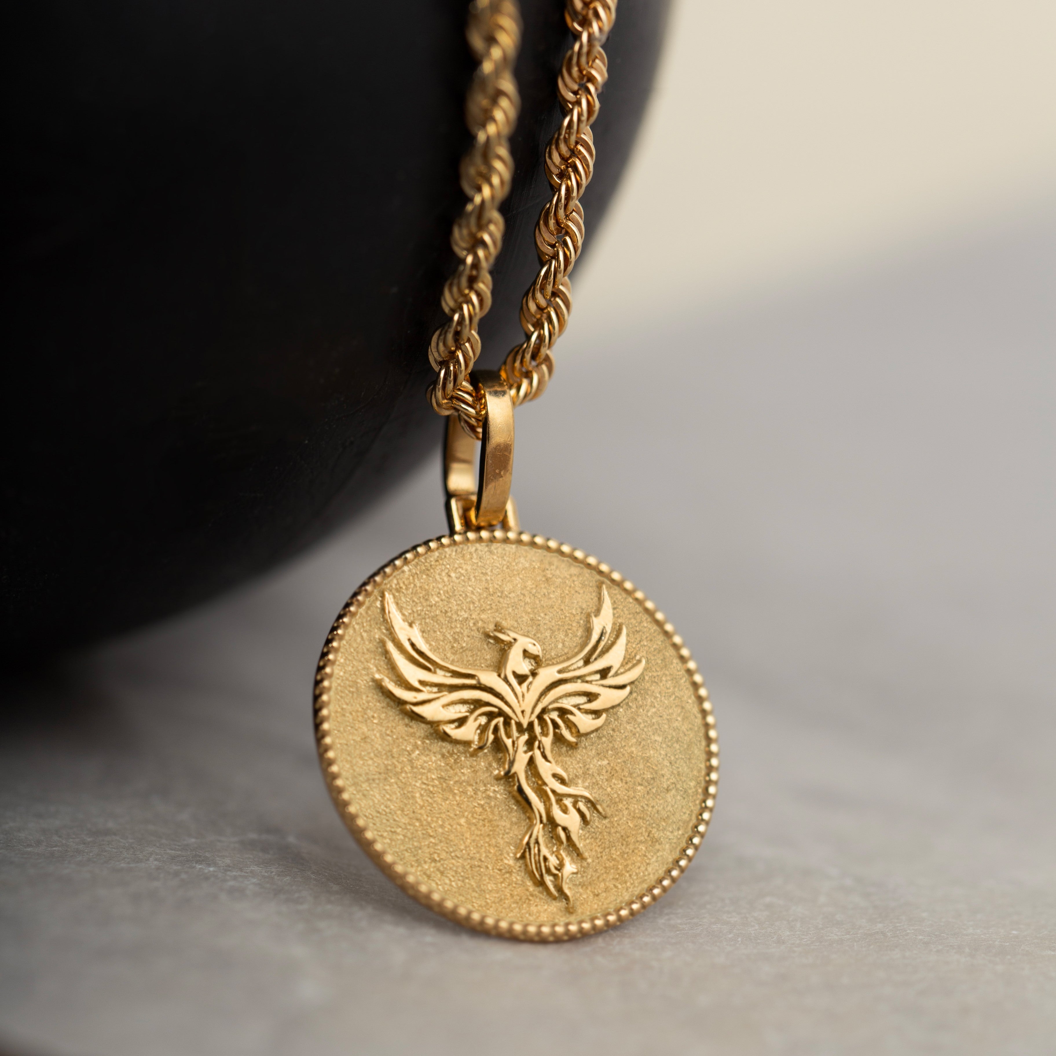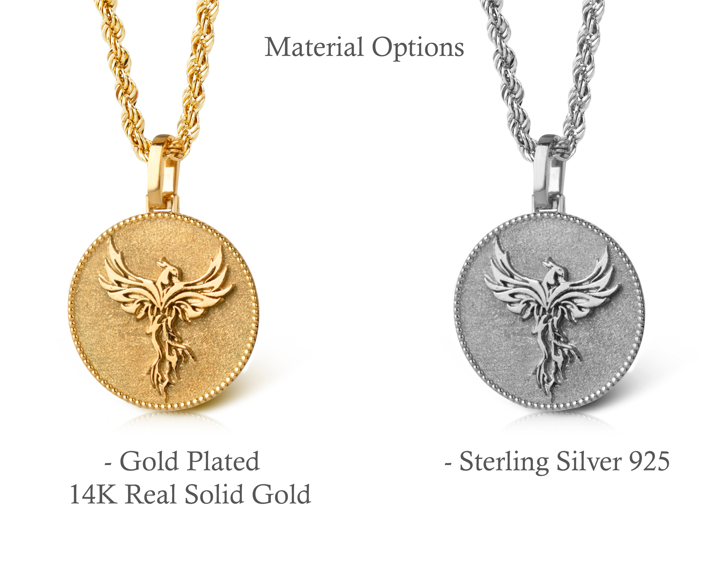 Our collection of round pendants with unique designs on top are made for both men and women. Our Phoenix necklace can be personalized on the back with a custom message of your choice.