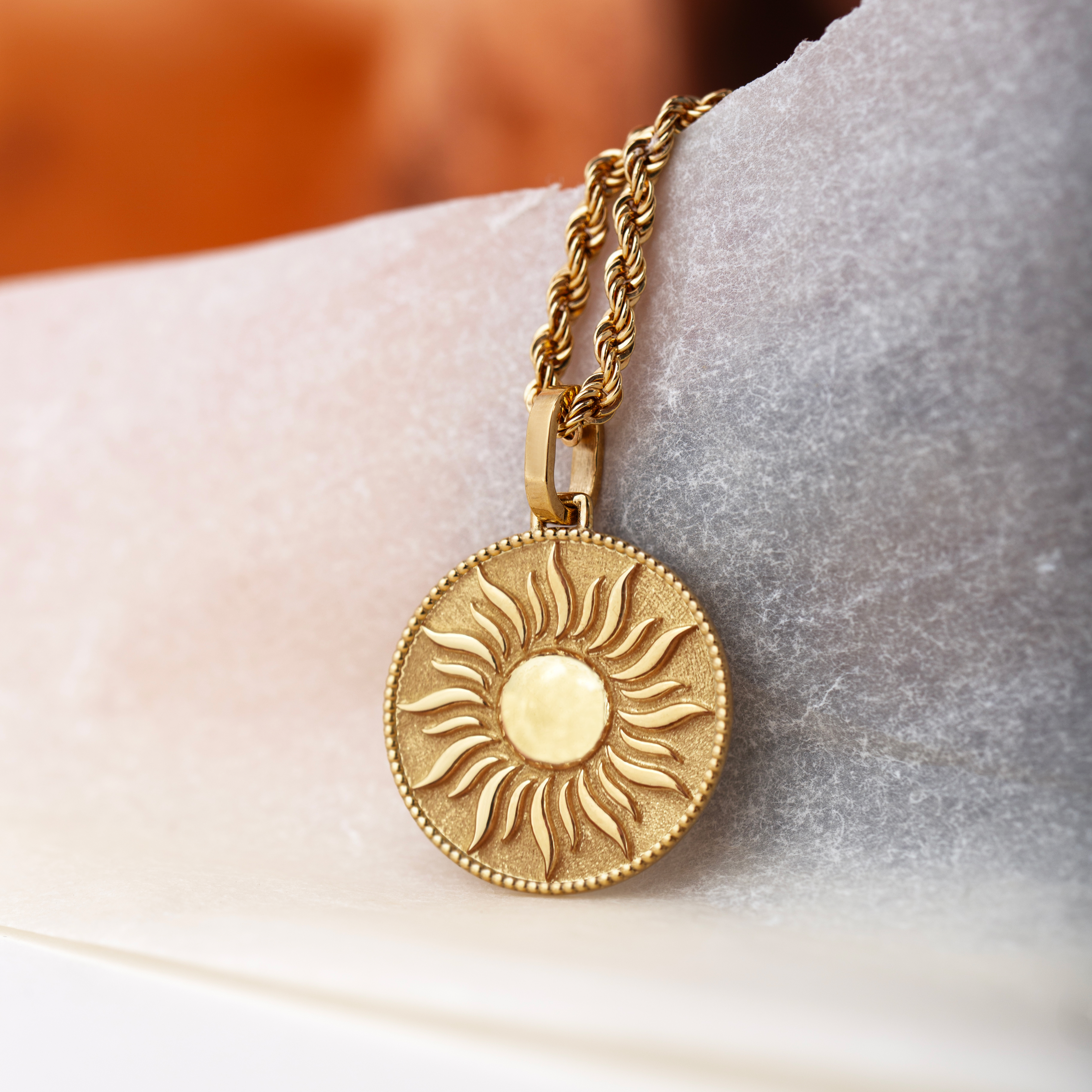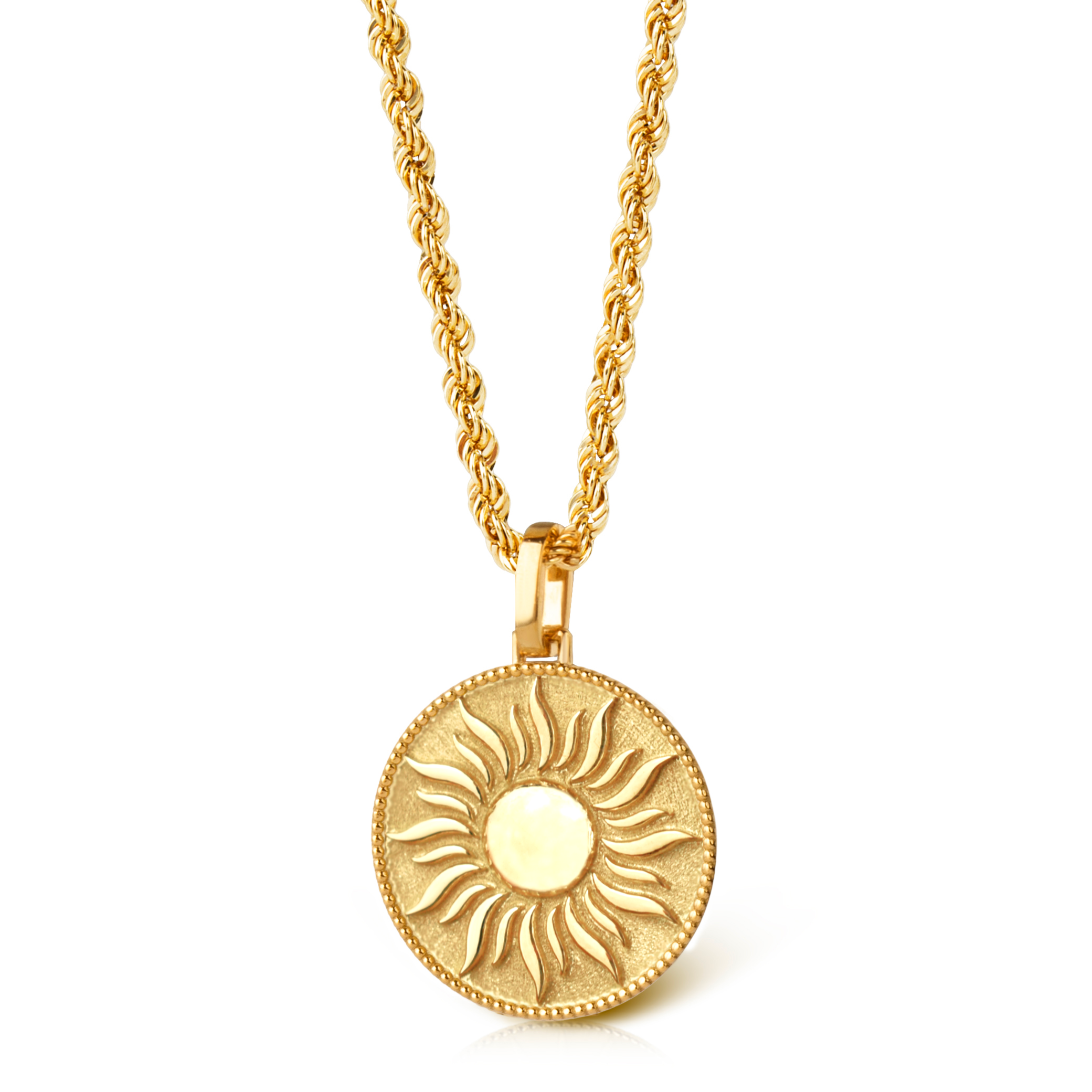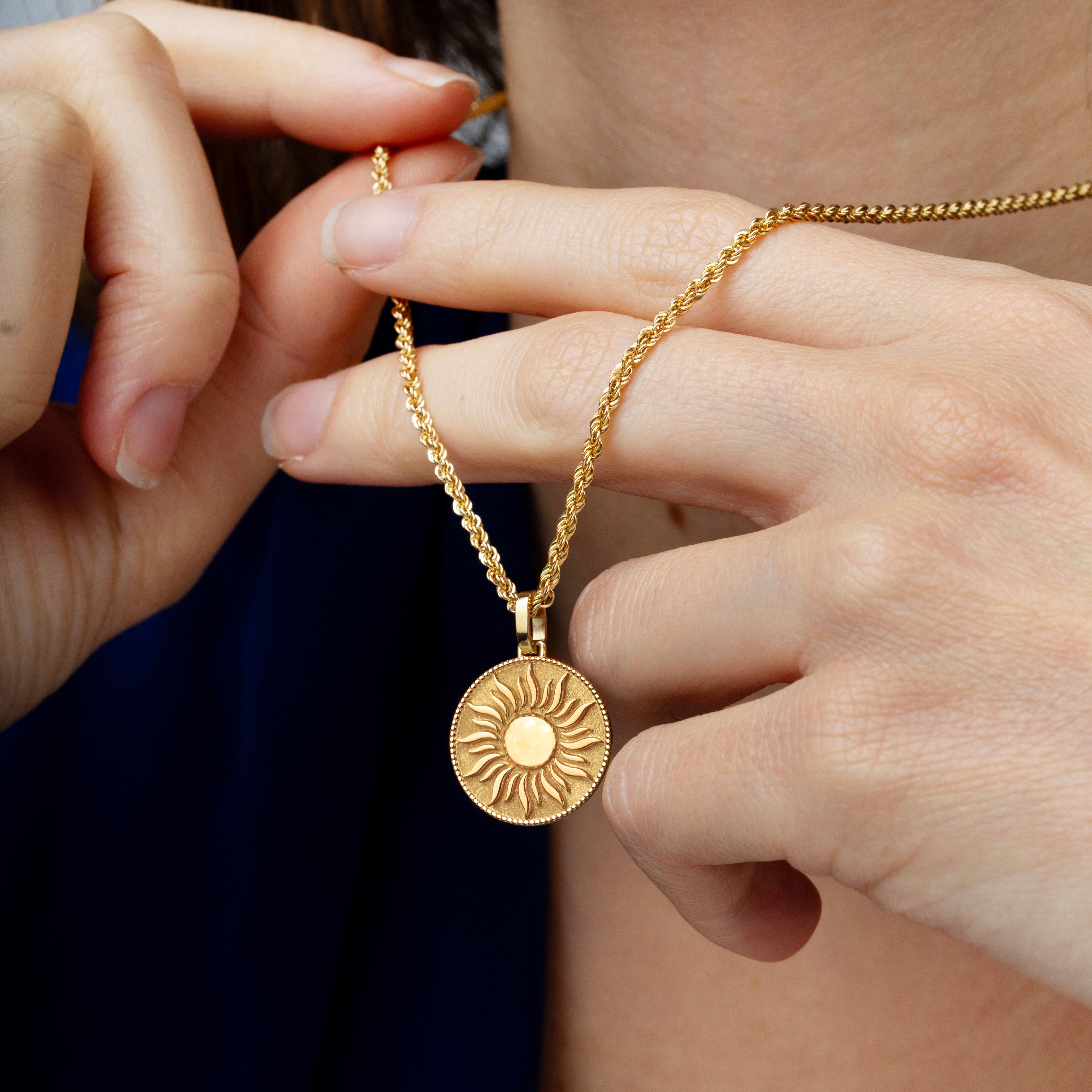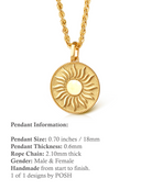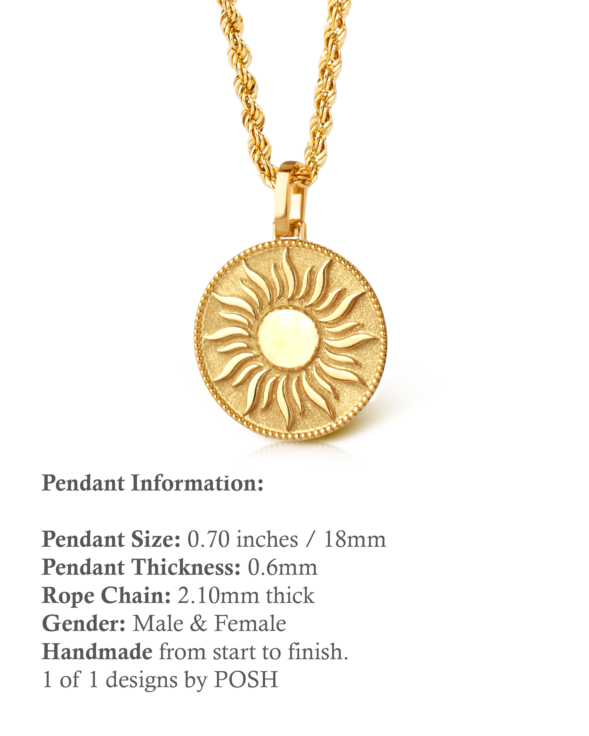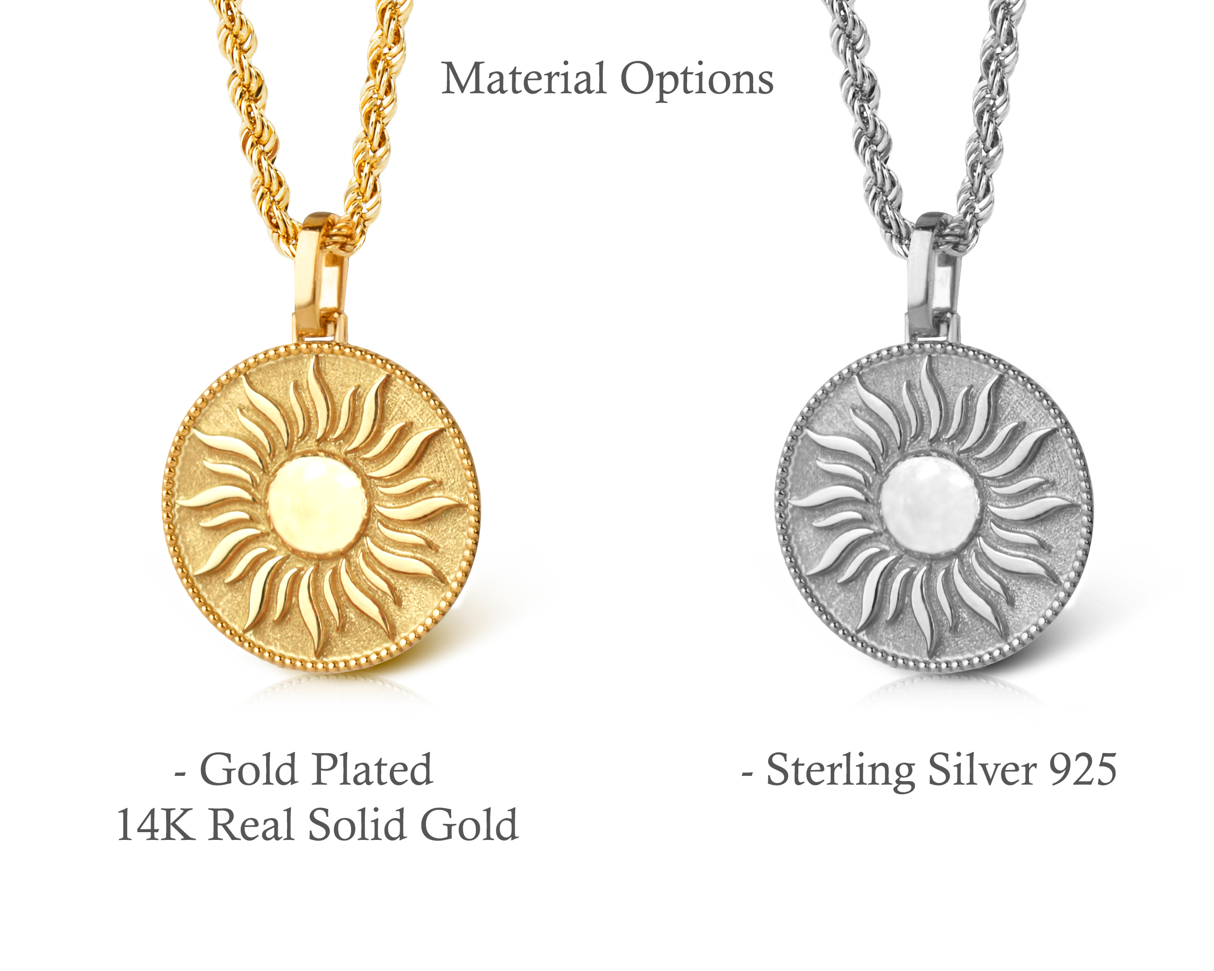 Our collection of round pendants with unique designs on top are made for both men and women. Our Sunburst necklace can be personalized on the back with a custom message of your choice.