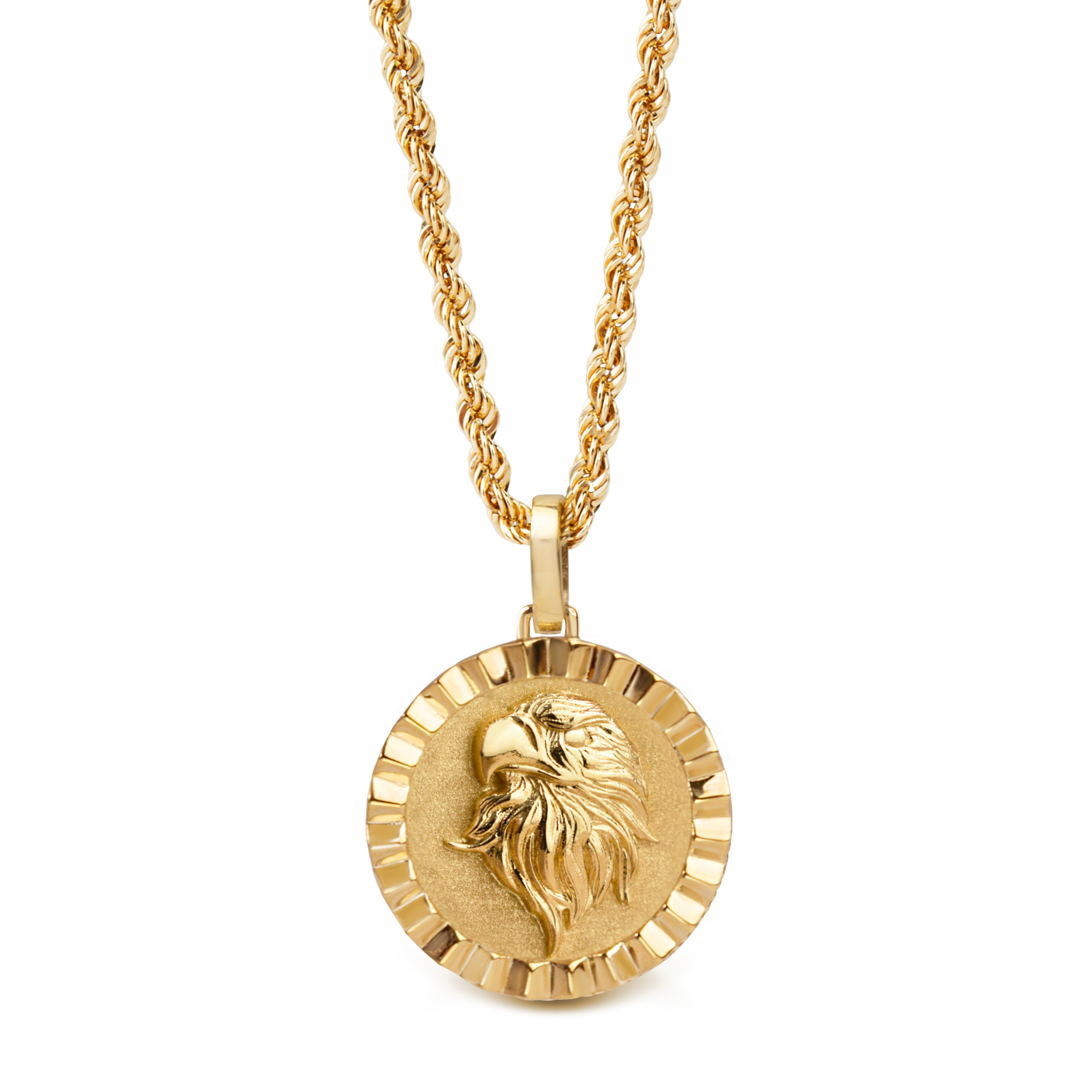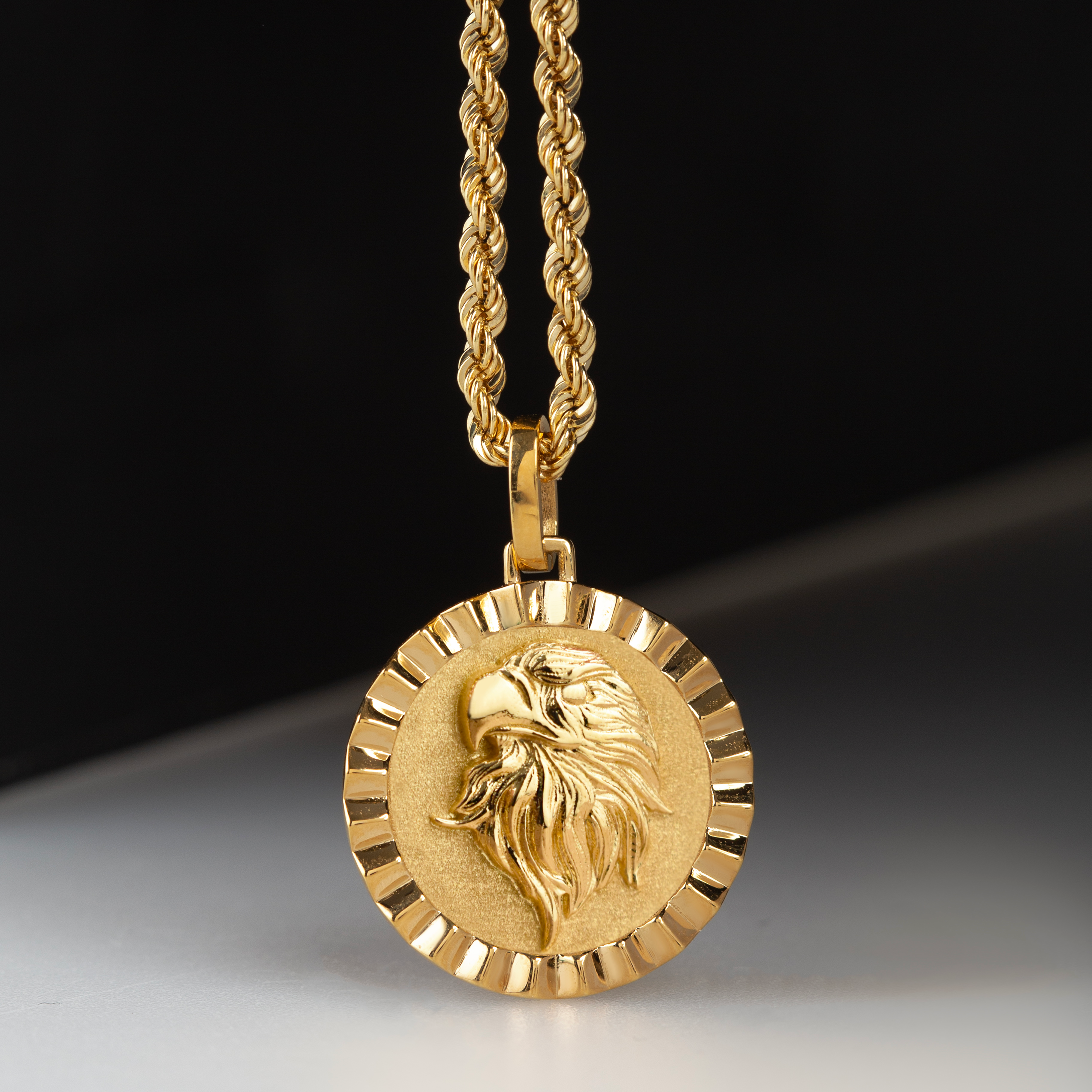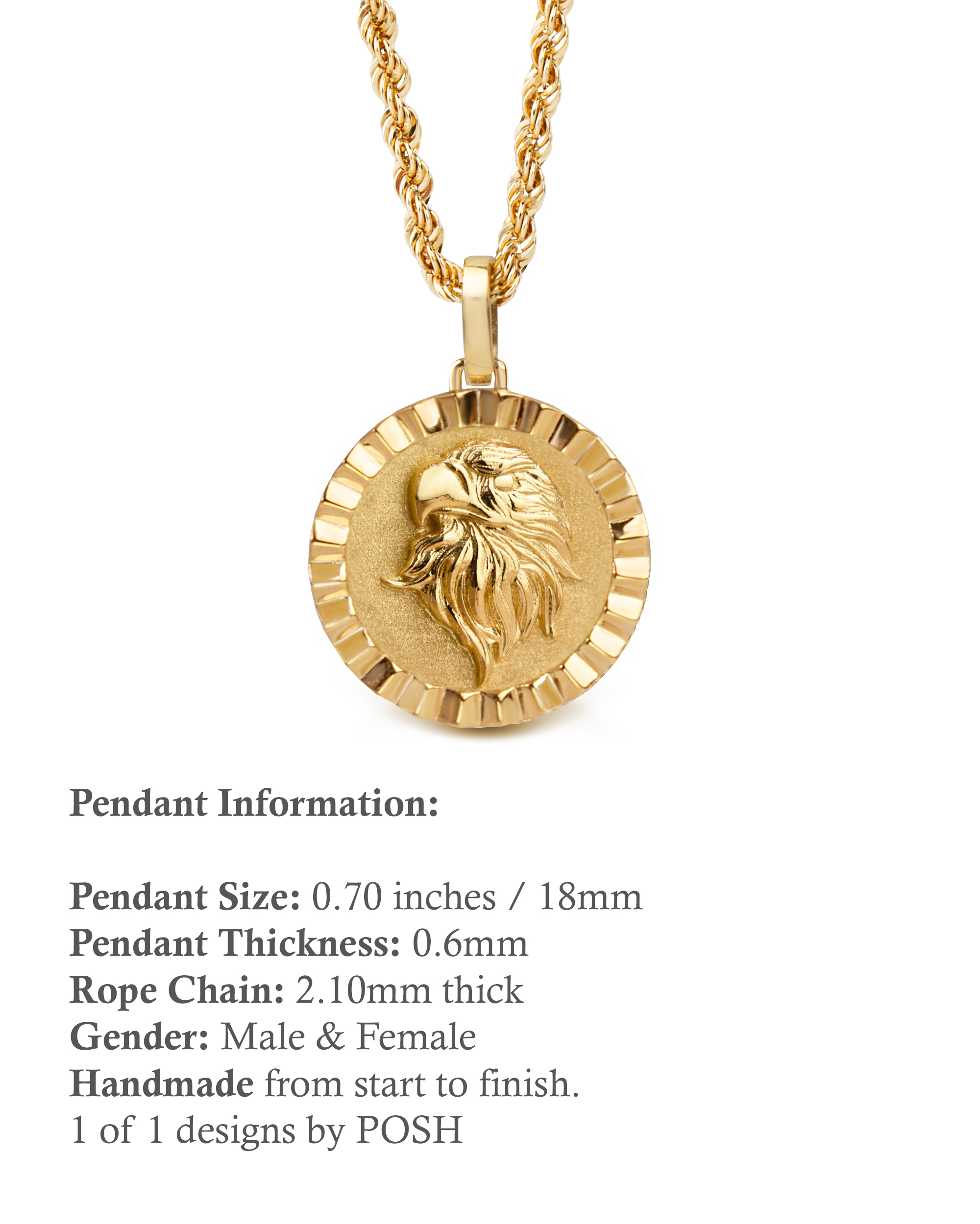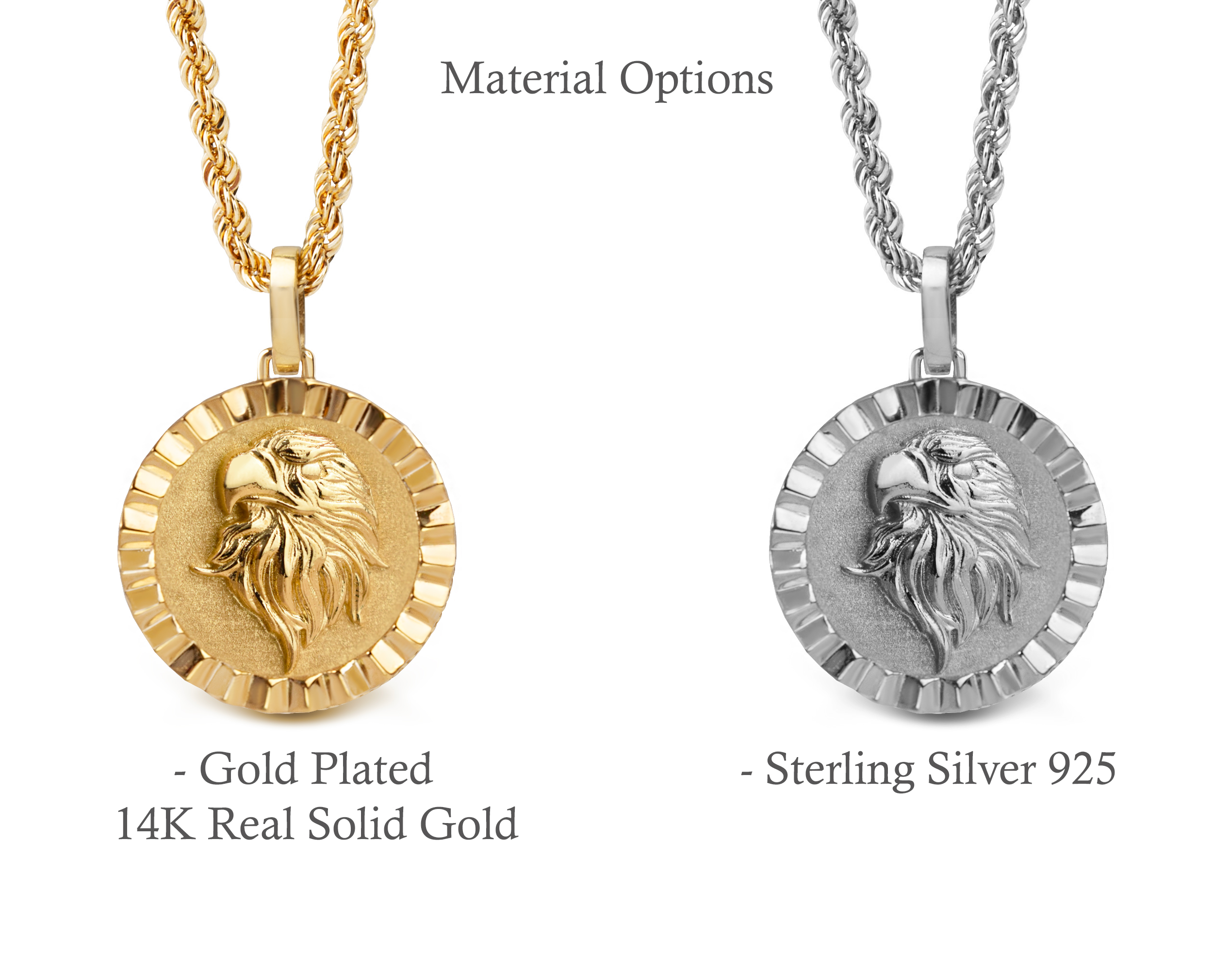 Our collection of round pendants with unique designs on top are made for both men and women. Our Eagle Head necklace can be personalized on the back with a custom message of your choice.