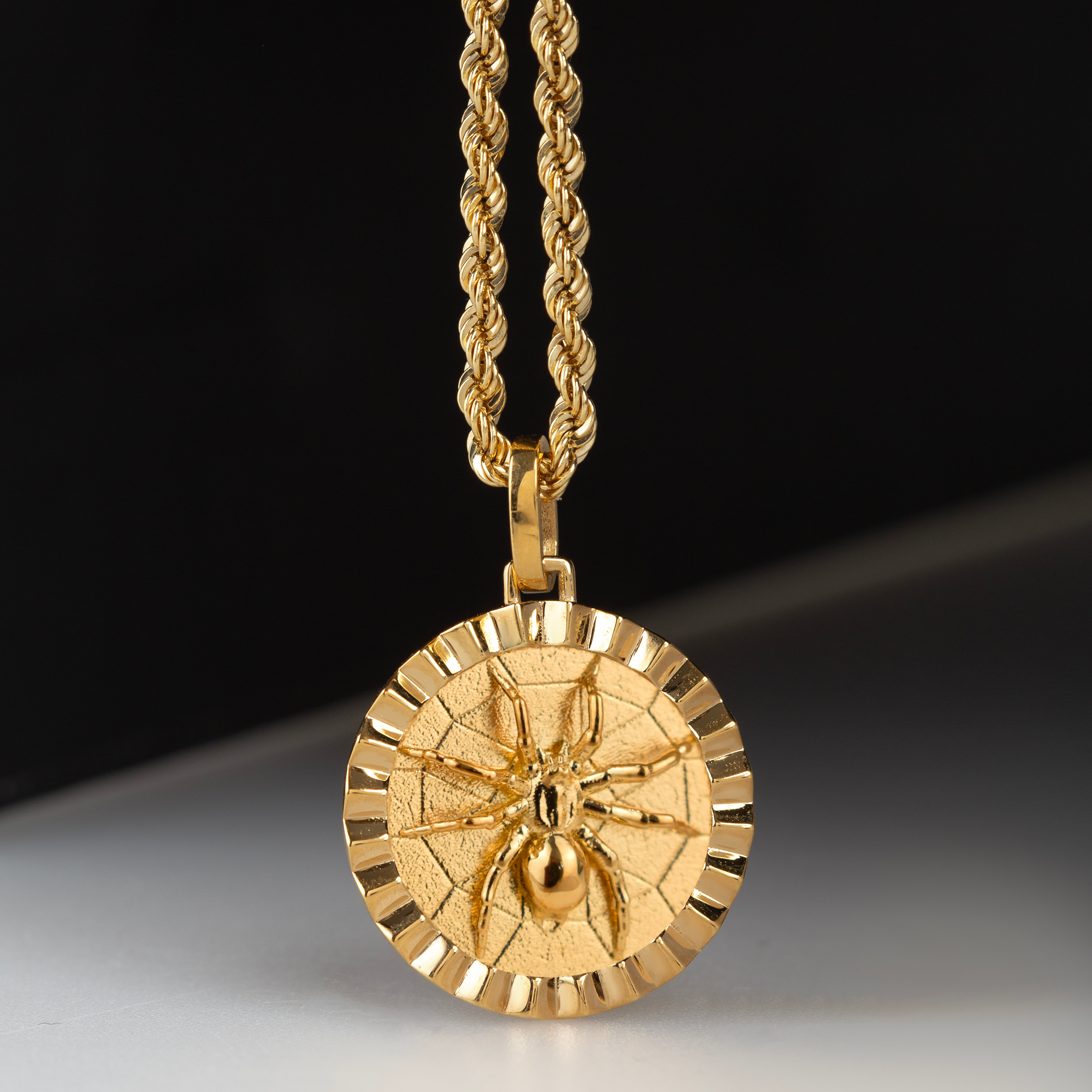 Our collection of round pendants with unique designs on top are made for both men and women. Our Spider necklace can be personalized on the back with a custom message of your choice.