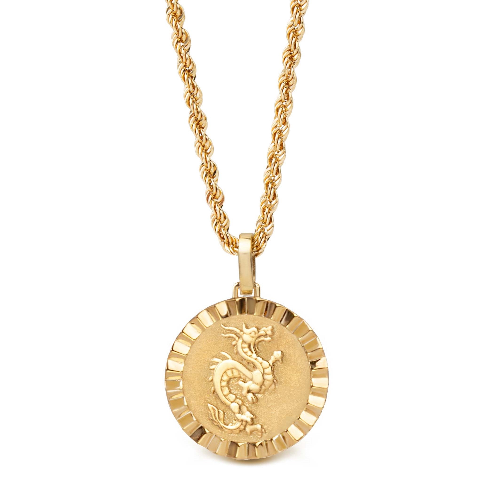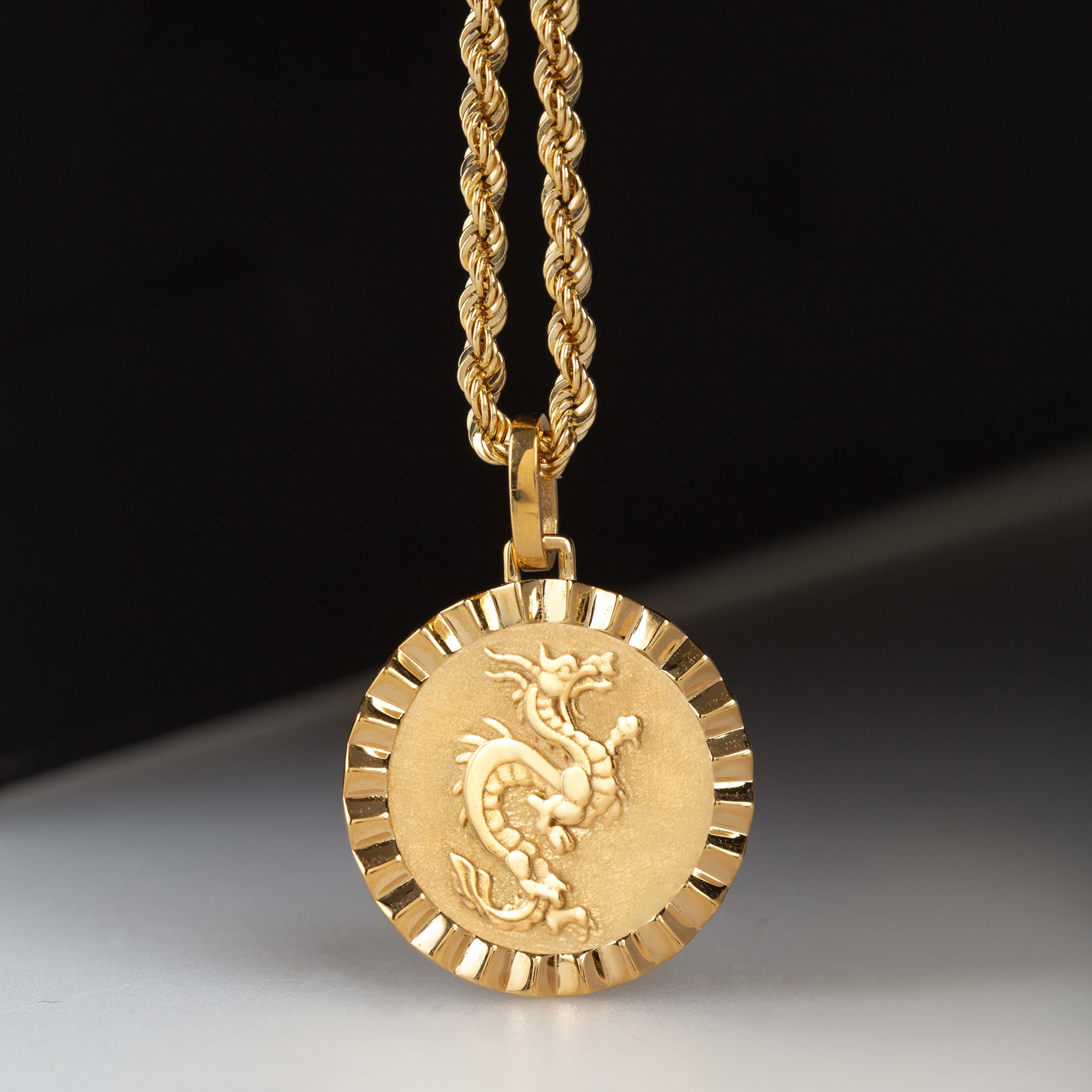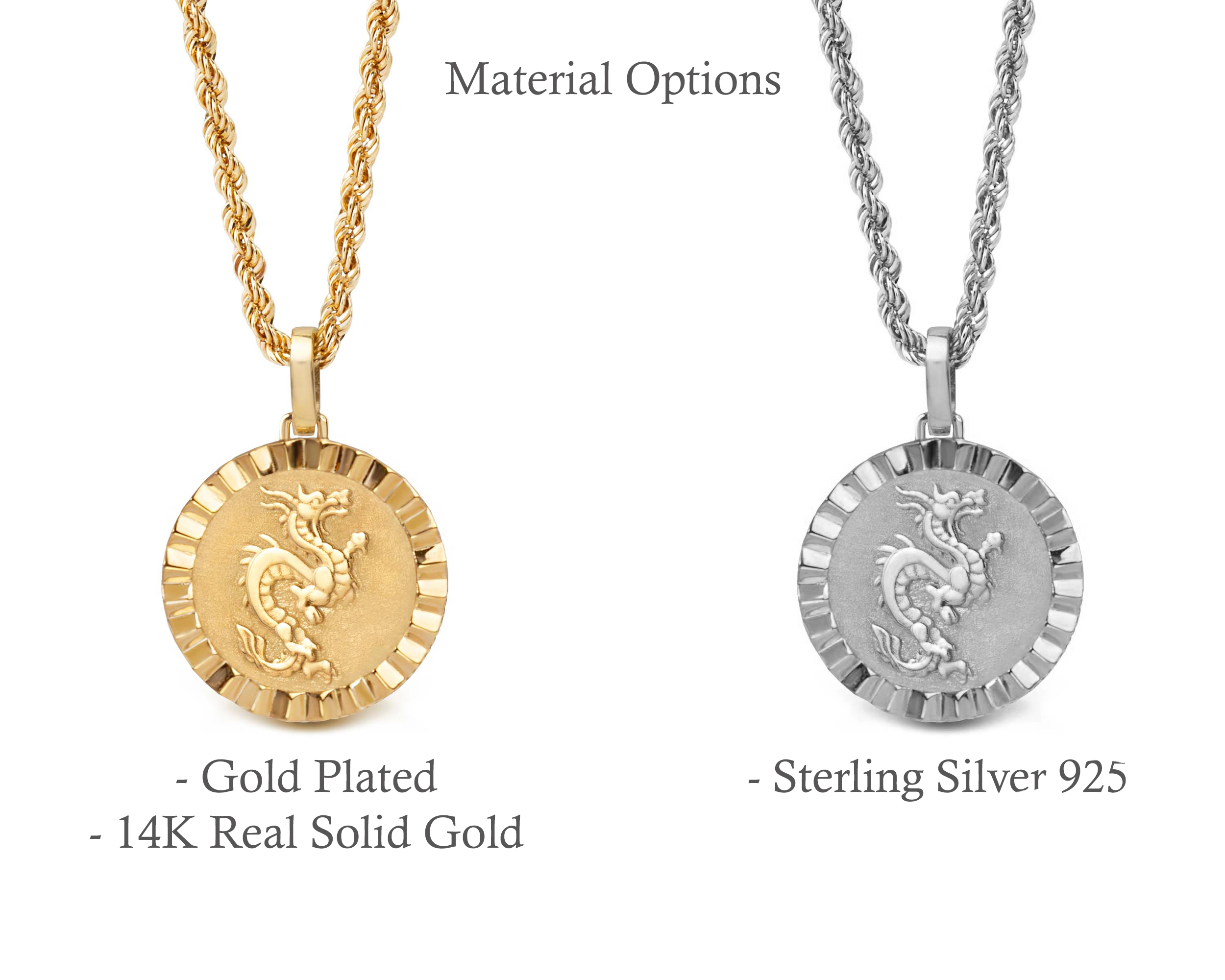 Our collection of round pendants with unique designs on top are made for both men and women. Our Dragon necklace can be personalized on the back with a custom message of your choice.