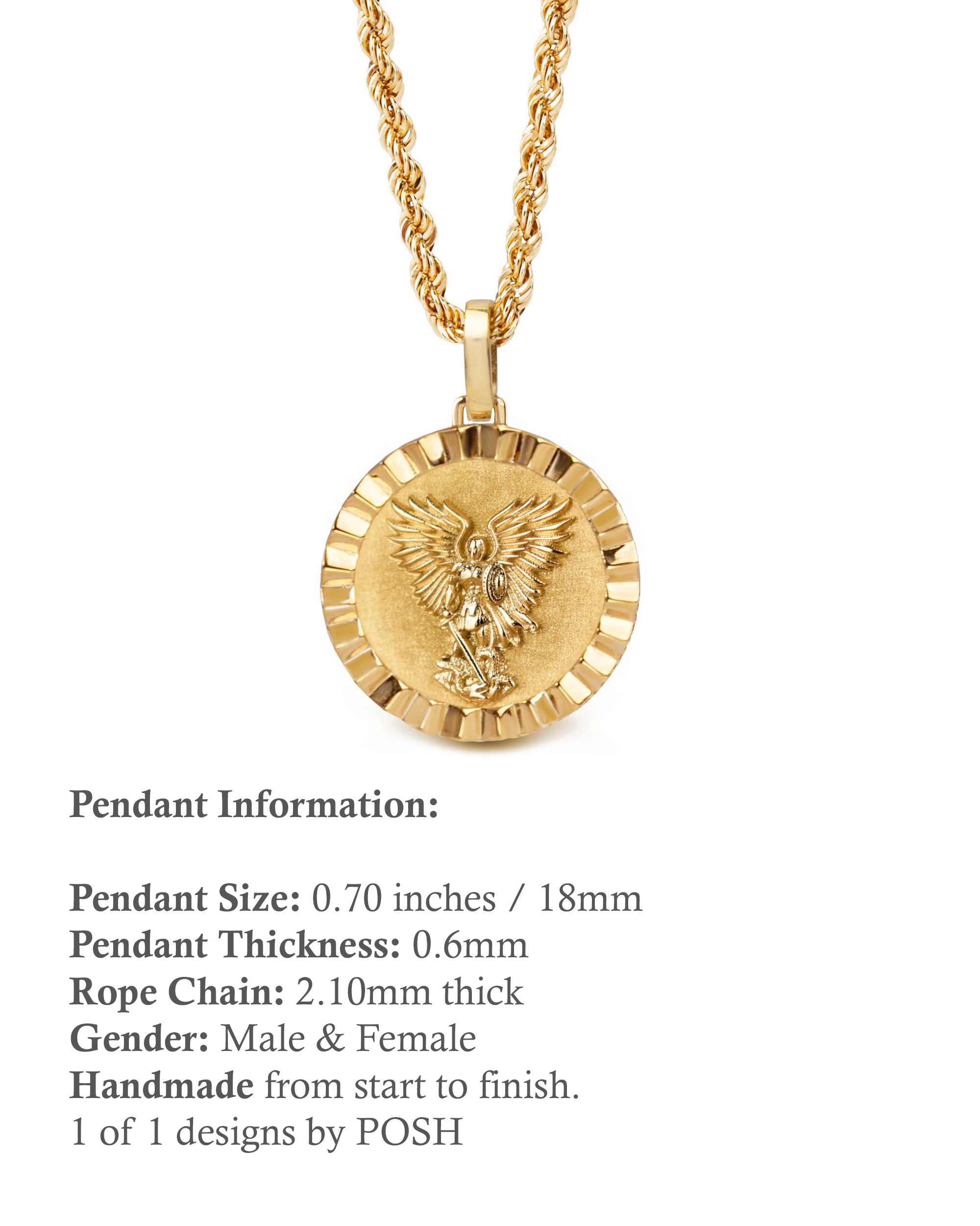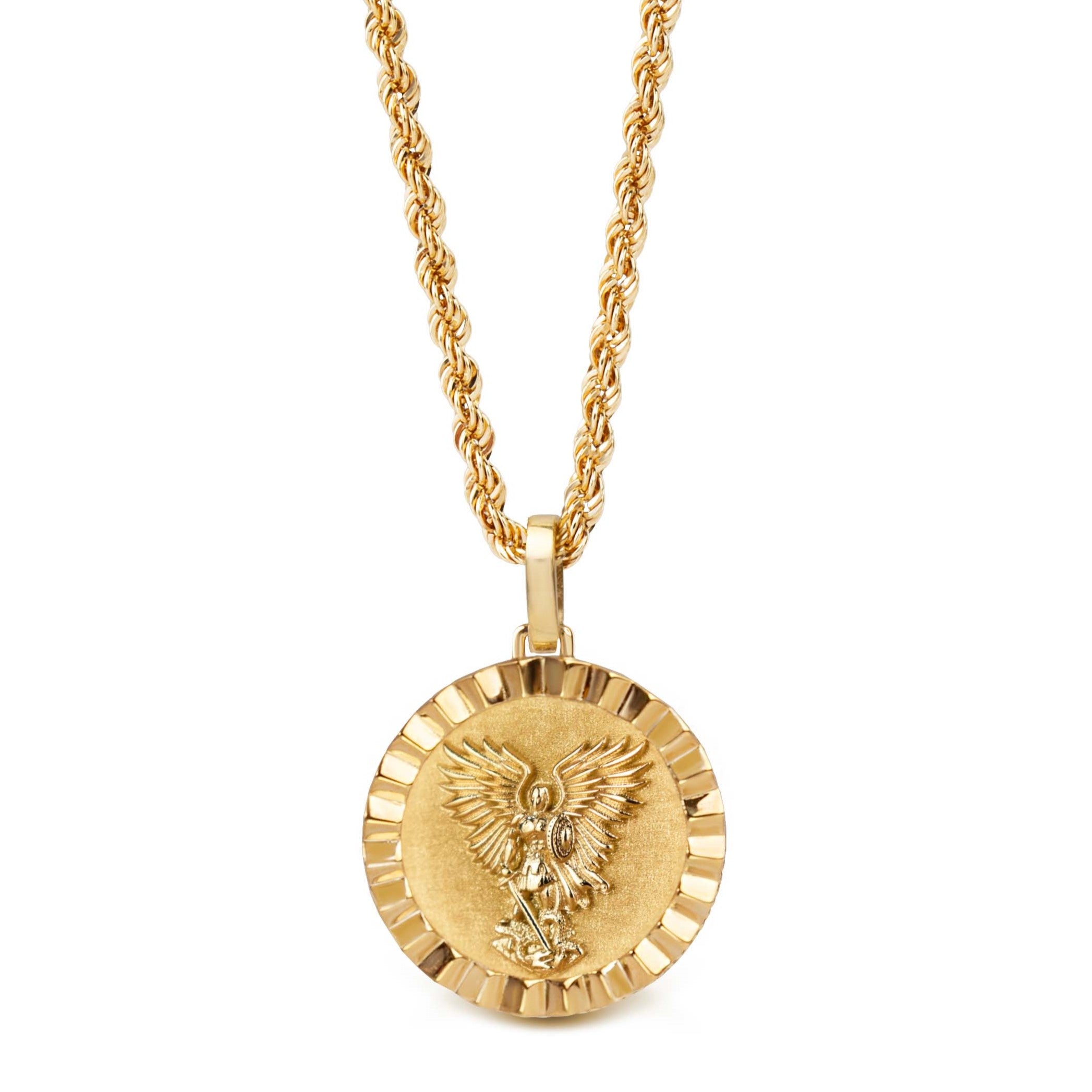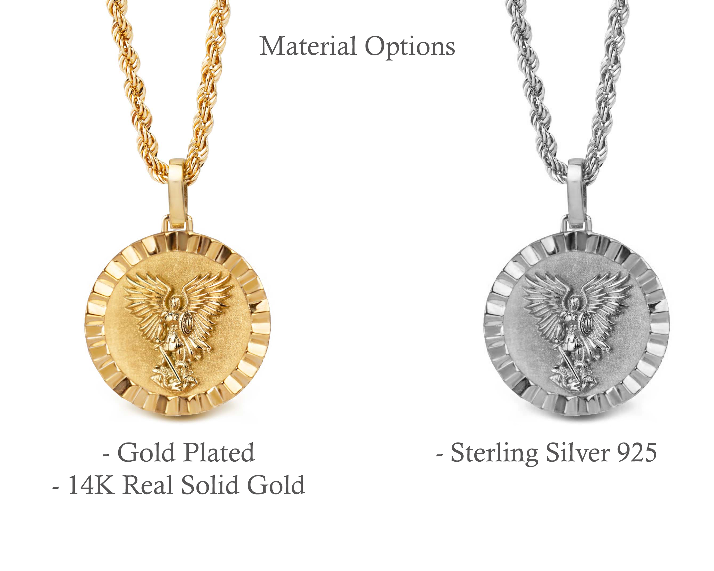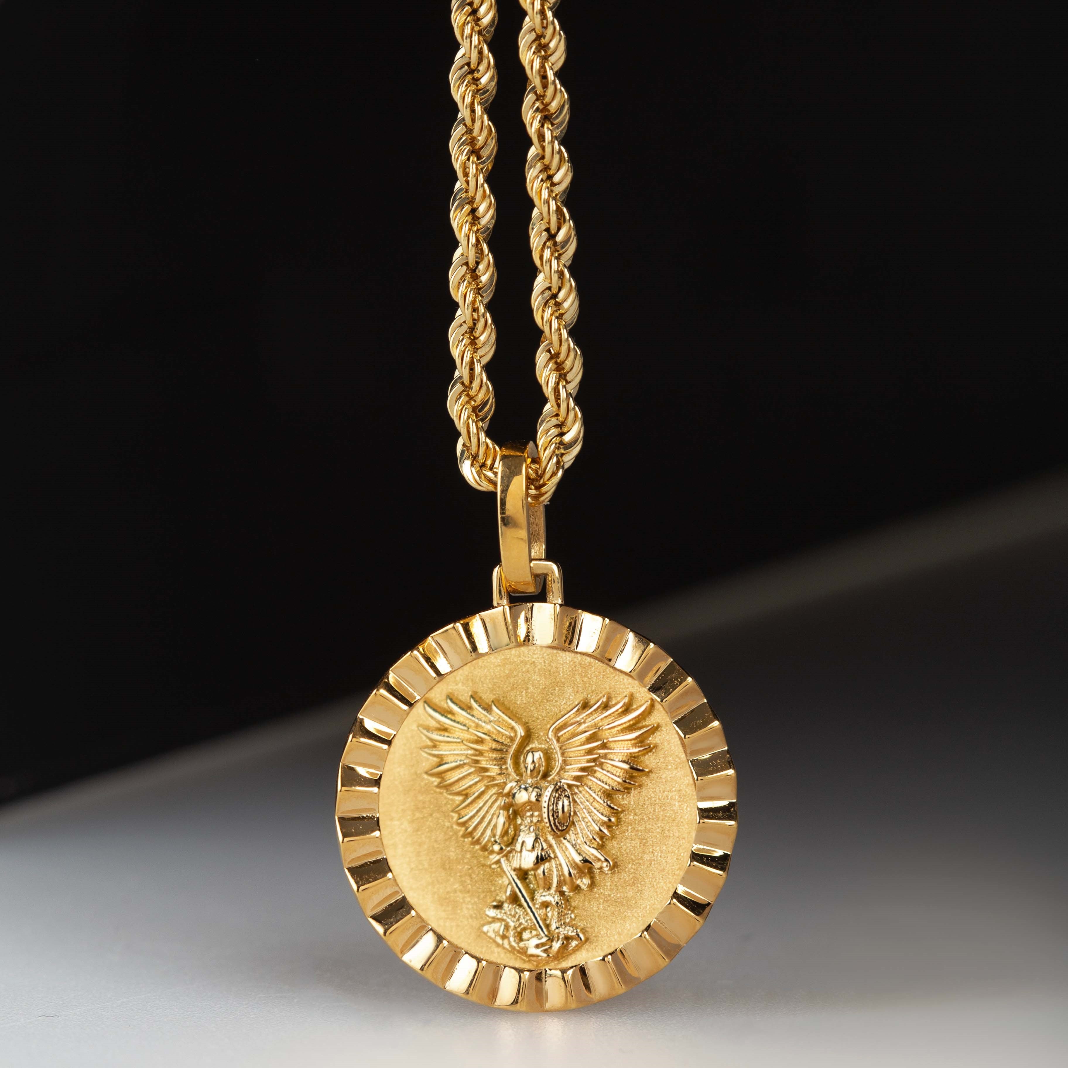 Our collection of round pendants with unique designs on top are made for both men and women. Our Saint Michael necklace can be personalized on the back with a custom message of your choice.