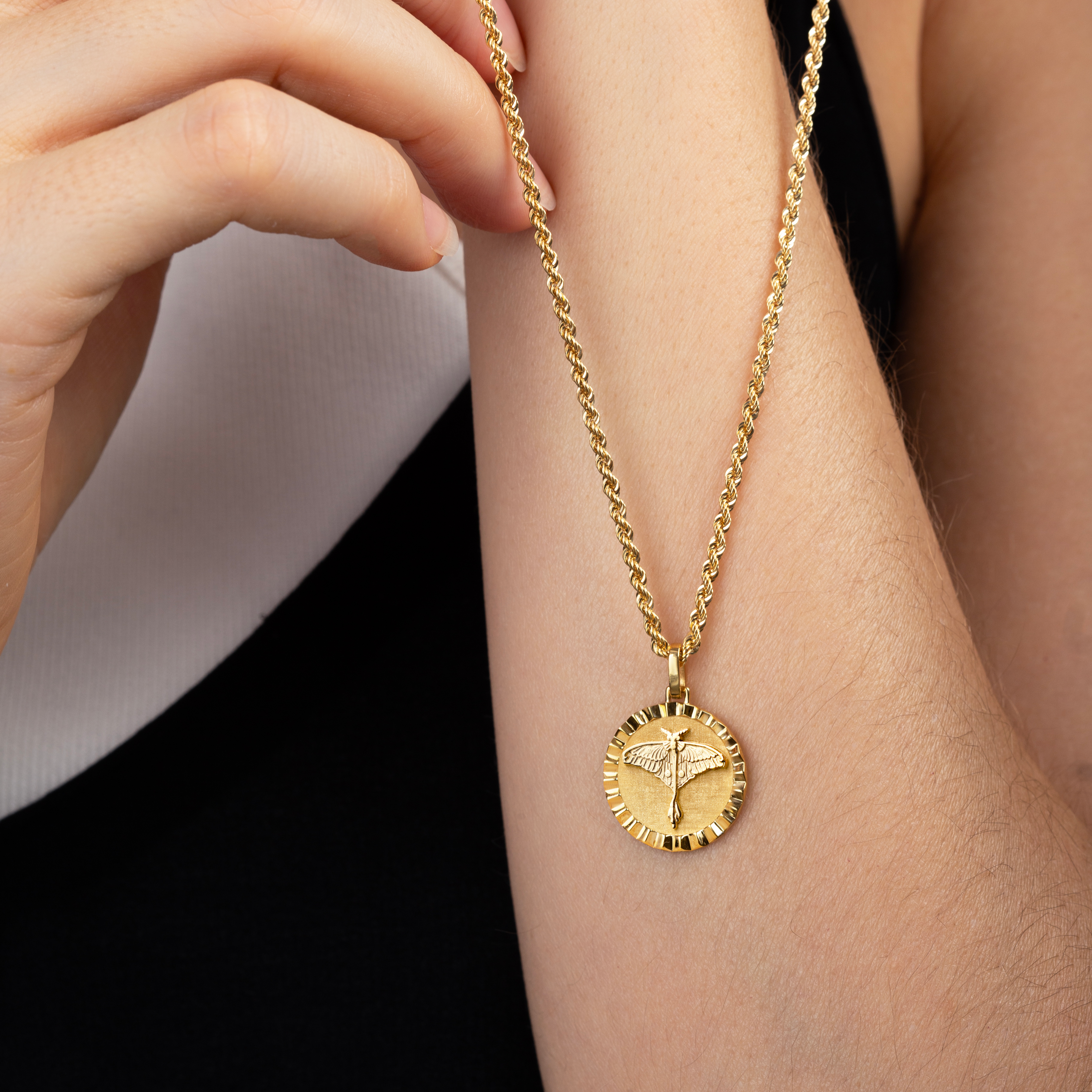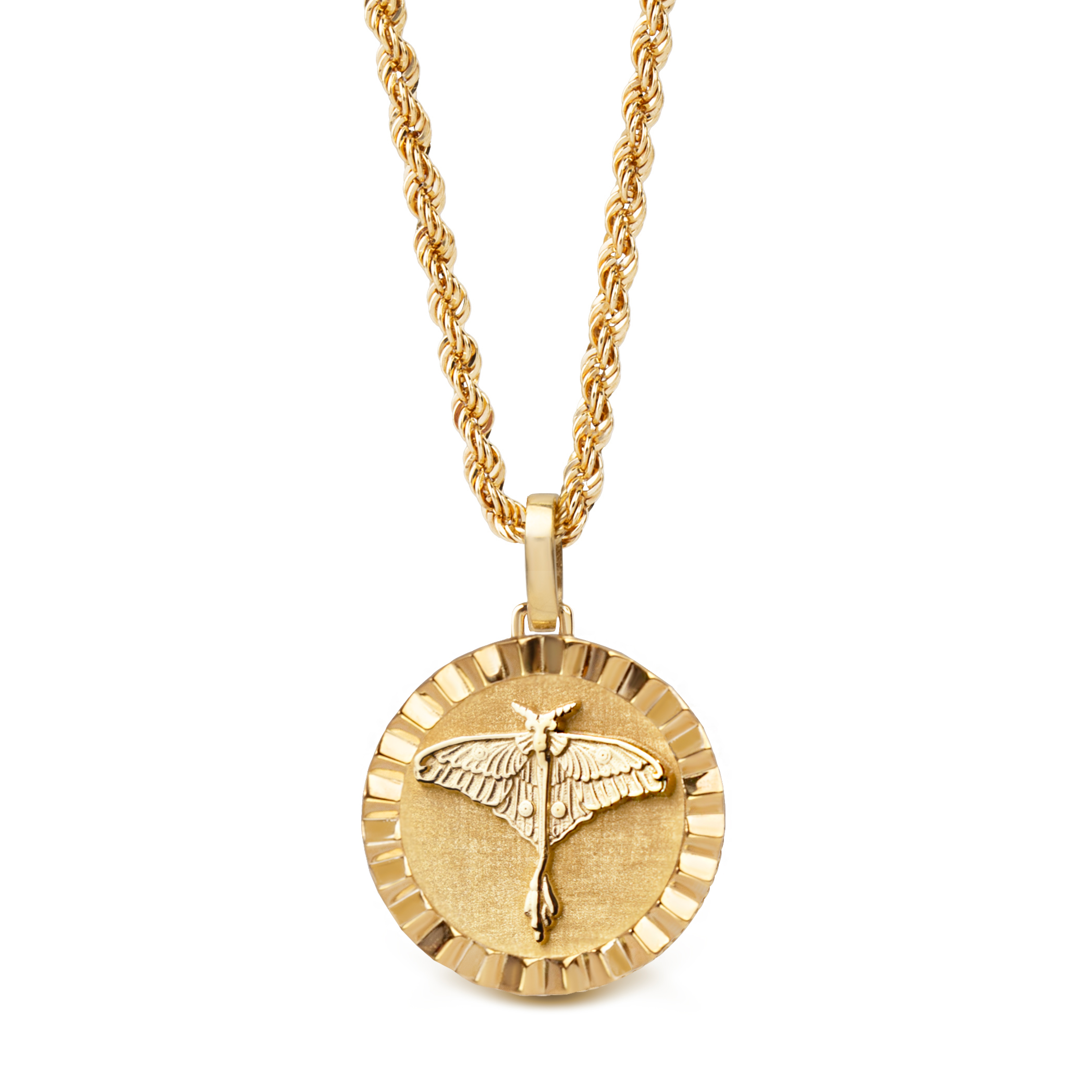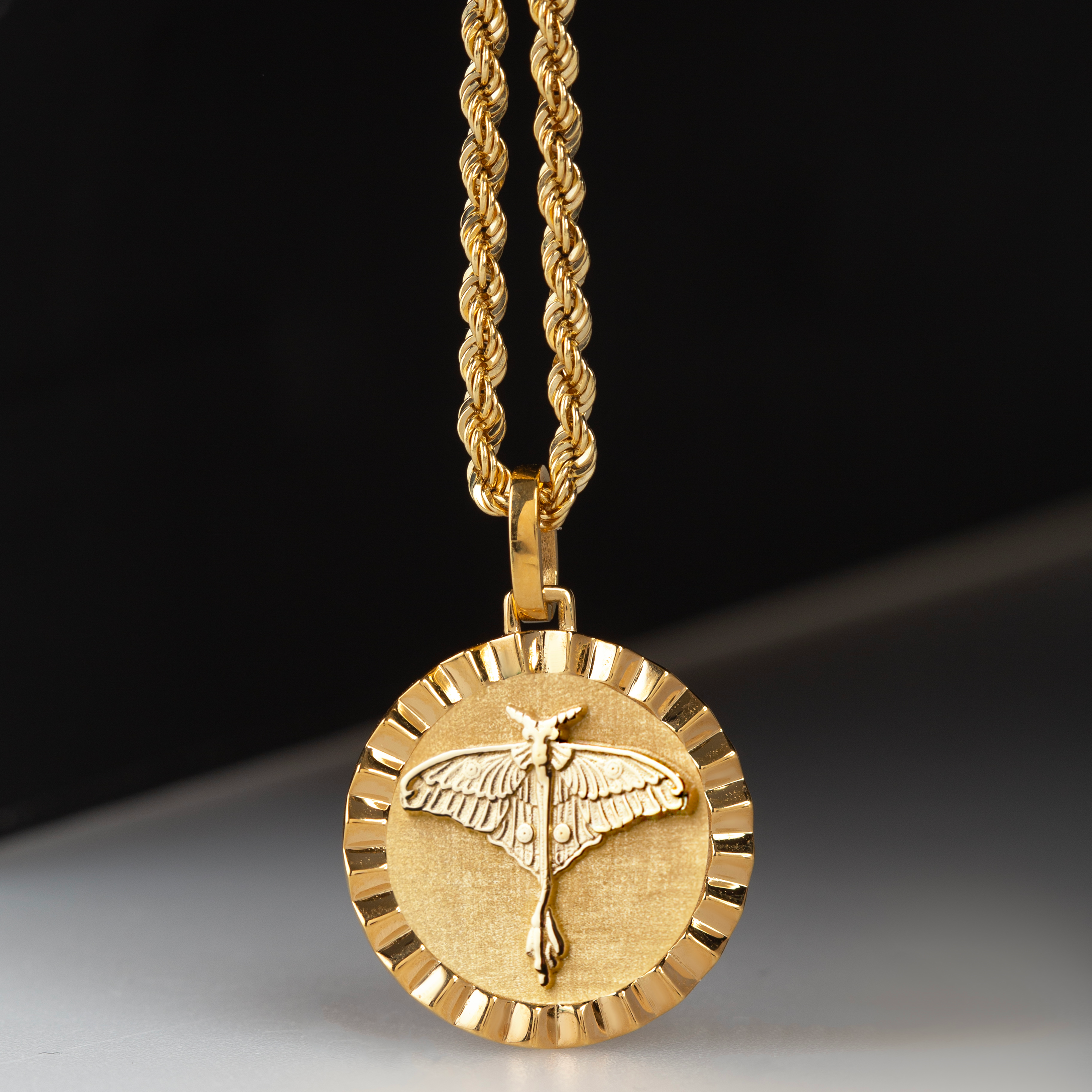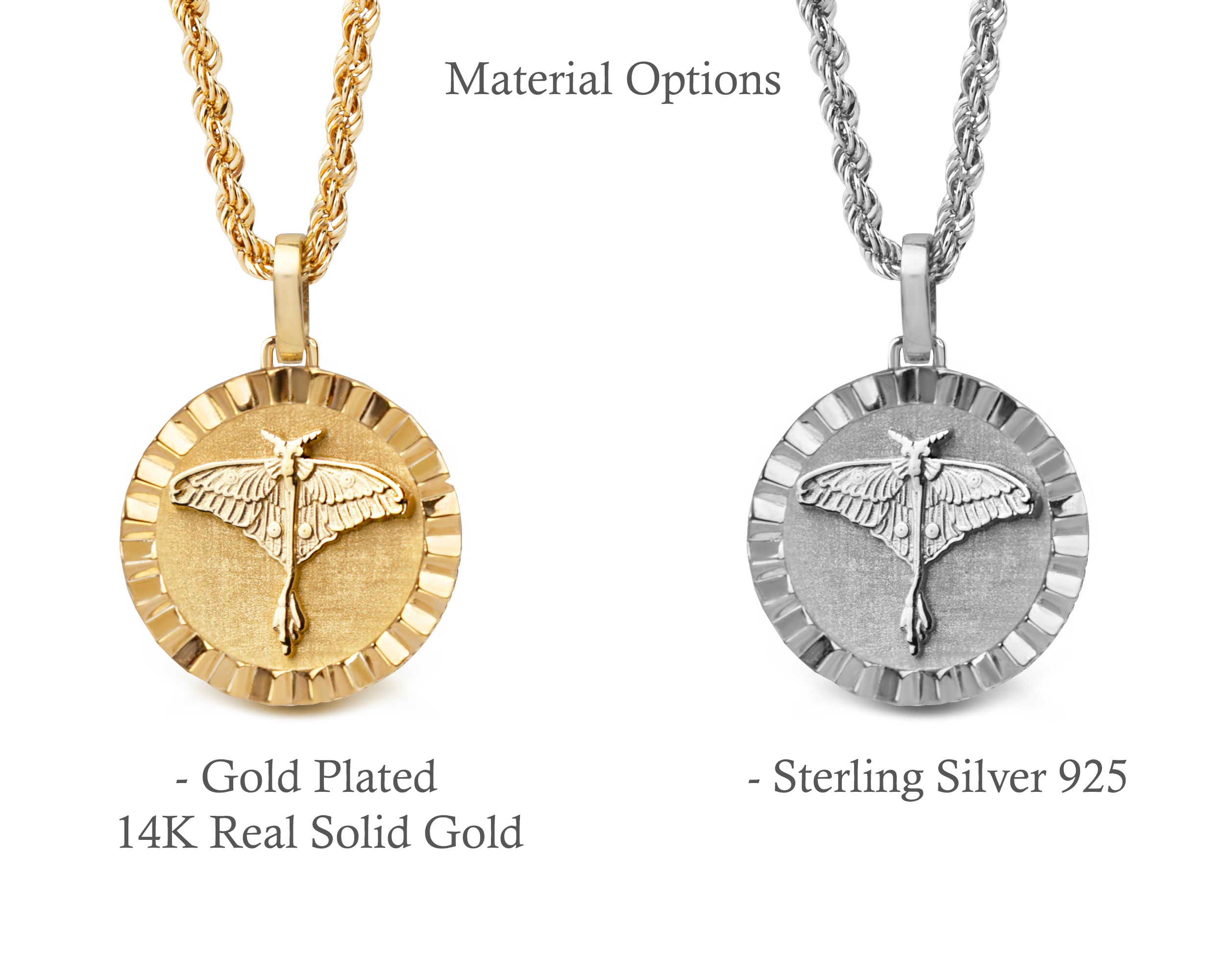 Our collection of round pendants with unique designs on top are made for both men and women. Our Moth necklace can be personalized on the back with a custom message of your choice.