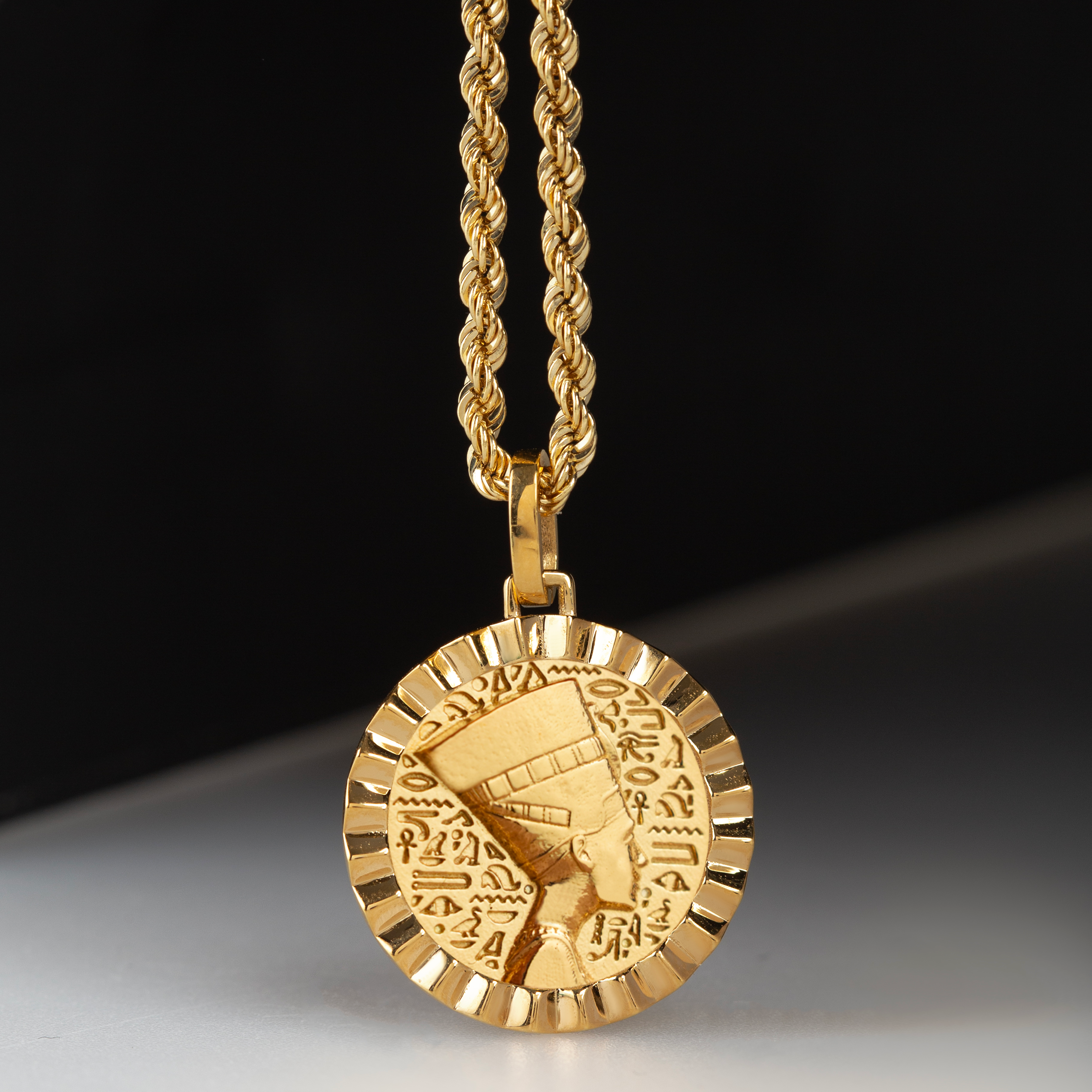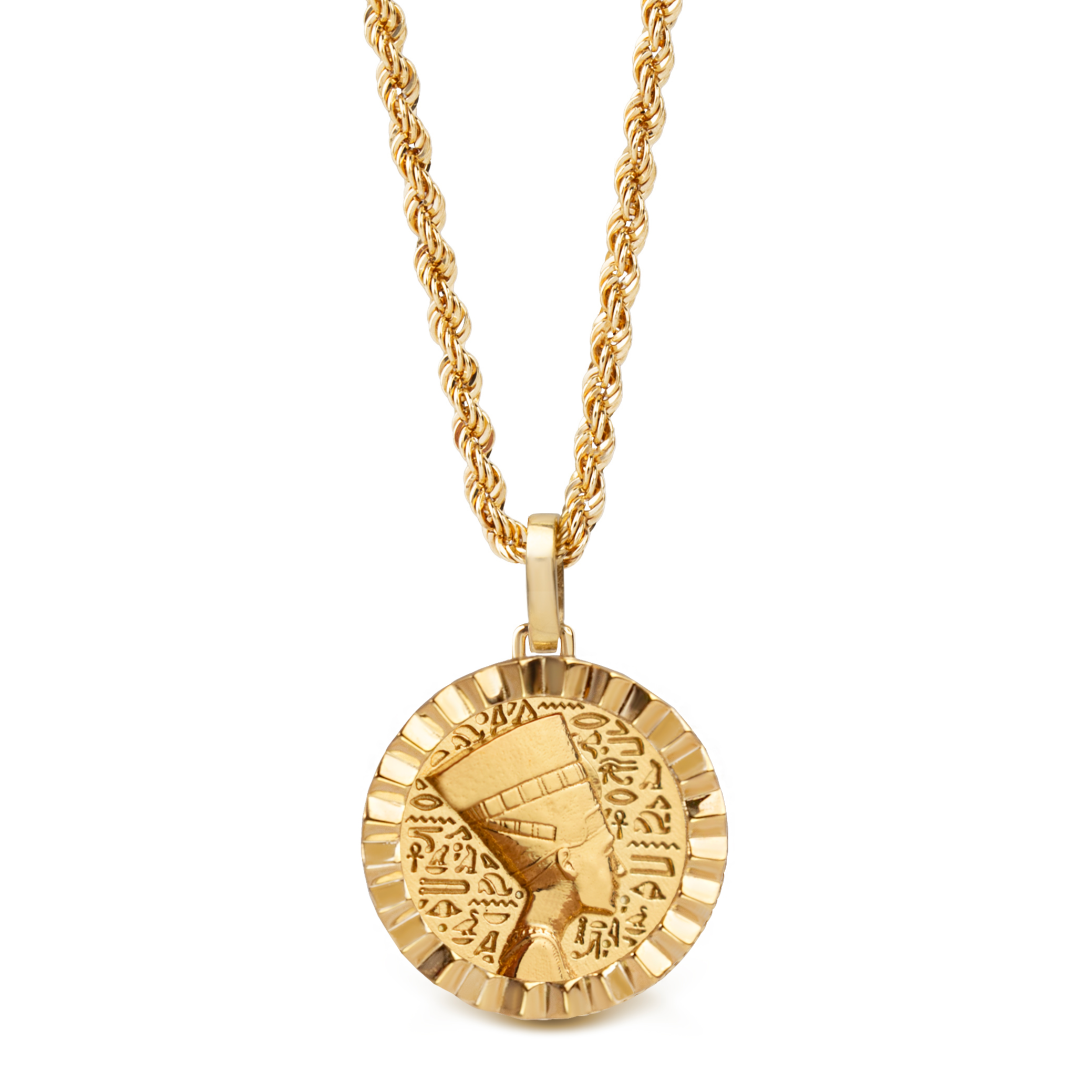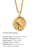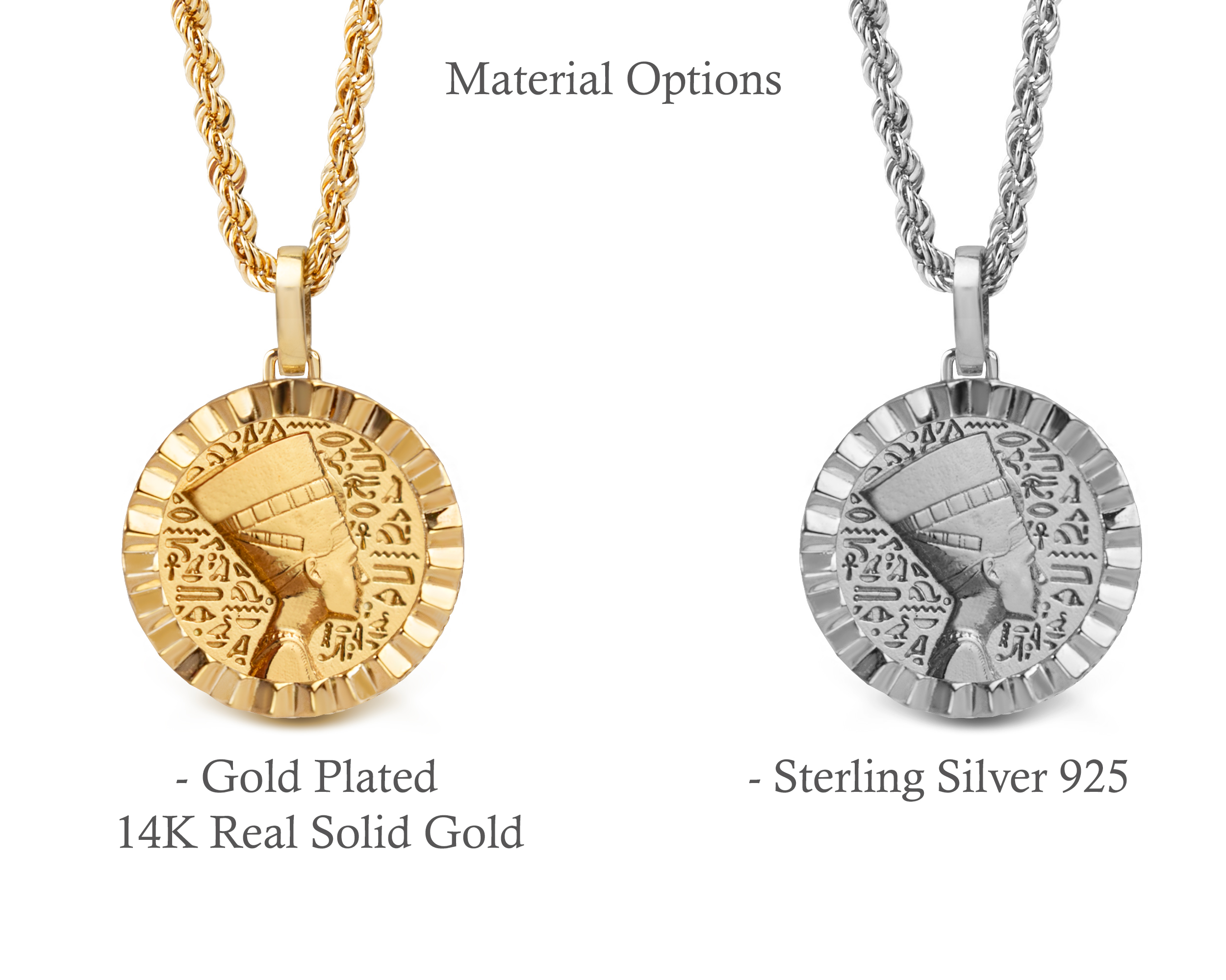 Our collection of round pendants with unique designs on top are made for both men and women. Our Nefertiti necklace can be personalized on the back with a custom message of your choice.