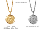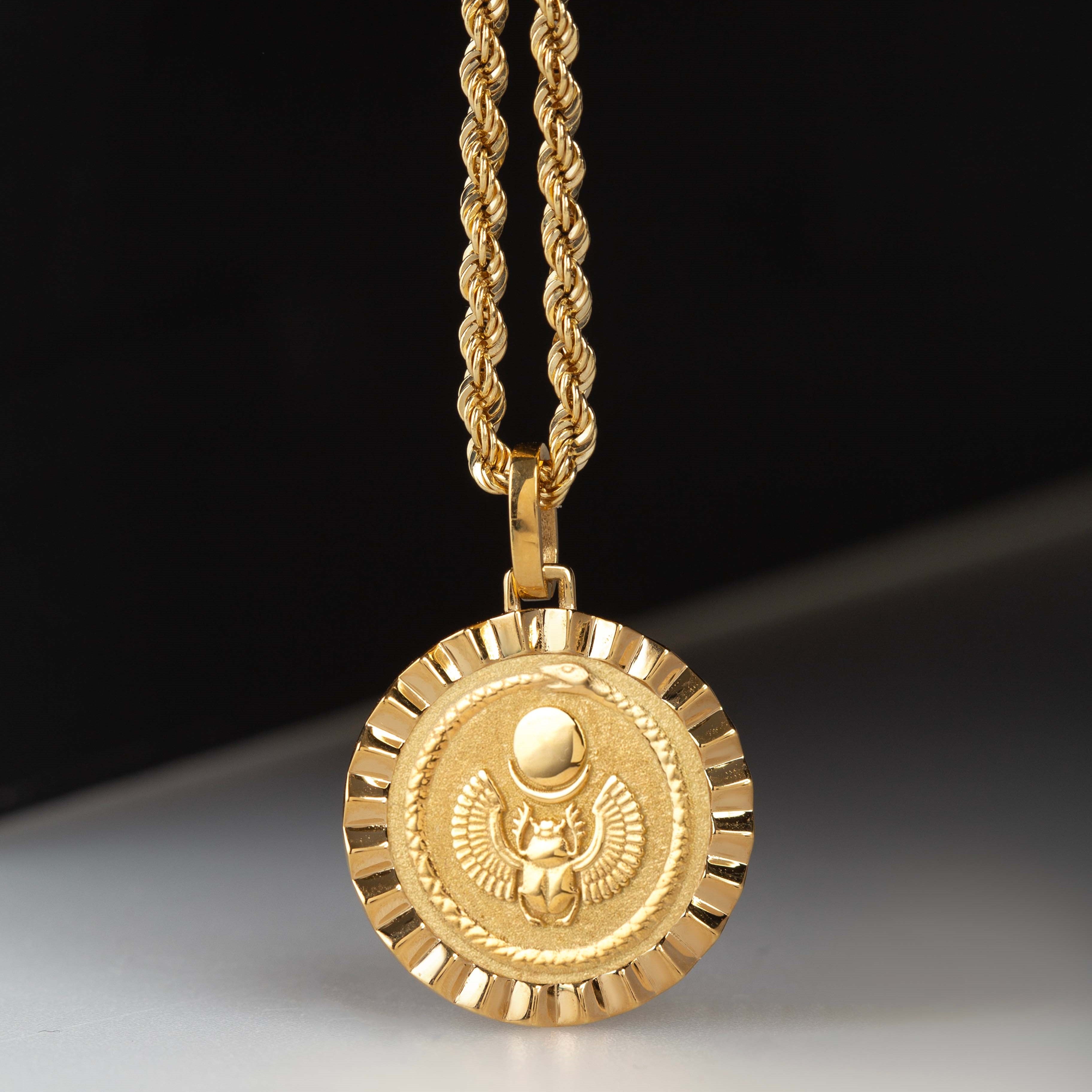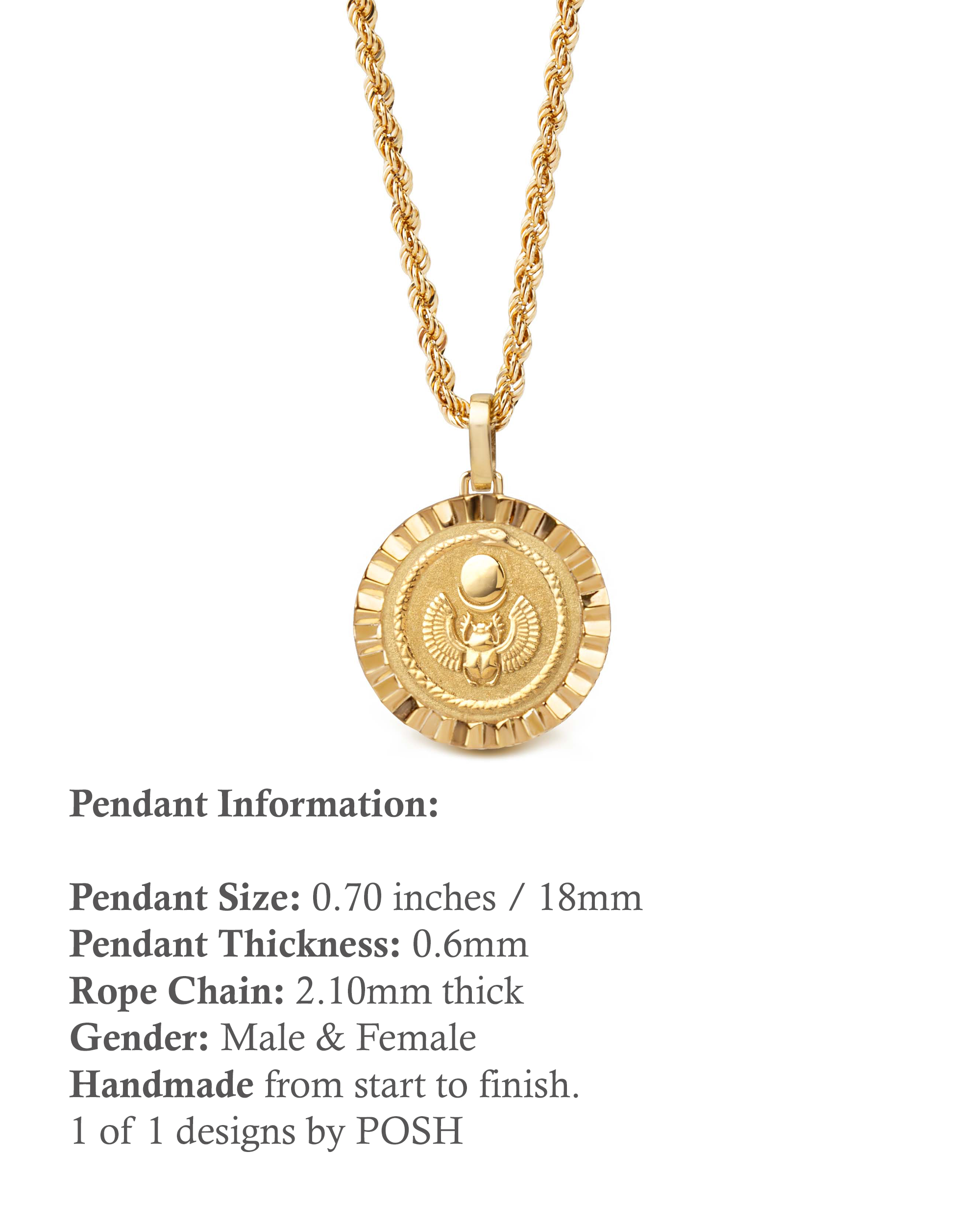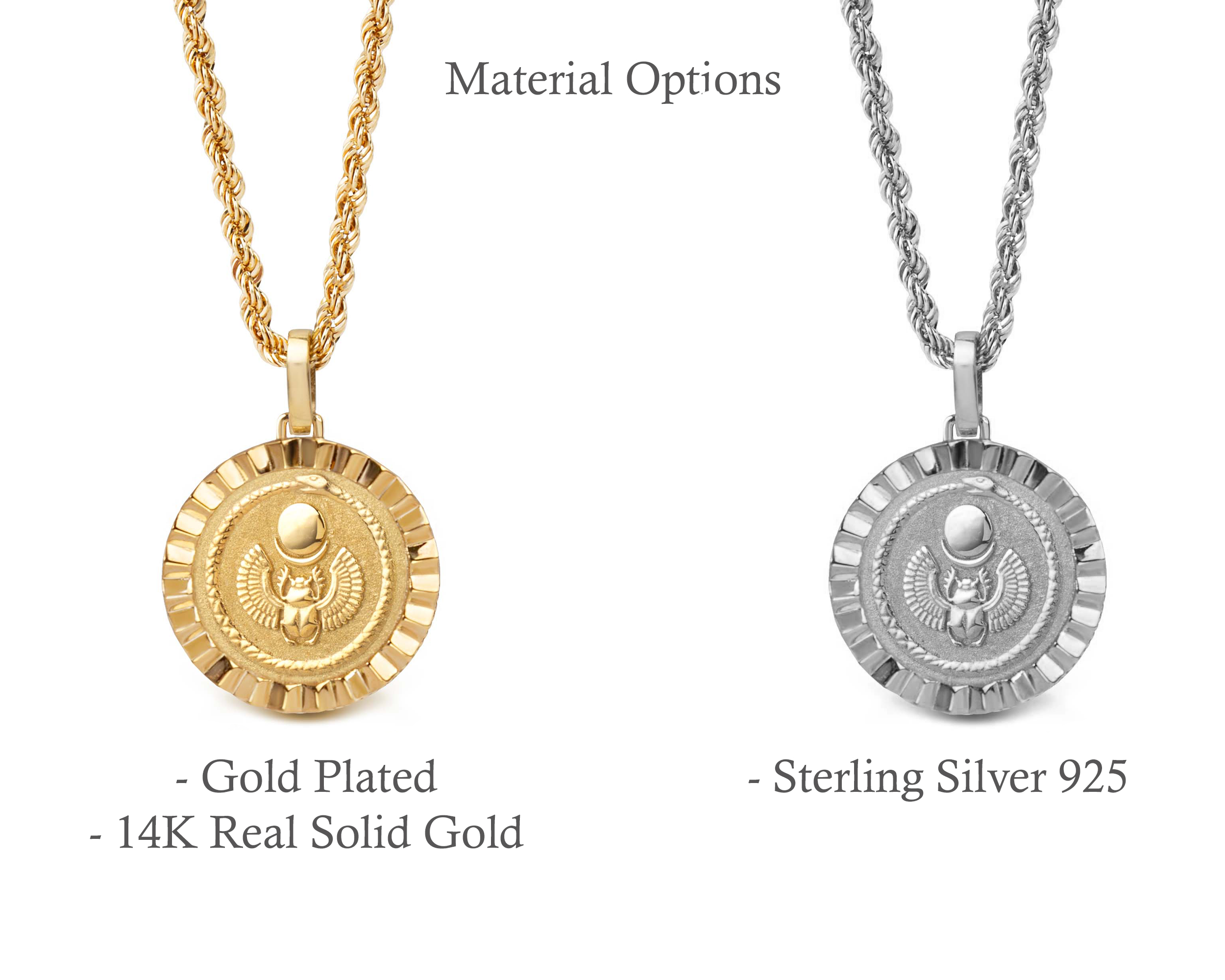 Our collection of round pendants with unique designs on top are made for both men and women. Our Scarab necklace can be personalized on the back with a custom message of your choice.
