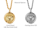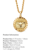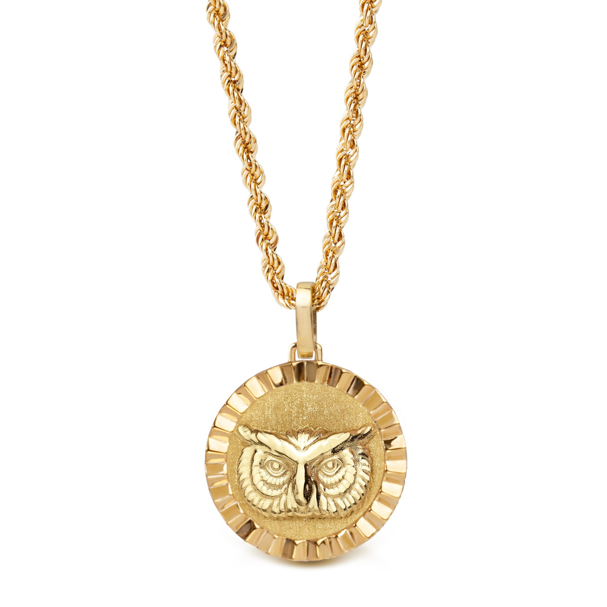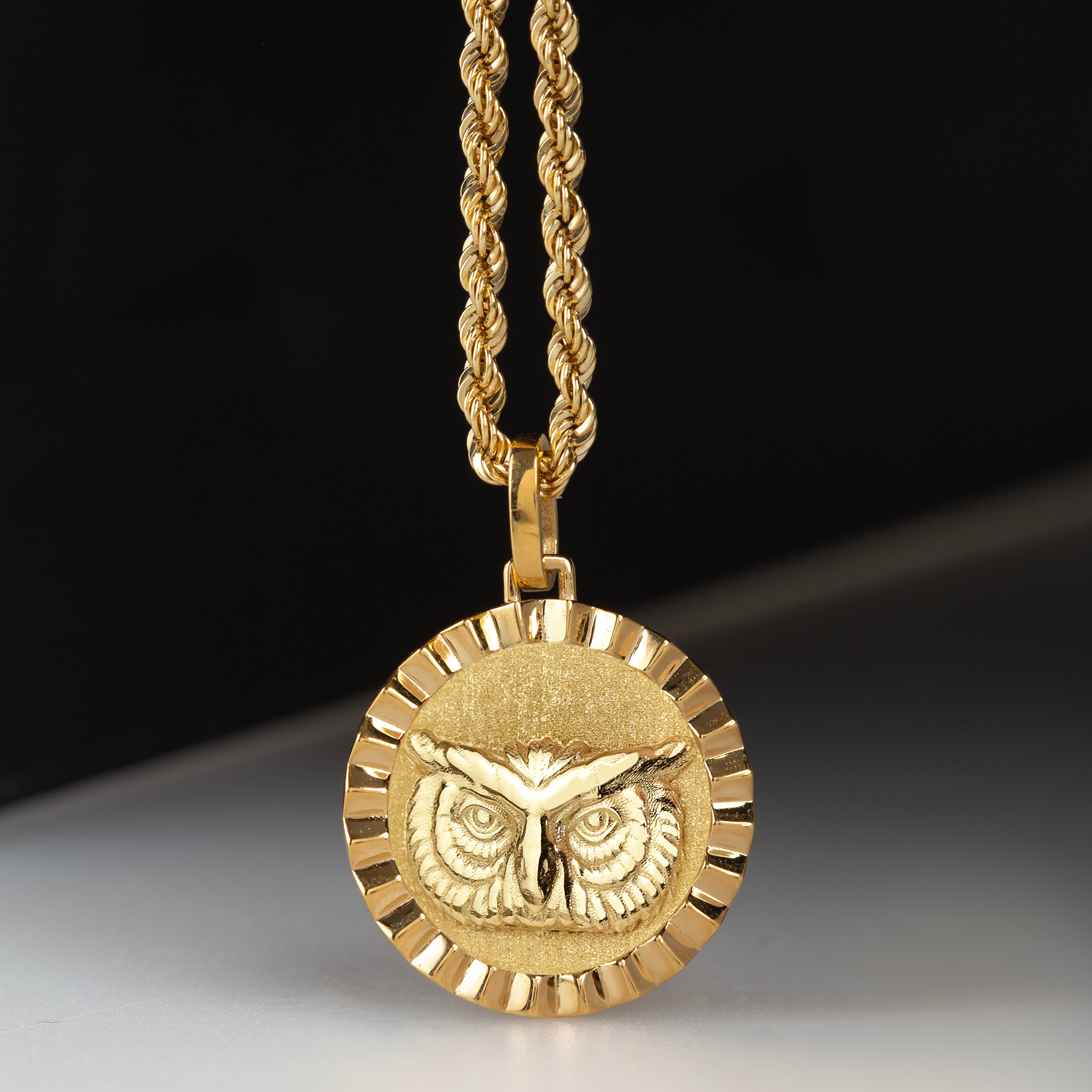 Our collection of round pendants with unique designs on top are made for both men and women. Our Owl necklace can be personalized on the back with a custom message of your choice.