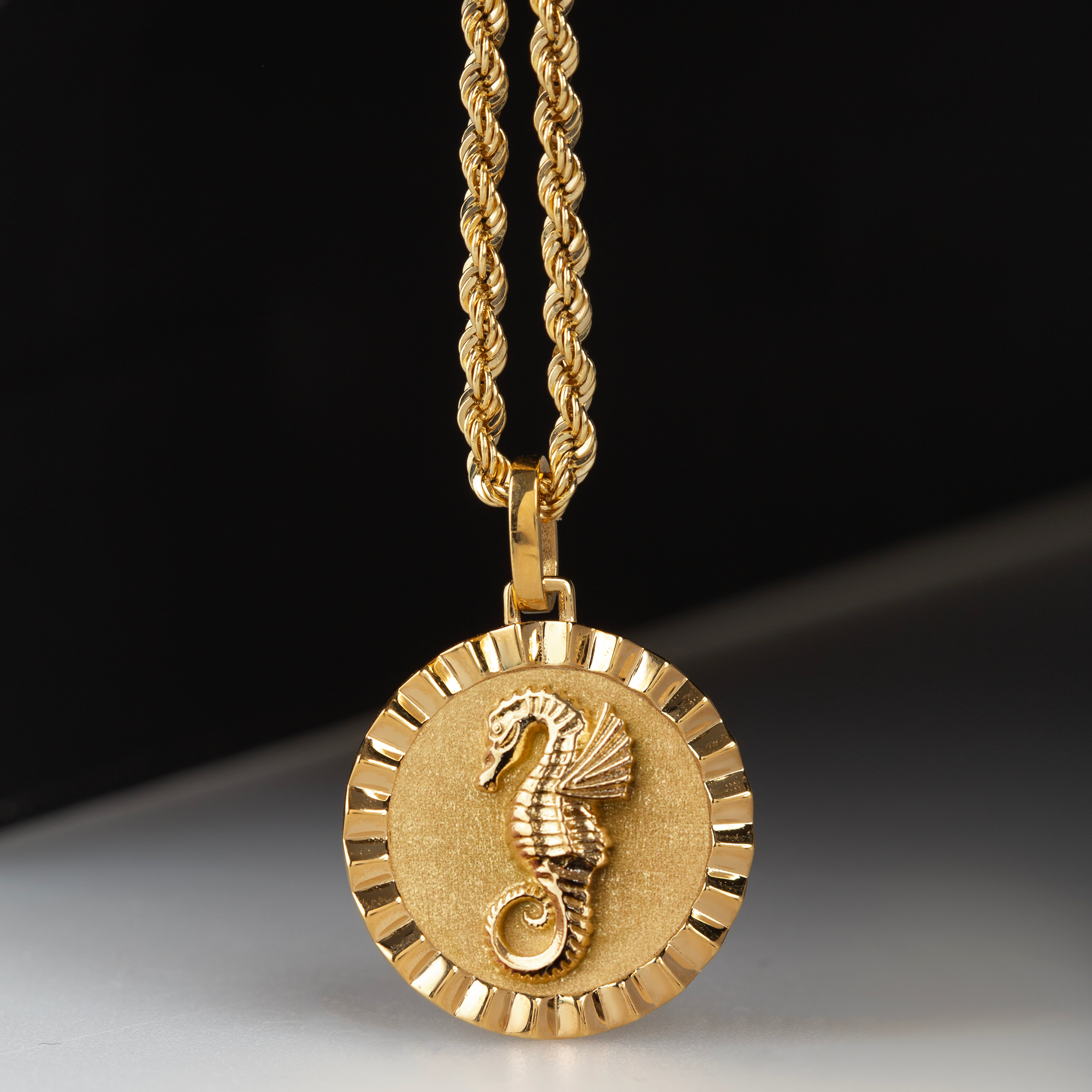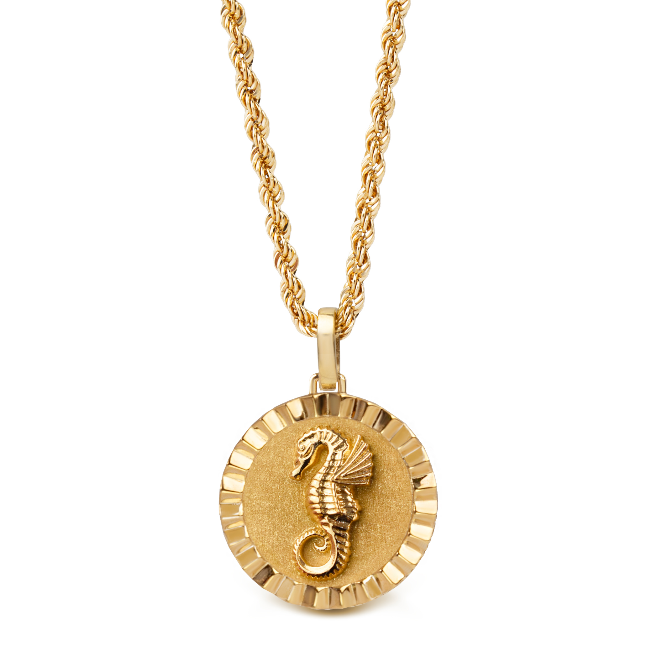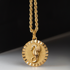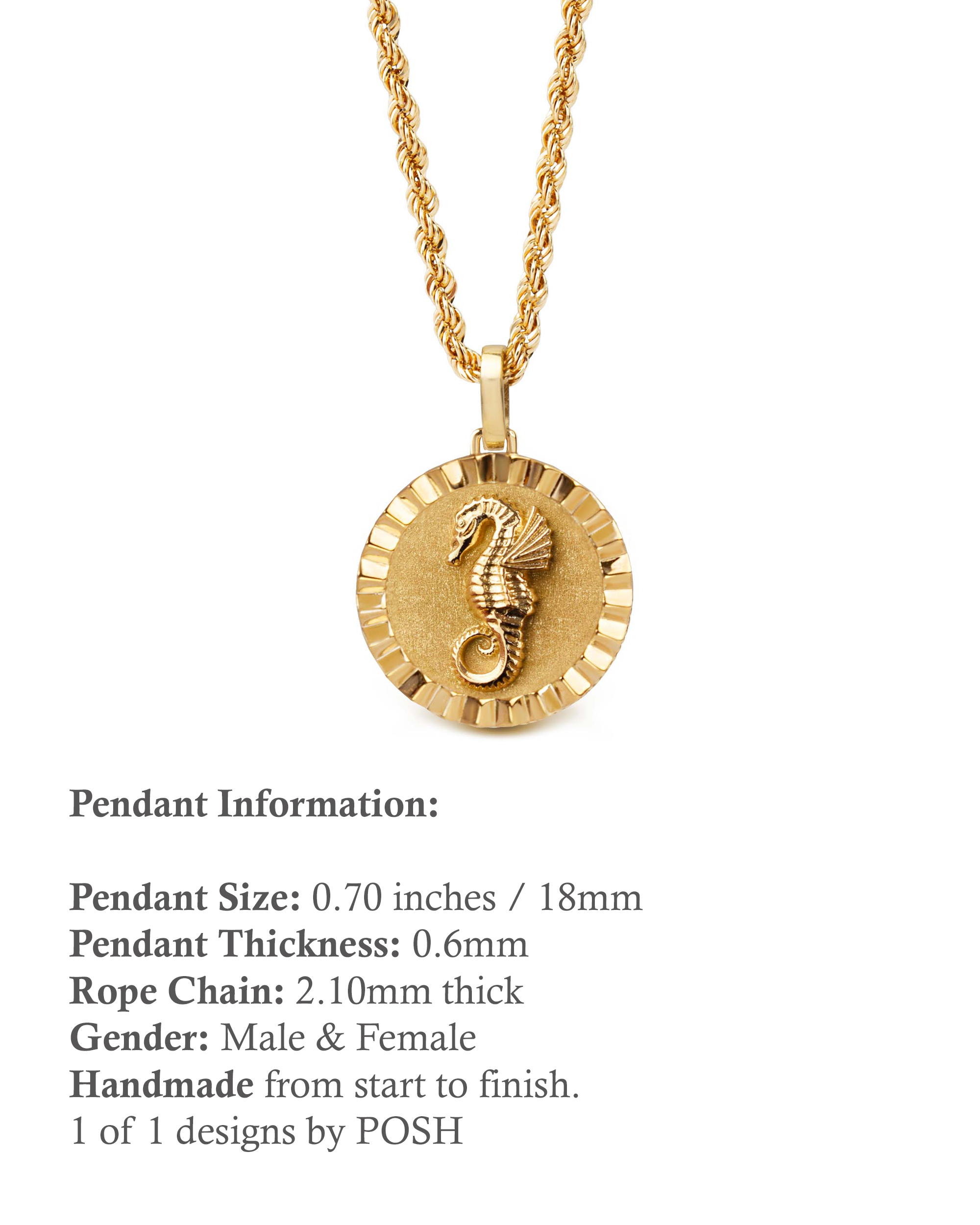 Our collection of round pendants with unique designs on top are made for both men and women. Our Seahorse necklace can be personalized on the back with a custom message of your choice.