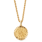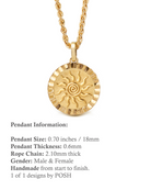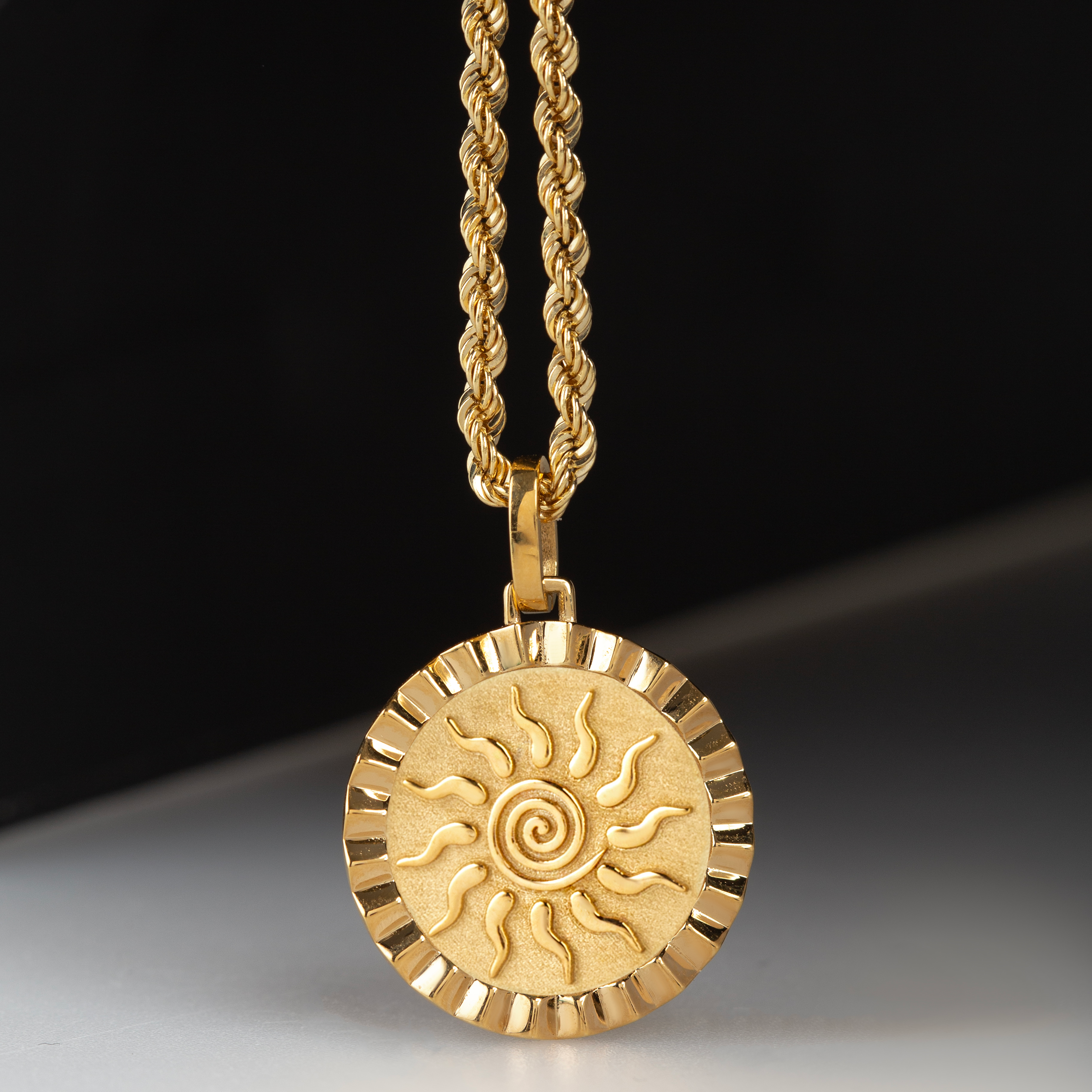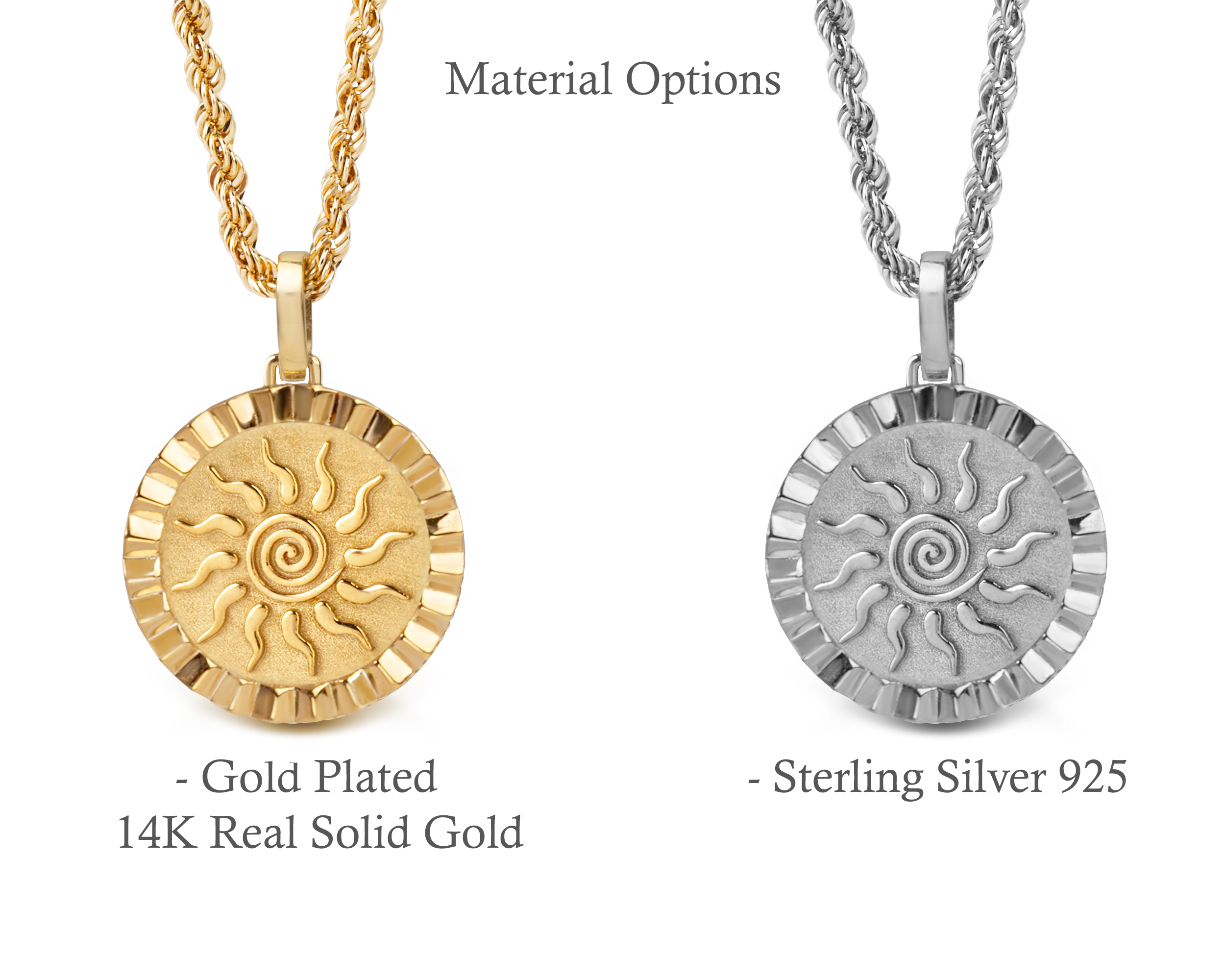 Our collection of round pendants with unique designs on top are made for both men and women. Our Spiral Sun necklace can be personalized on the back with a custom message of your choice.