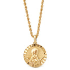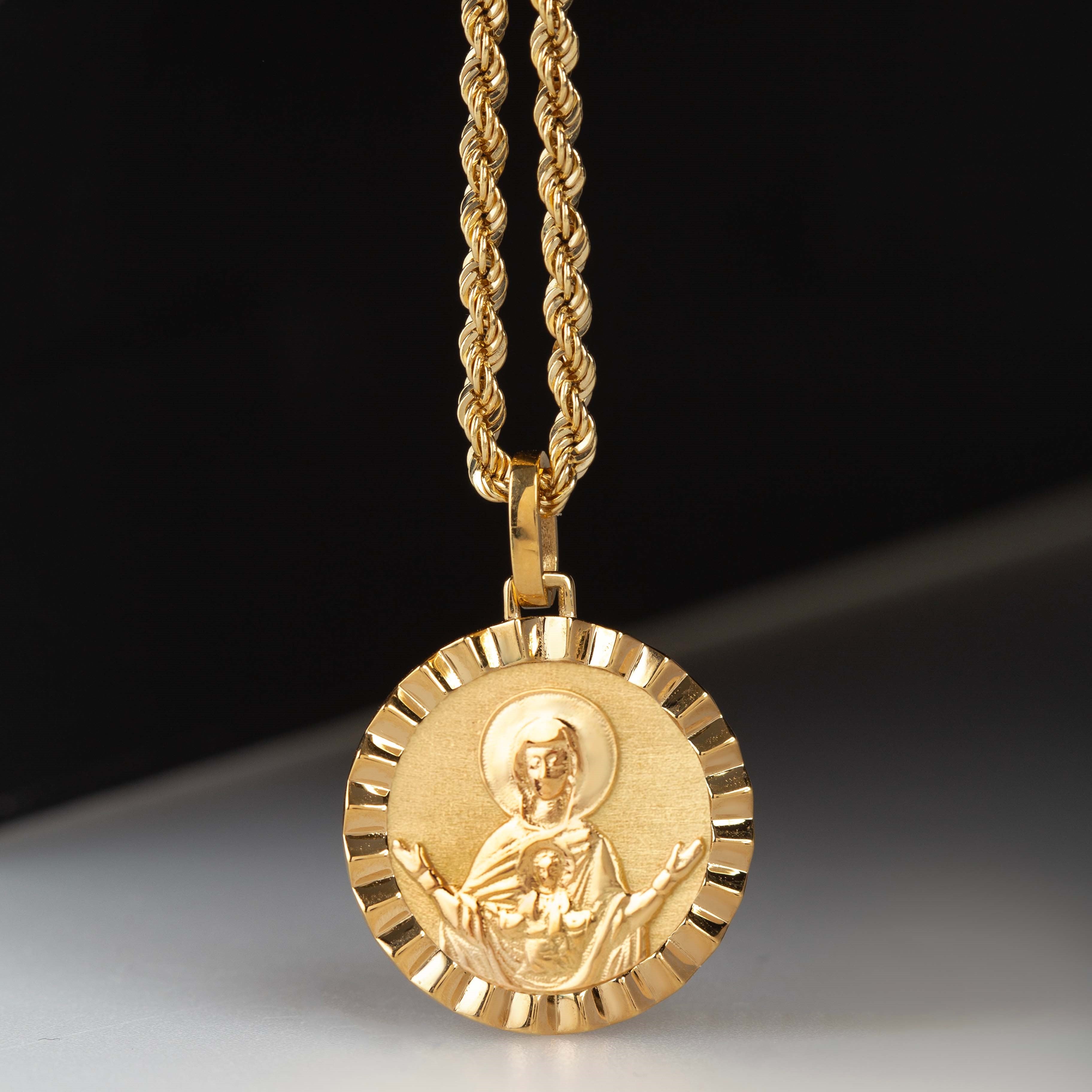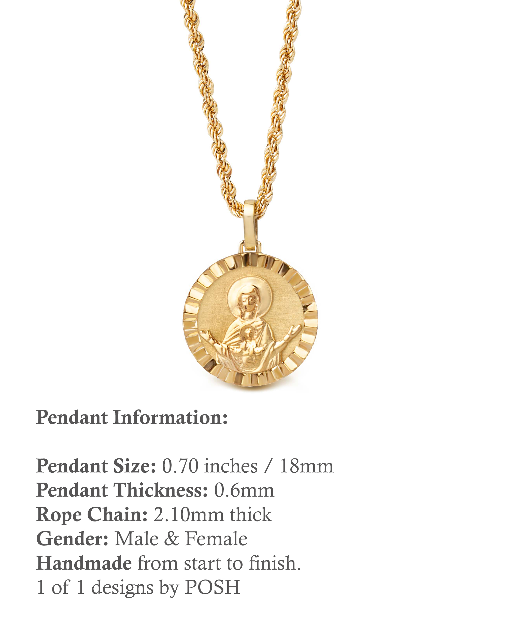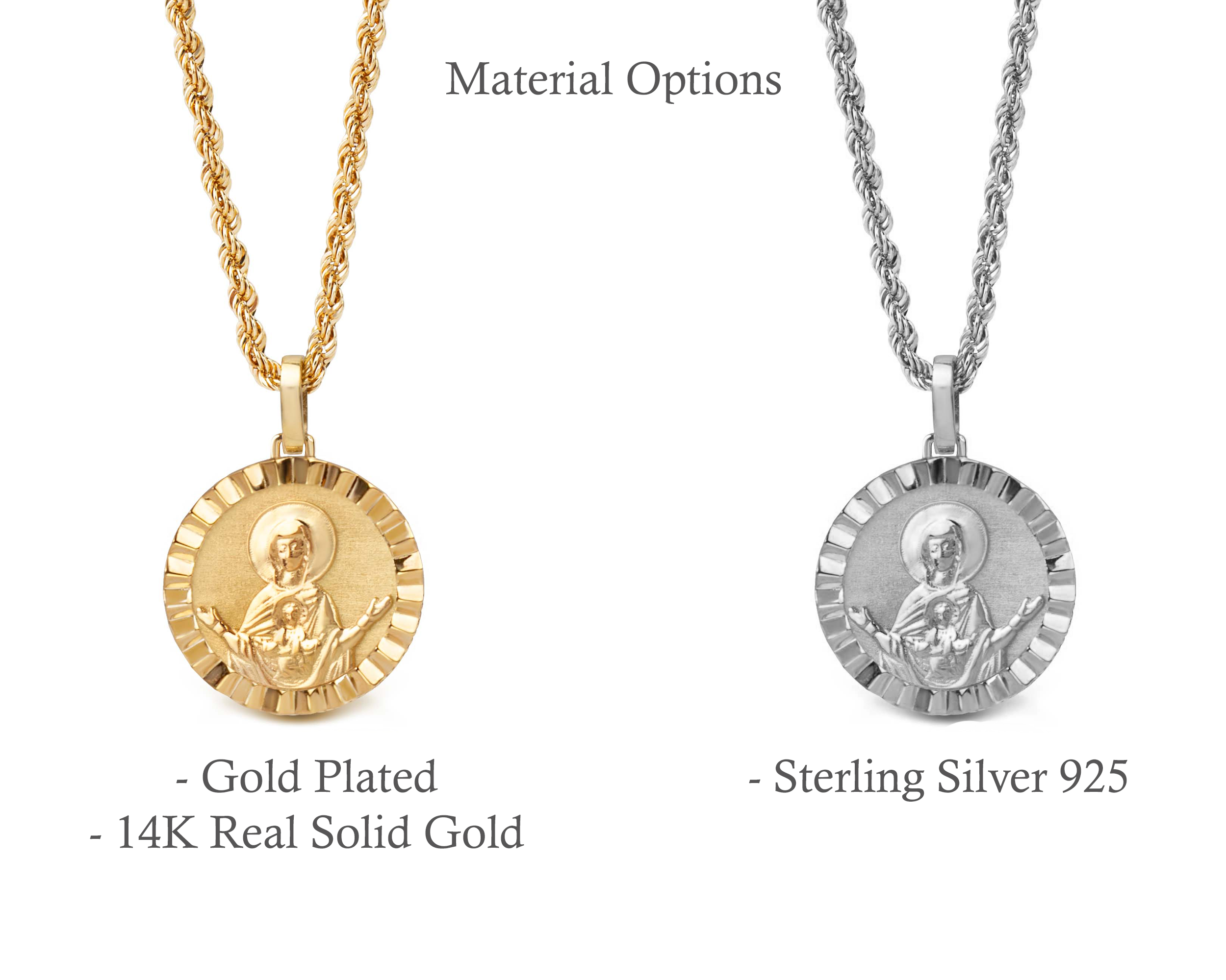 Our collection of round pendants with unique designs on top are made for both men and women. Our Virgin Mary necklace can be personalized on the back with a custom message of your choice.