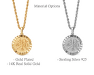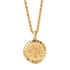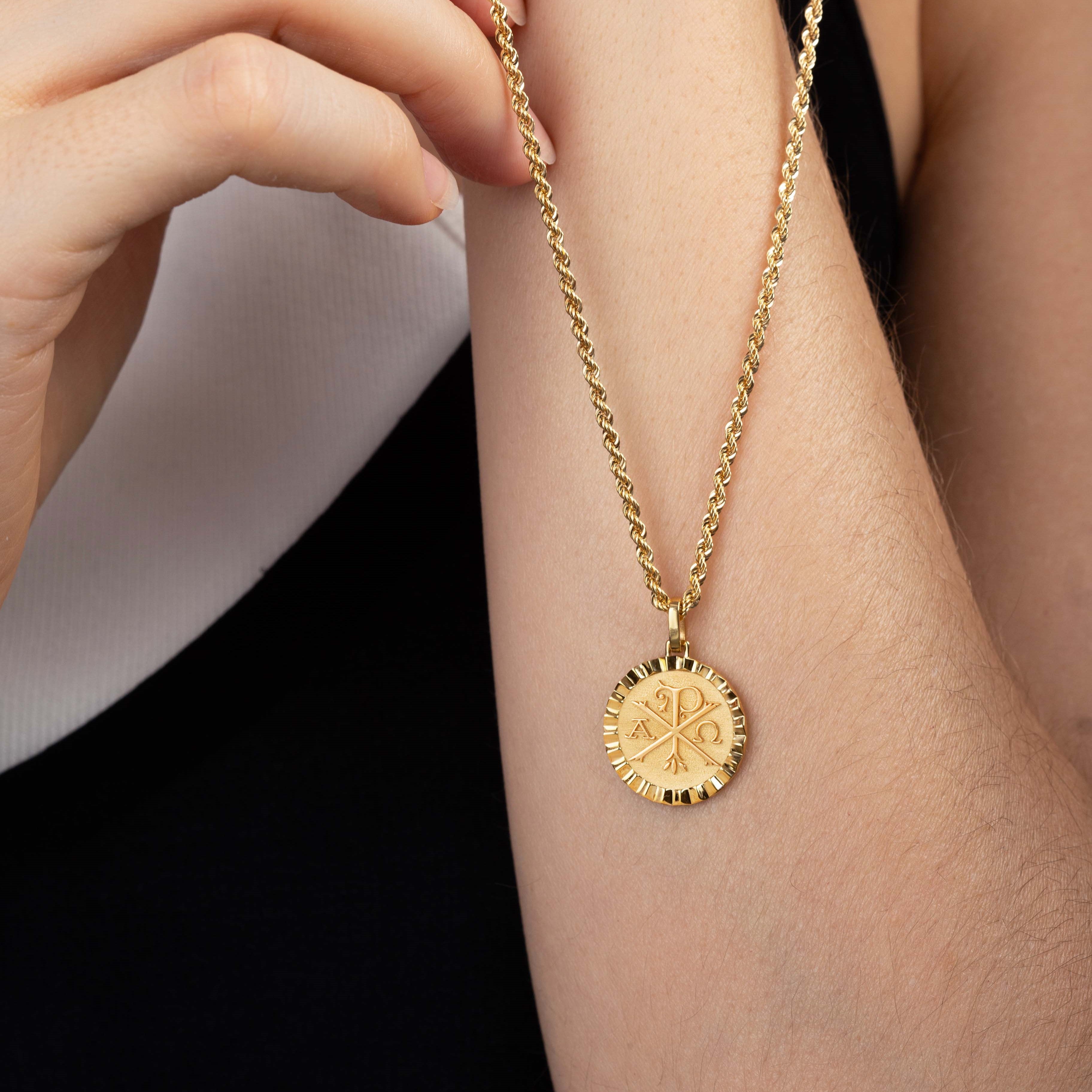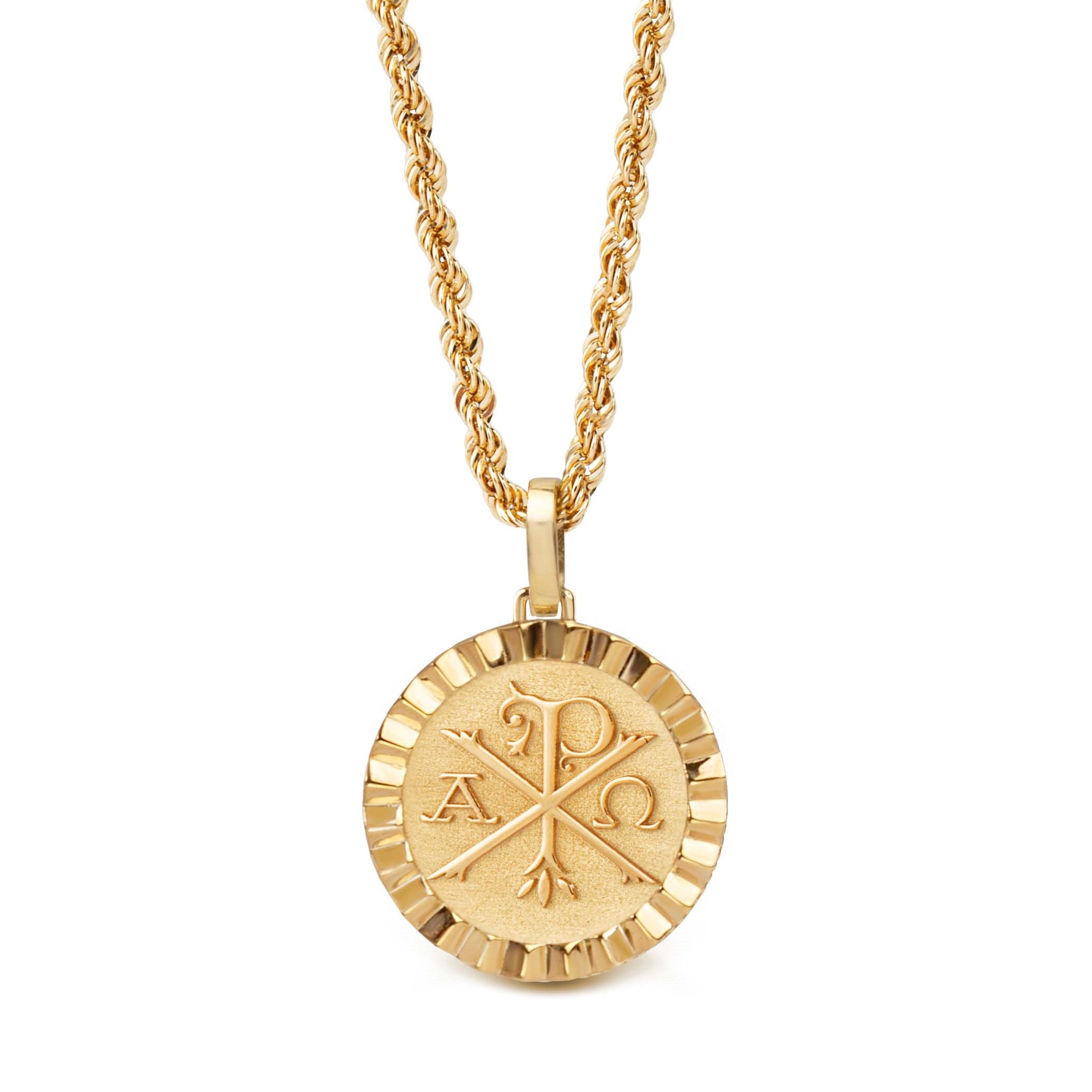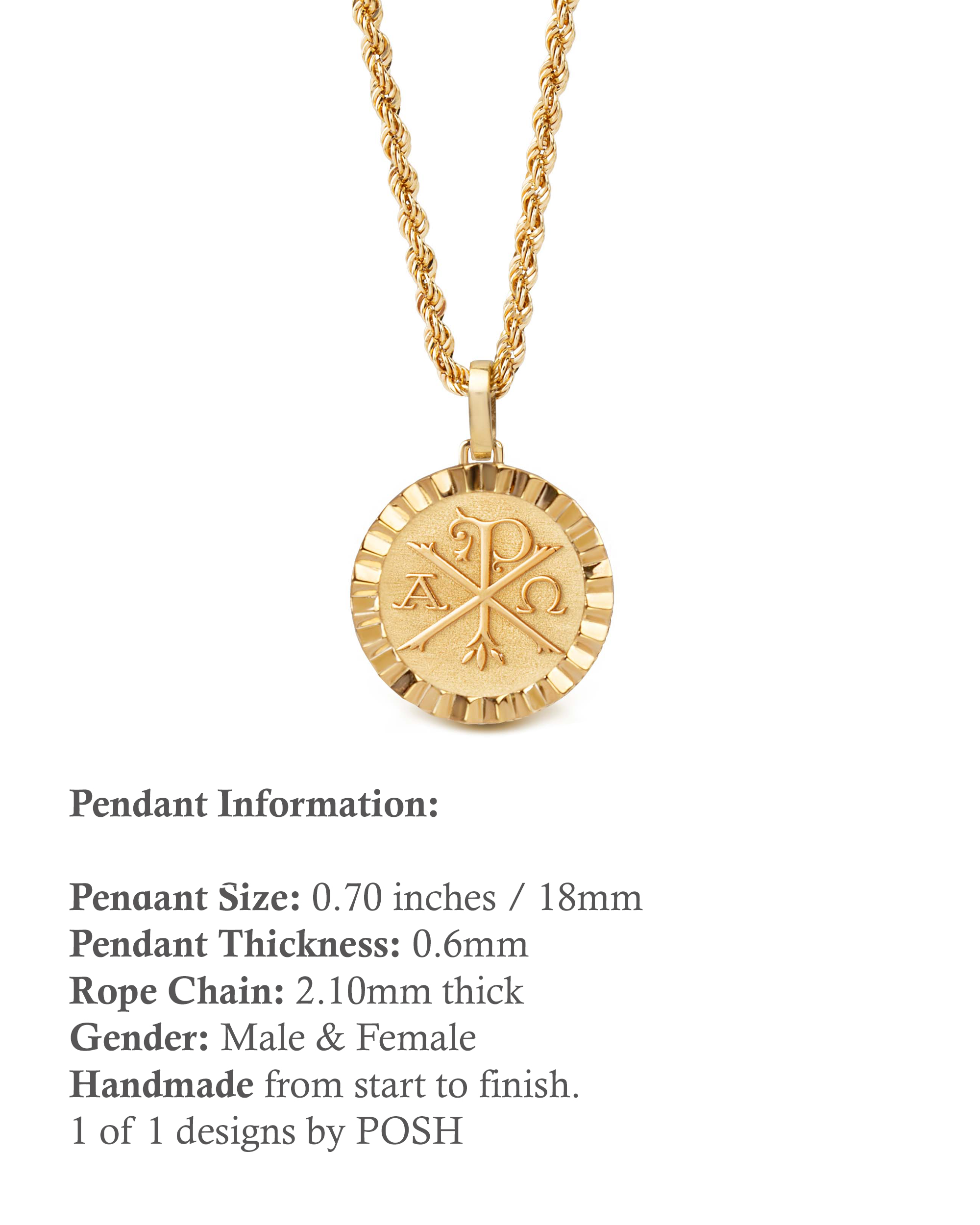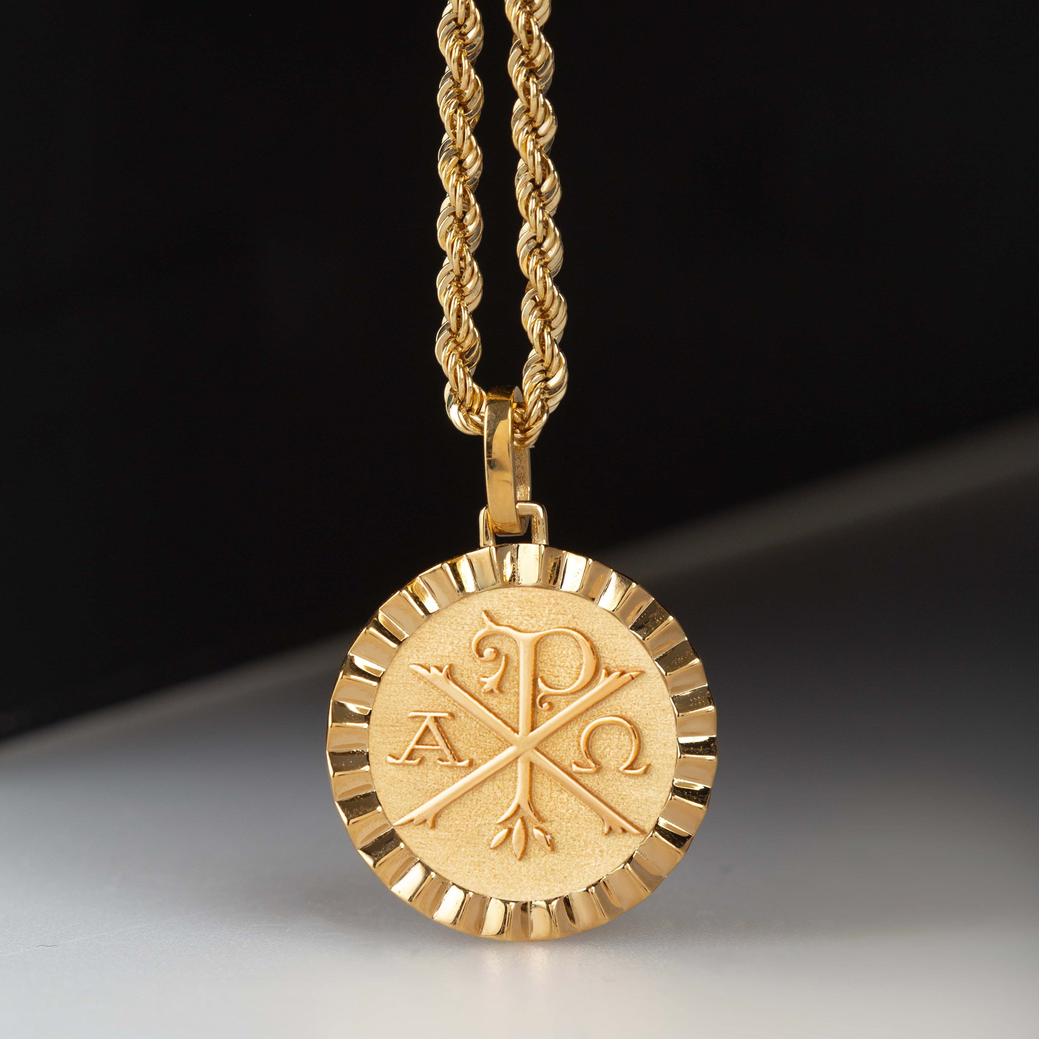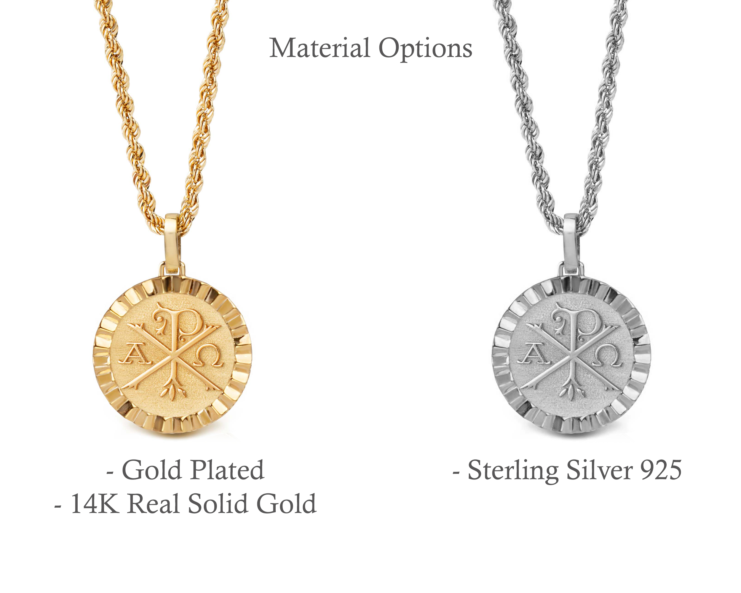 Our collection of round pendants with unique designs on top are made for both men and women. Our Chi Rho Cross necklace can be personalized on the back with a custom message of your choice.