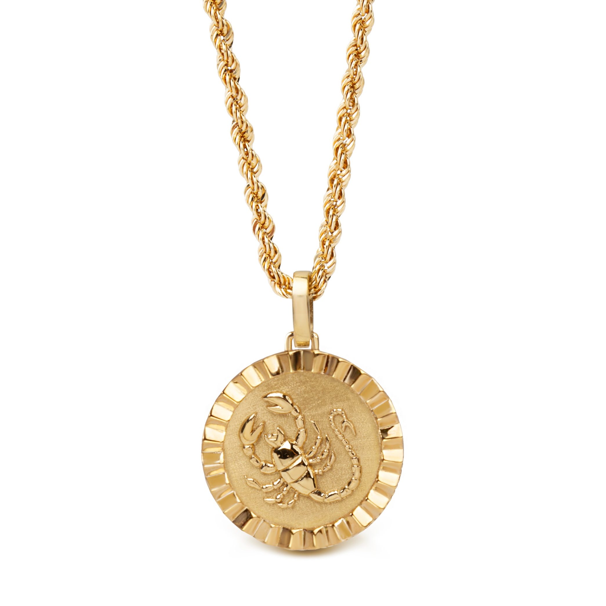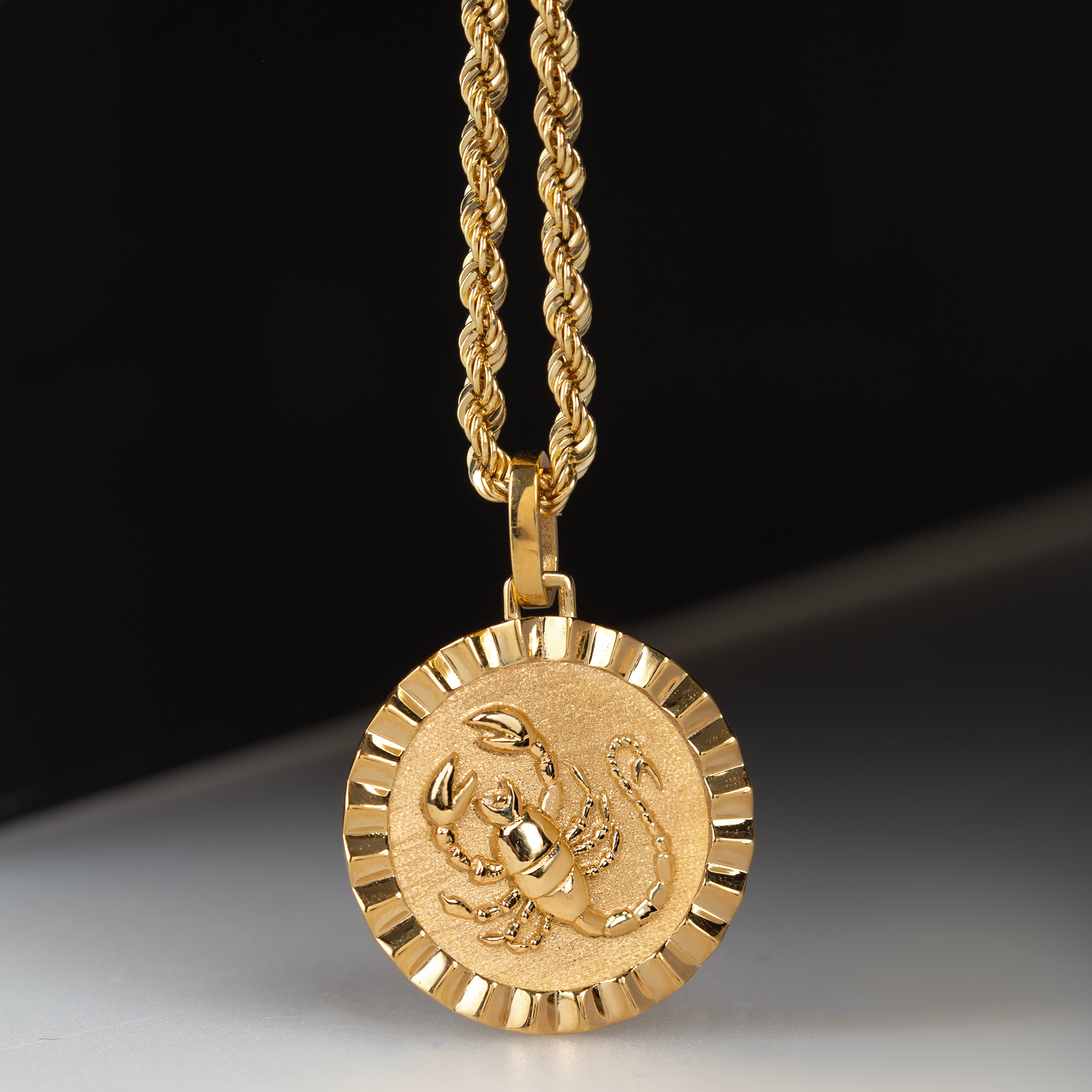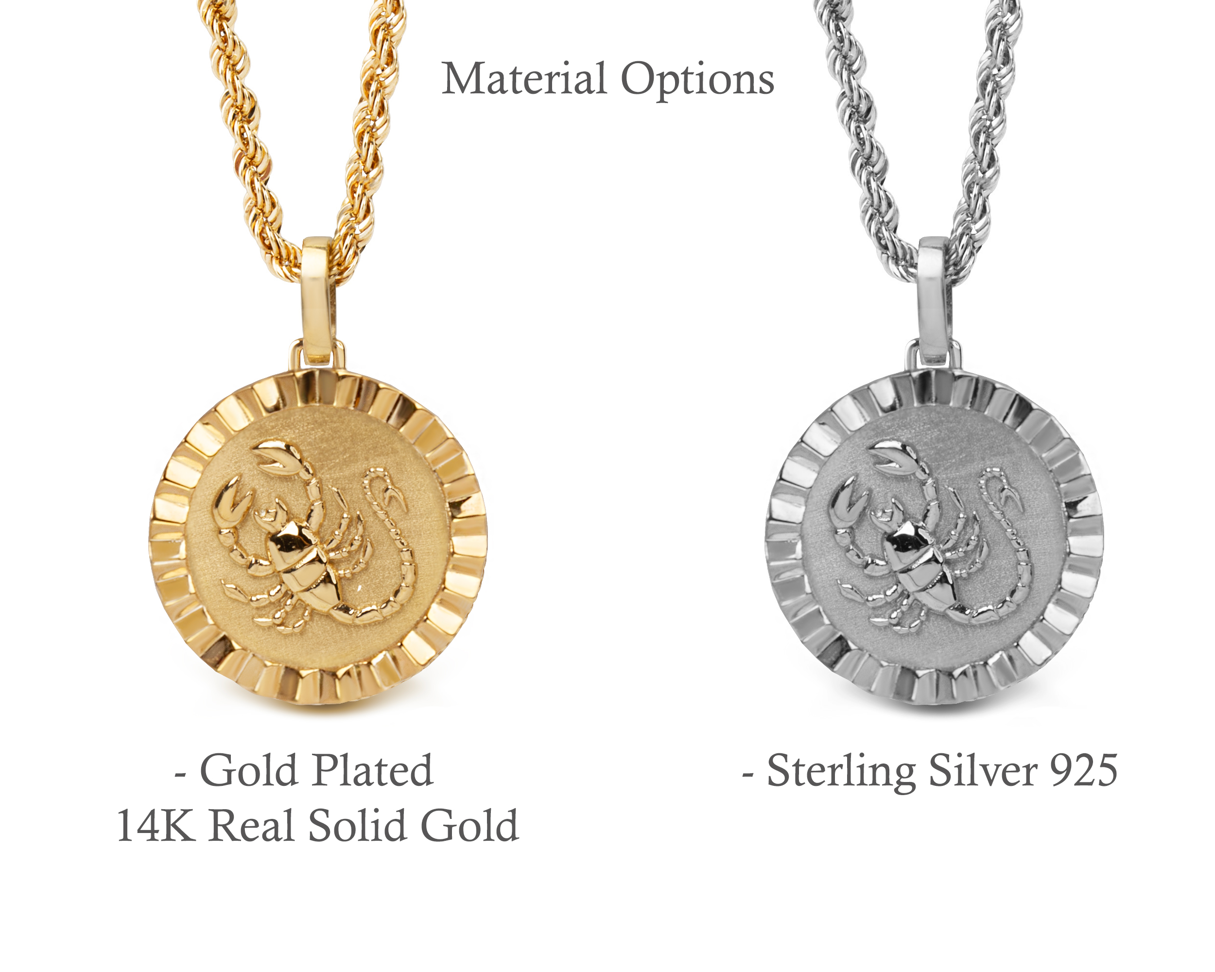 Our collection of round pendants with unique designs on top are made for both men and women. Our Scorpion necklace can be personalized on the back with a custom message of your choice.