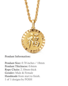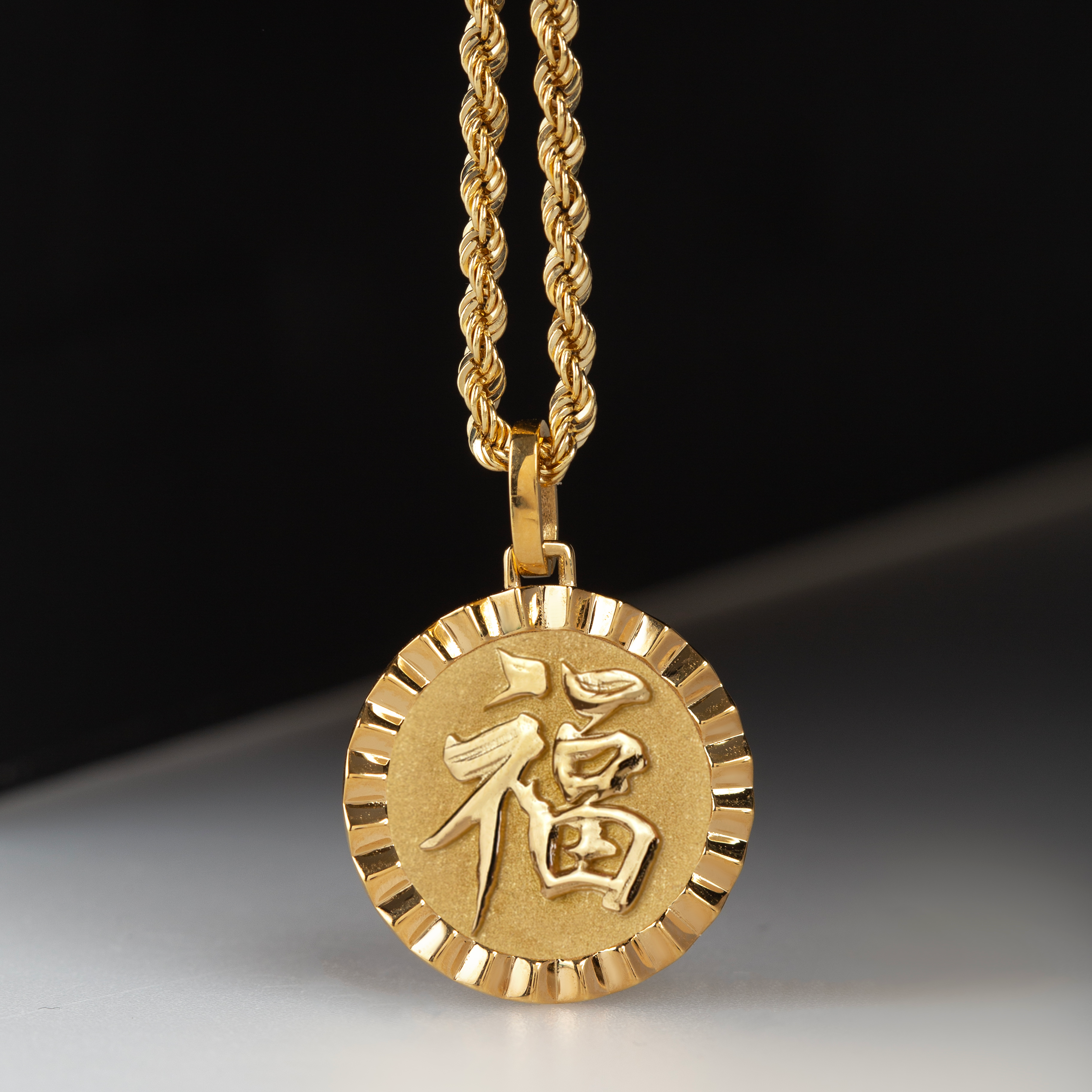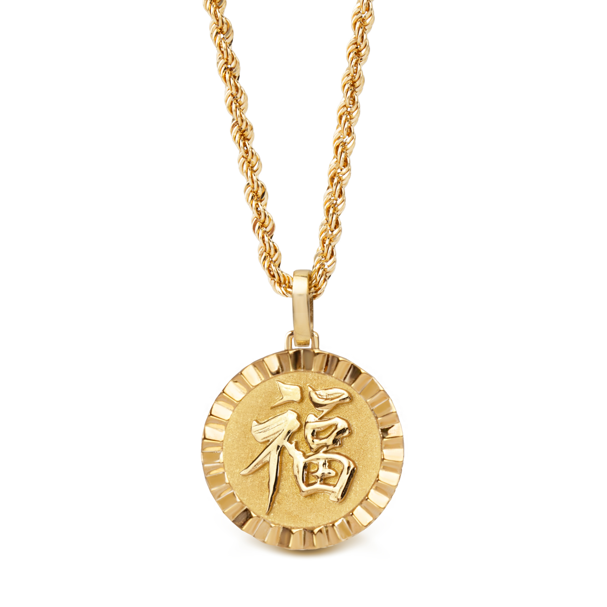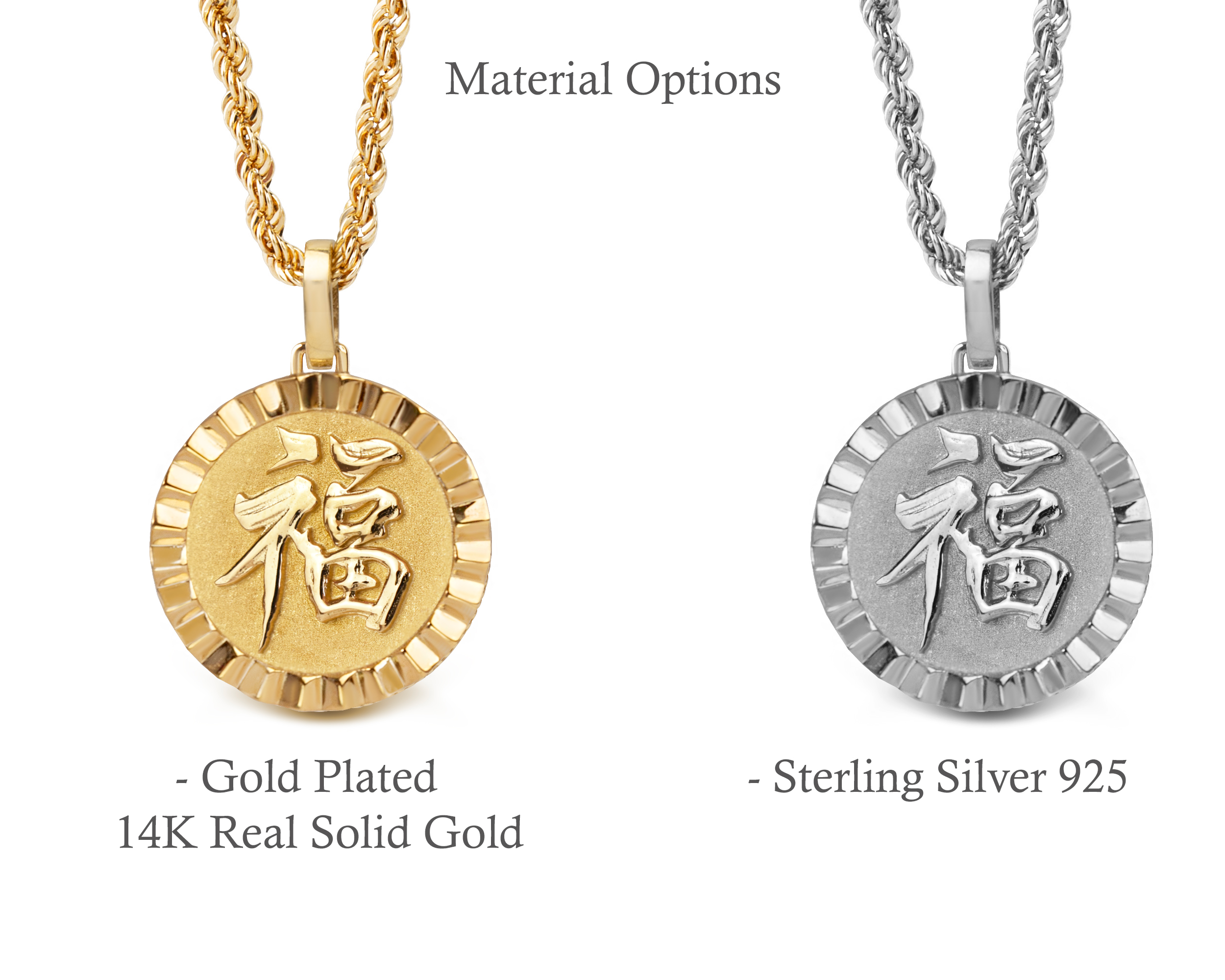 Our collection of round pendants with unique designs on top are made for both men and women. Our Chinese Symbol necklace can be personalized on the back with a custom message of your choice.