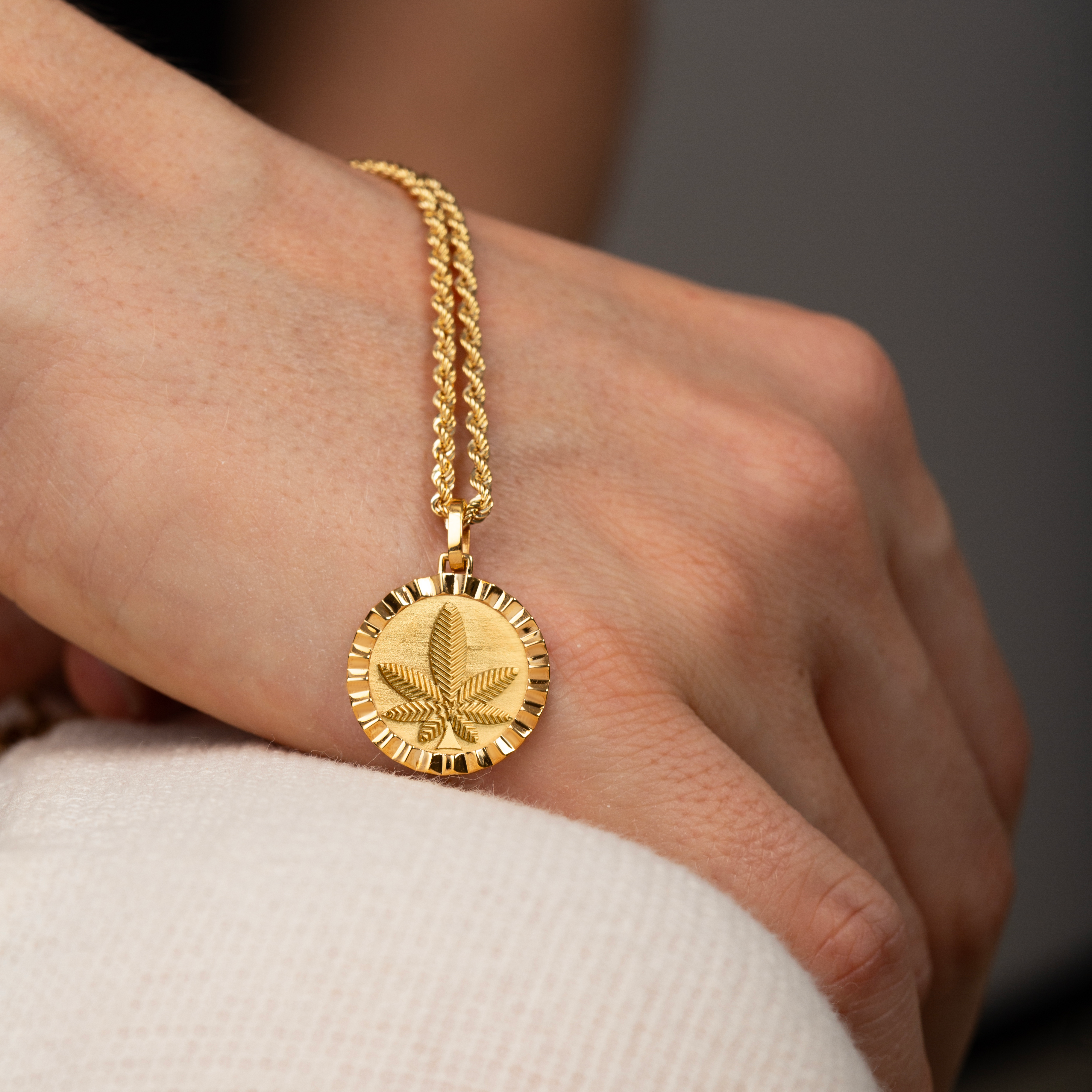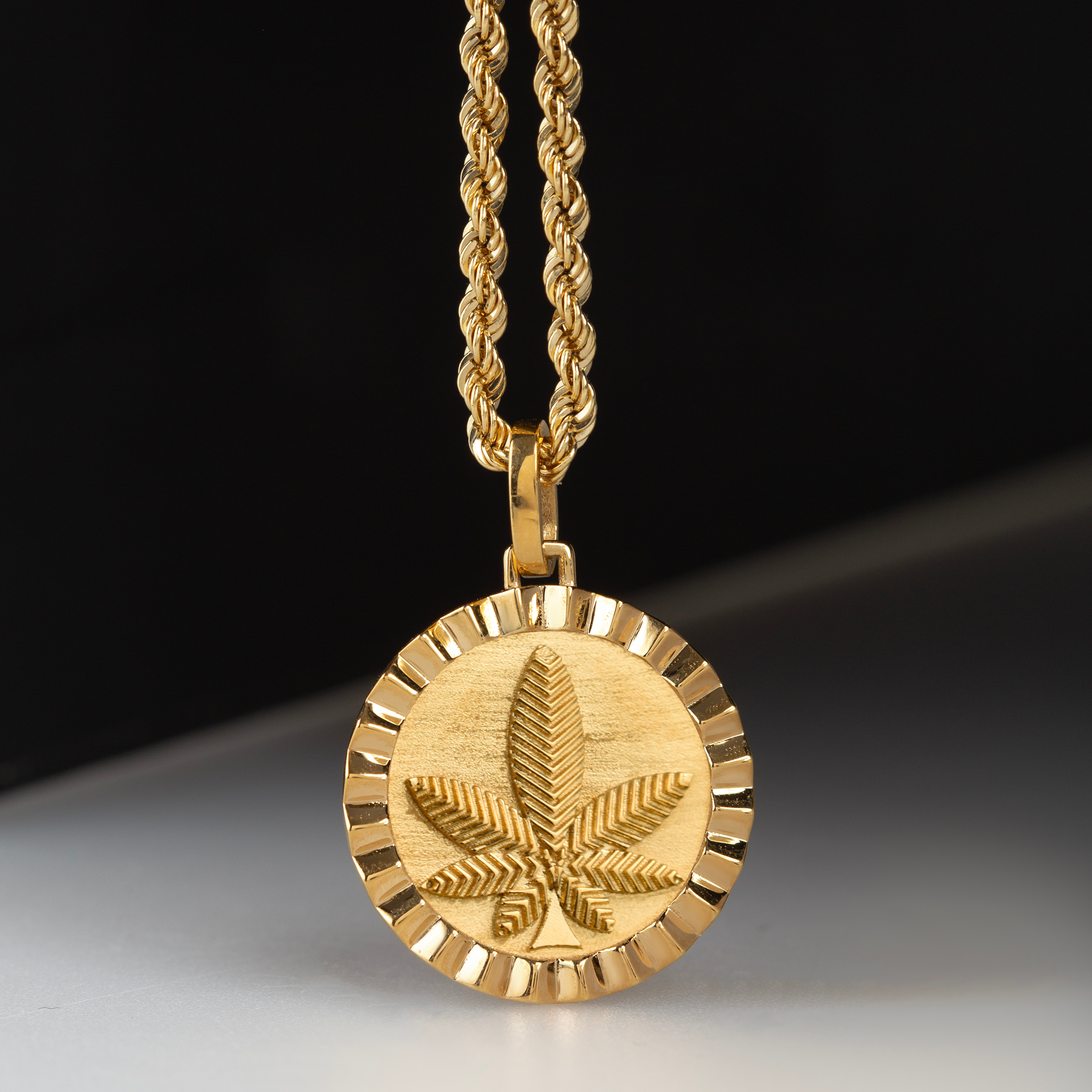 Our collection of round pendants with unique designs on top are made for both men and women. Our Marijuana Leaf necklace can be personalized on the back with a custom message of your choice.