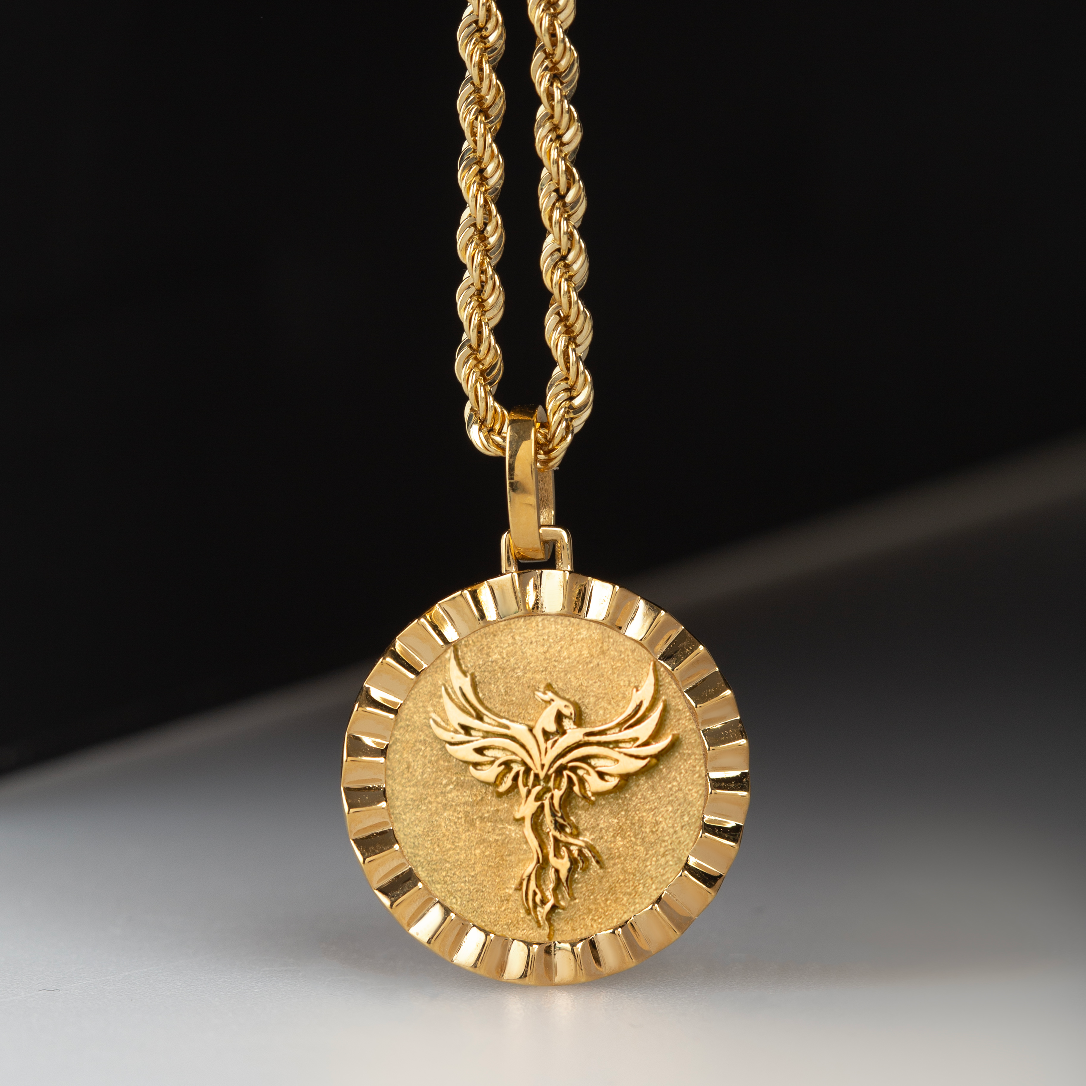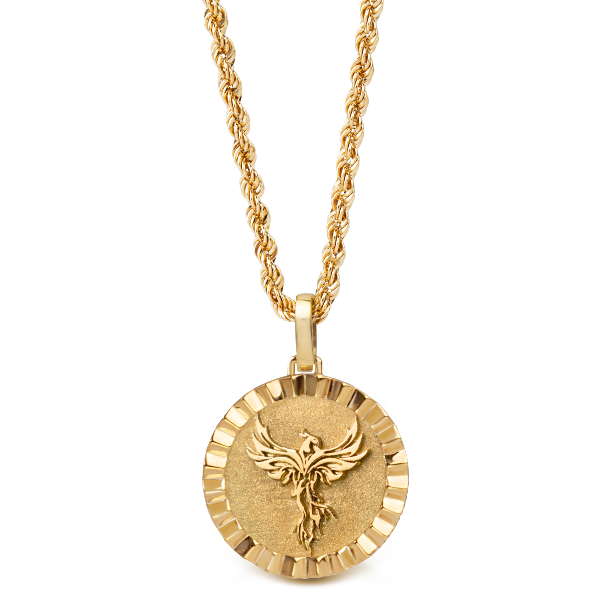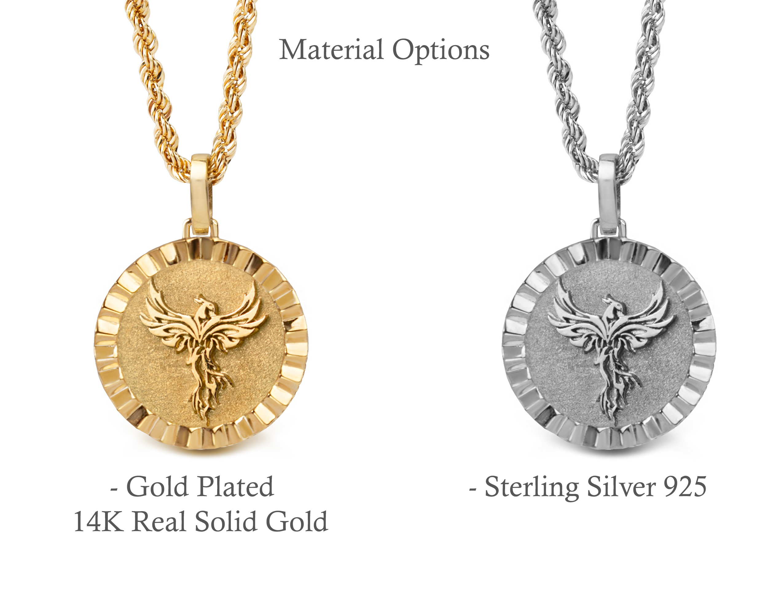 Our collection of round pendants with unique designs on top are made for both men and women. Our Phoenix necklace can be personalized on the back with a custom message of your choice.