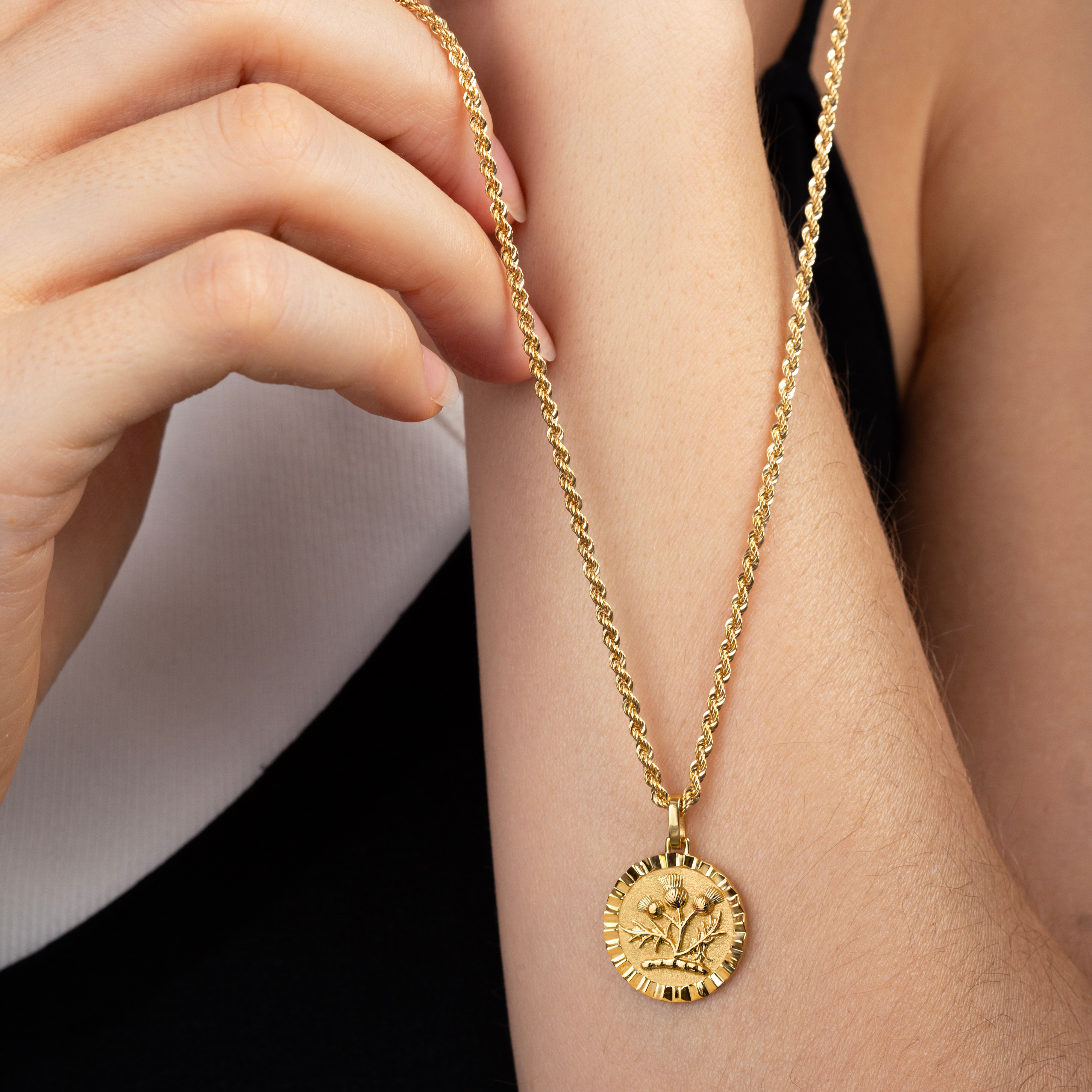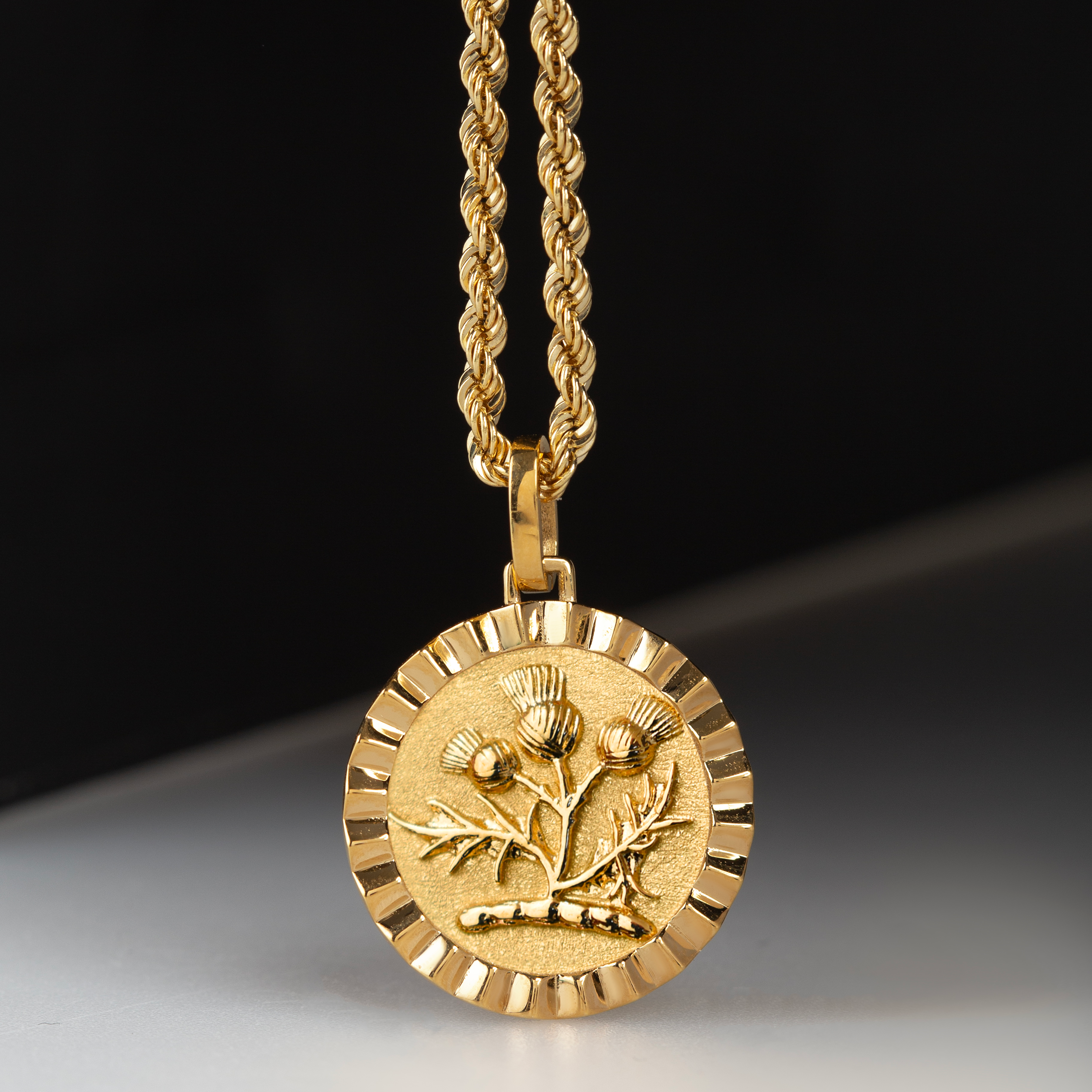 Our collection of round pendants with unique designs on top are made for both men and women. Our Thistle necklace can be personalized on the back with a custom message of your choice.