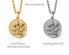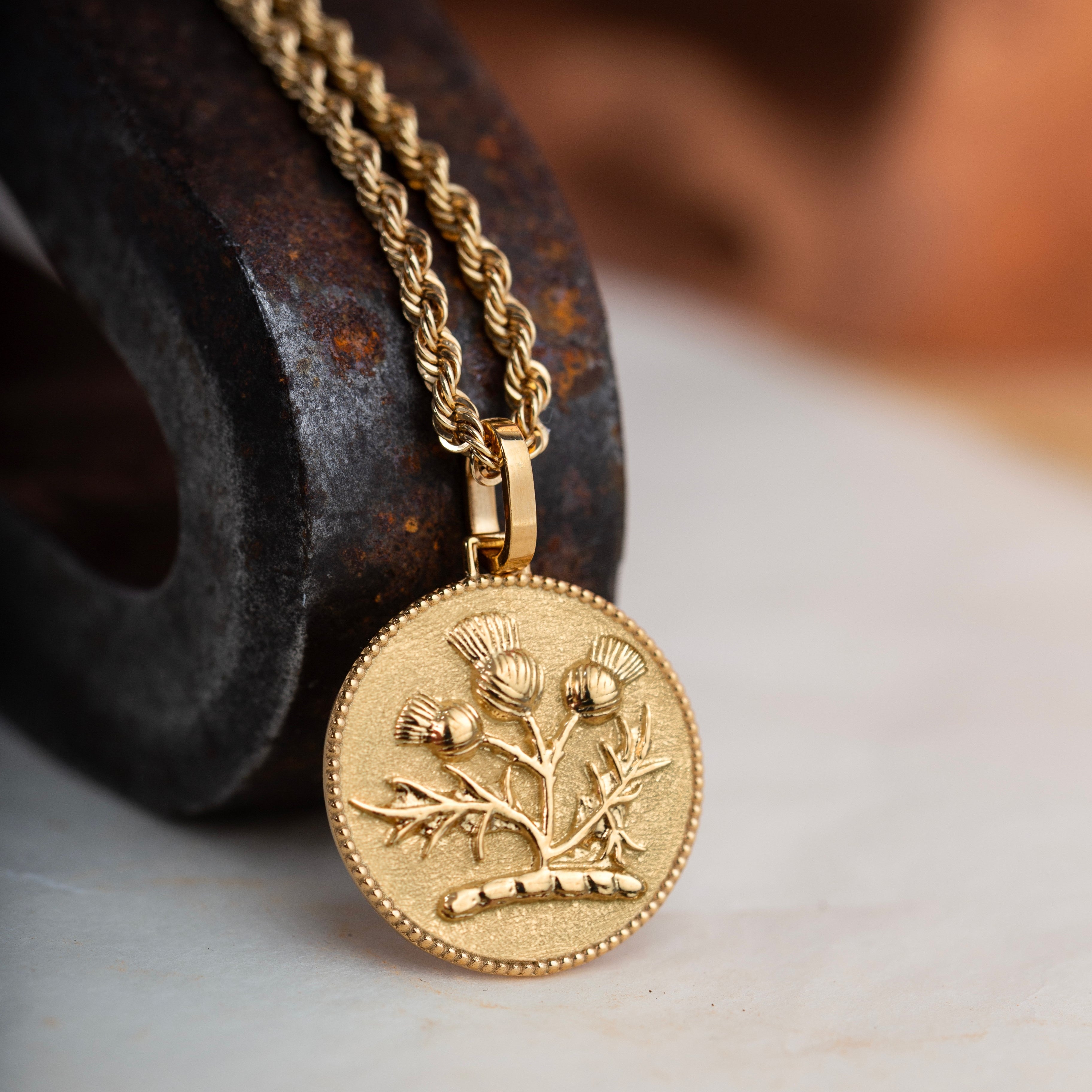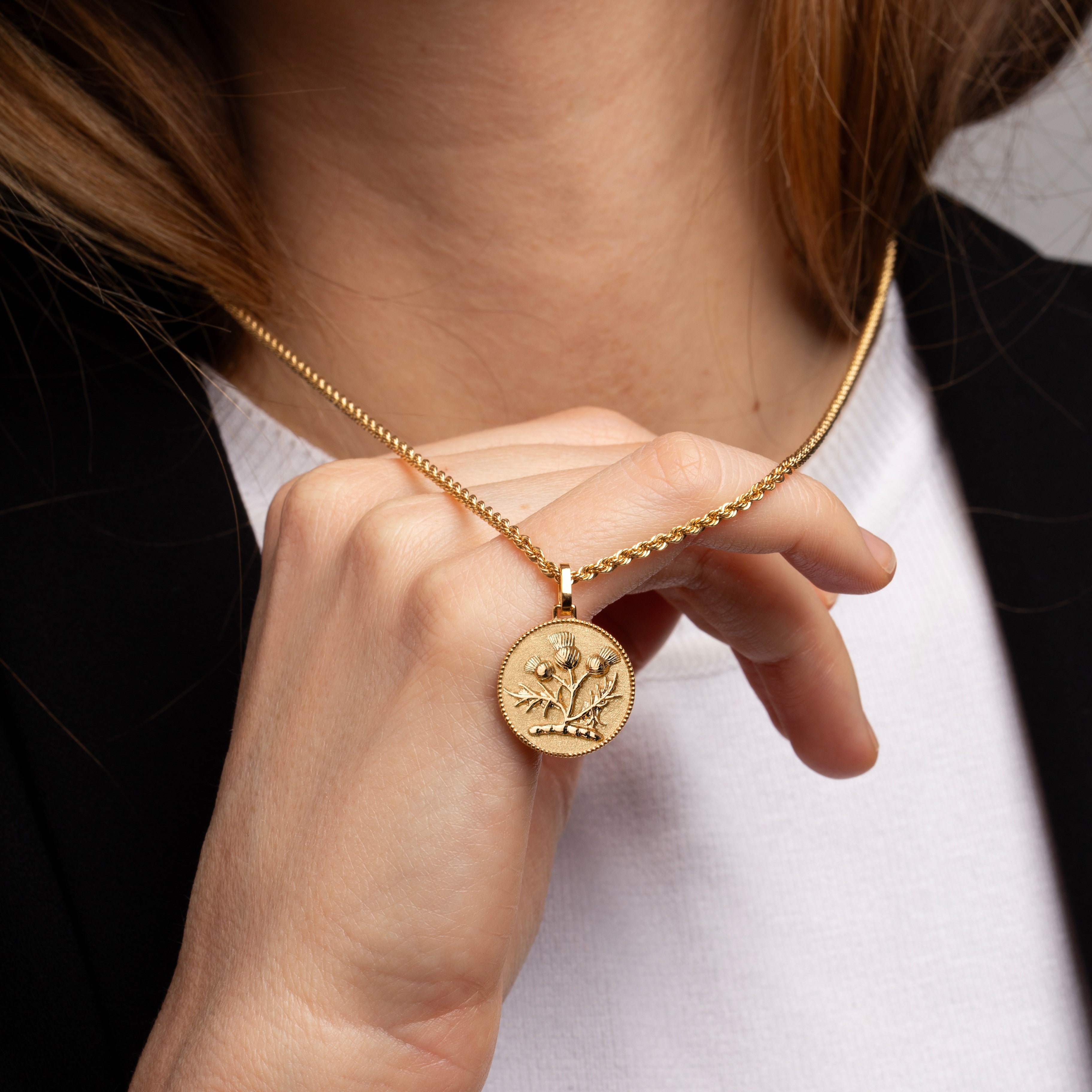 Our collection of round pendants with unique designs on top are made for both men and women. Our Thistle necklace can be personalized on the back with a custom message of your choice.