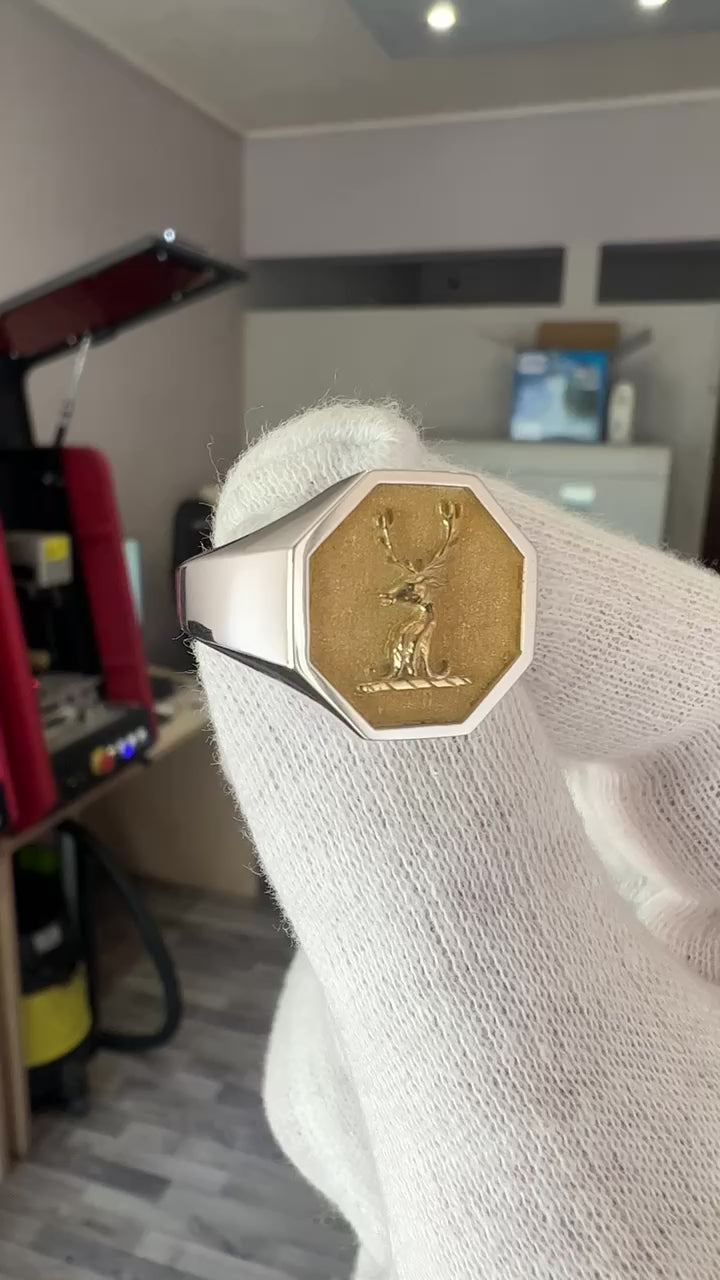 A Stag Signet Ring made out of Sterling Silver 925 with gold plated design inside the octagon. An exclusive stag ring design by Danelian Jewelry.