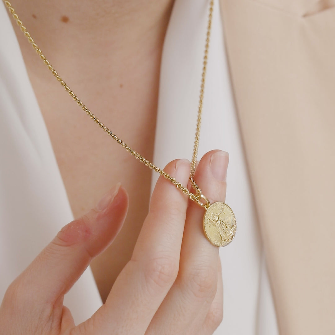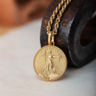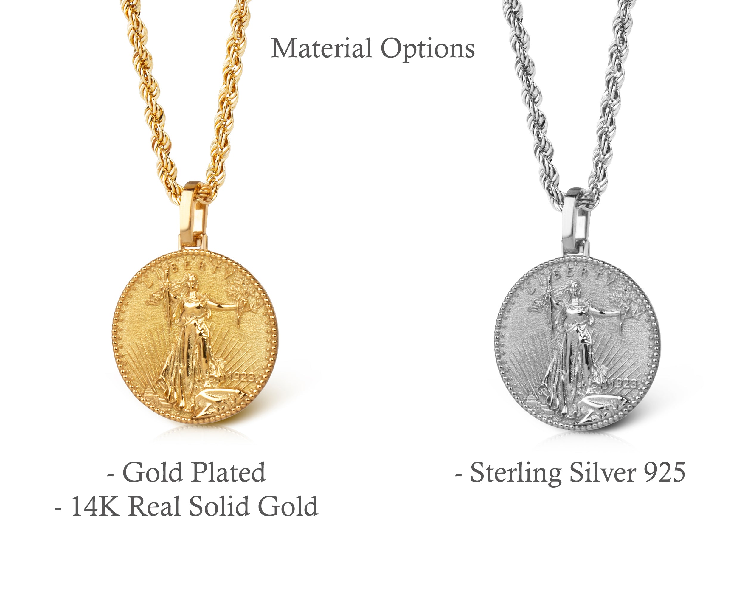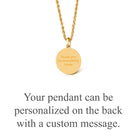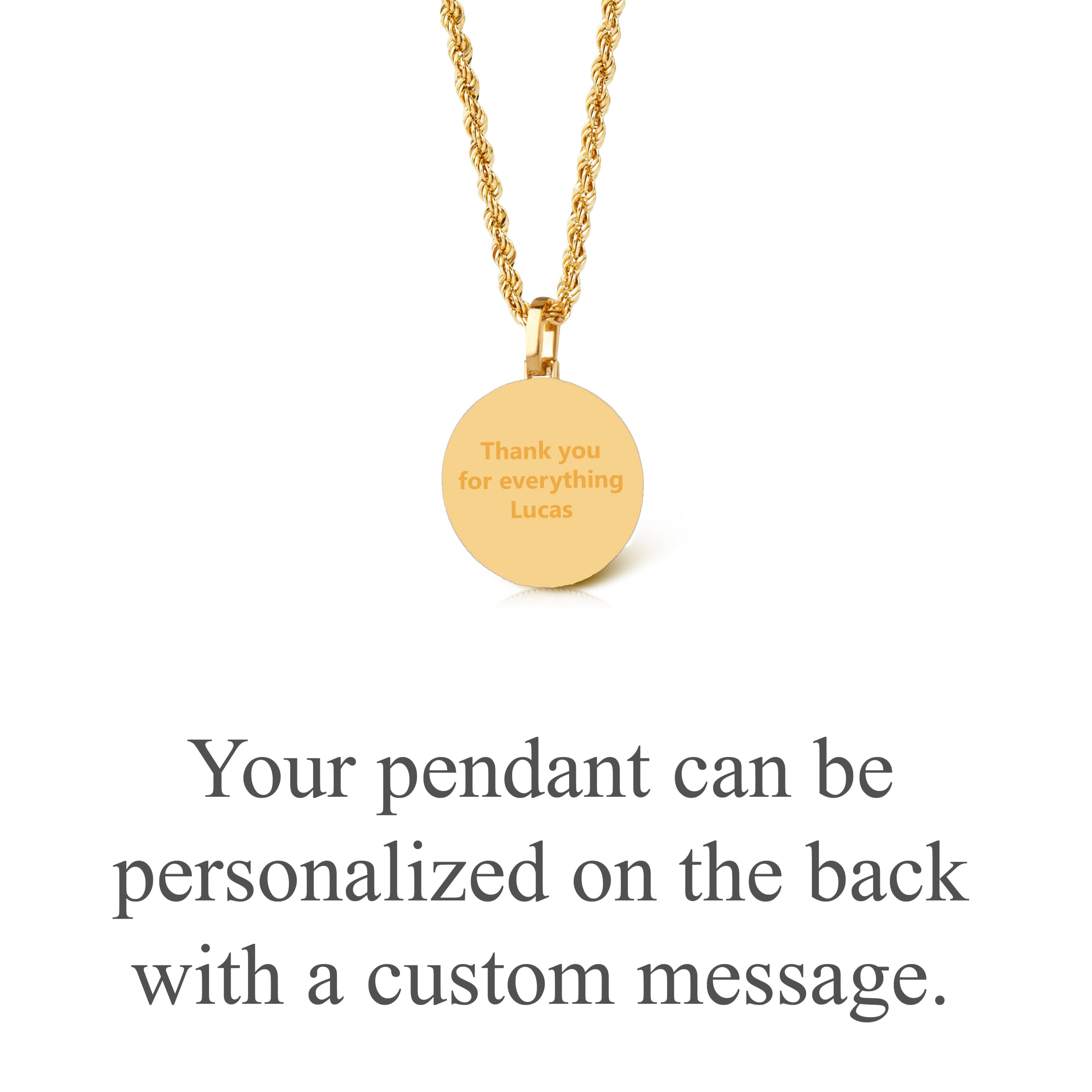 Our collection of round pendants with unique designs on top are made for both men and women. Our American eagle necklace can be personalized on the back with a custom message of your choice.