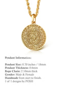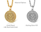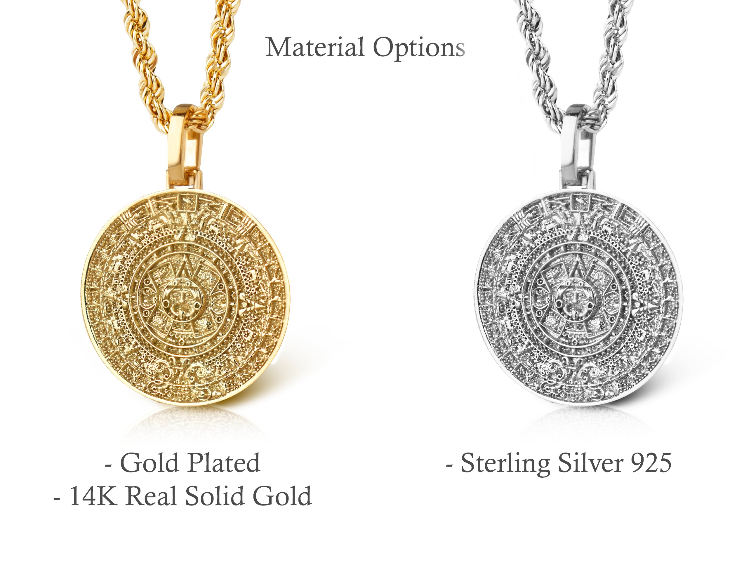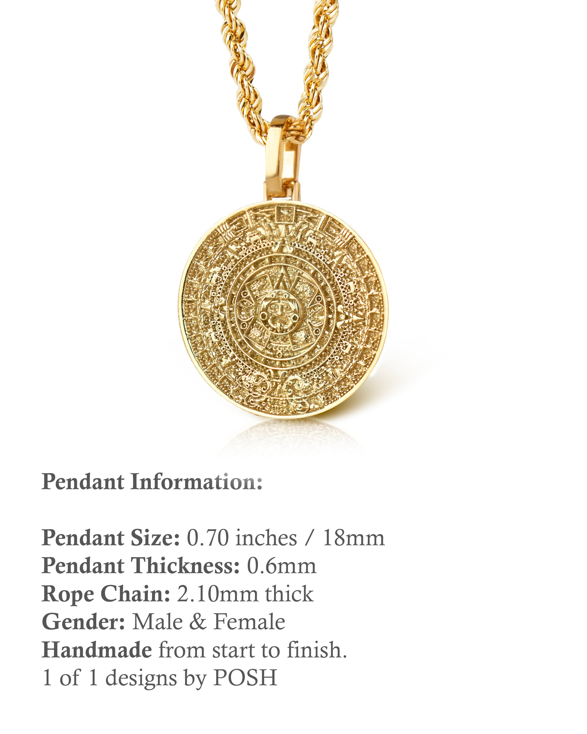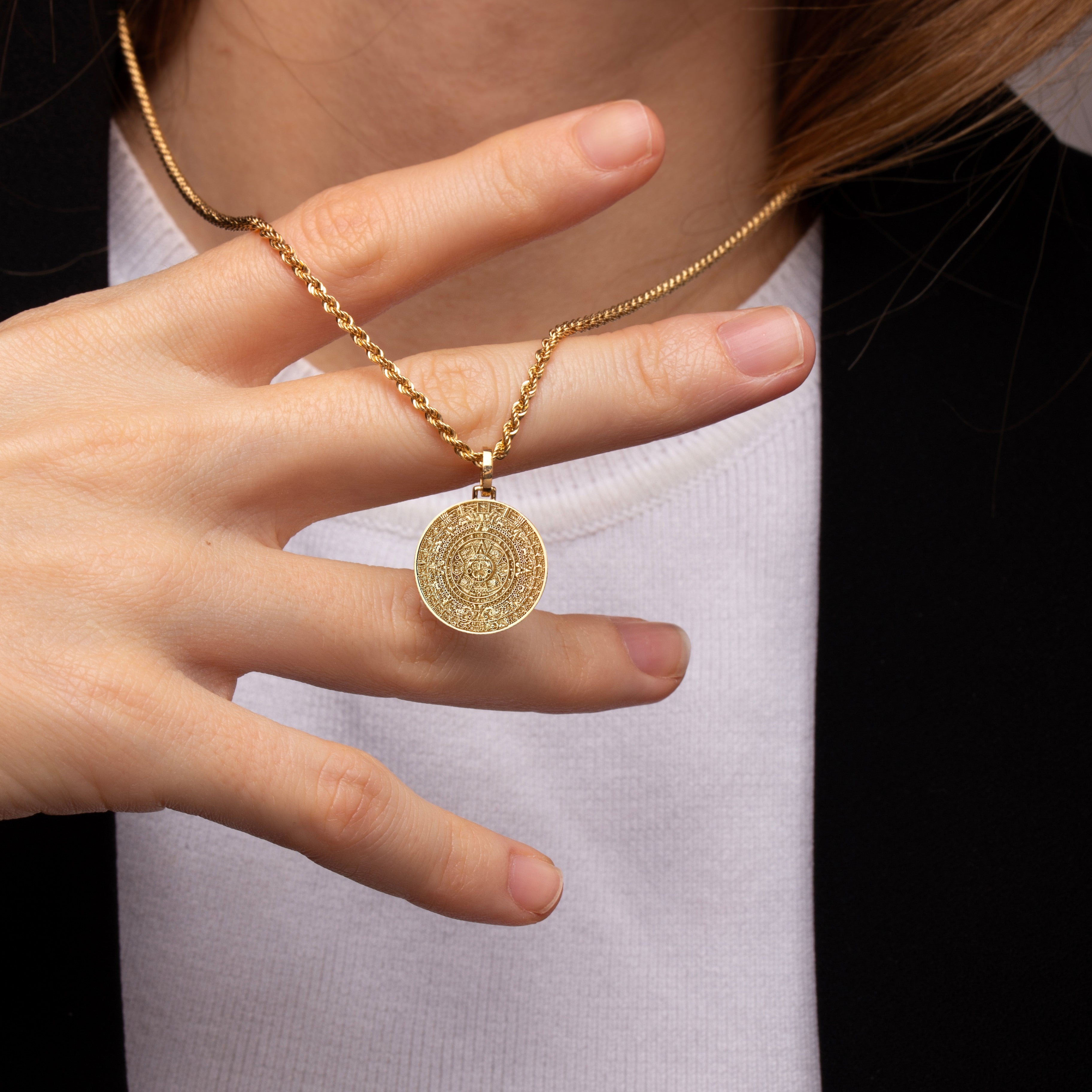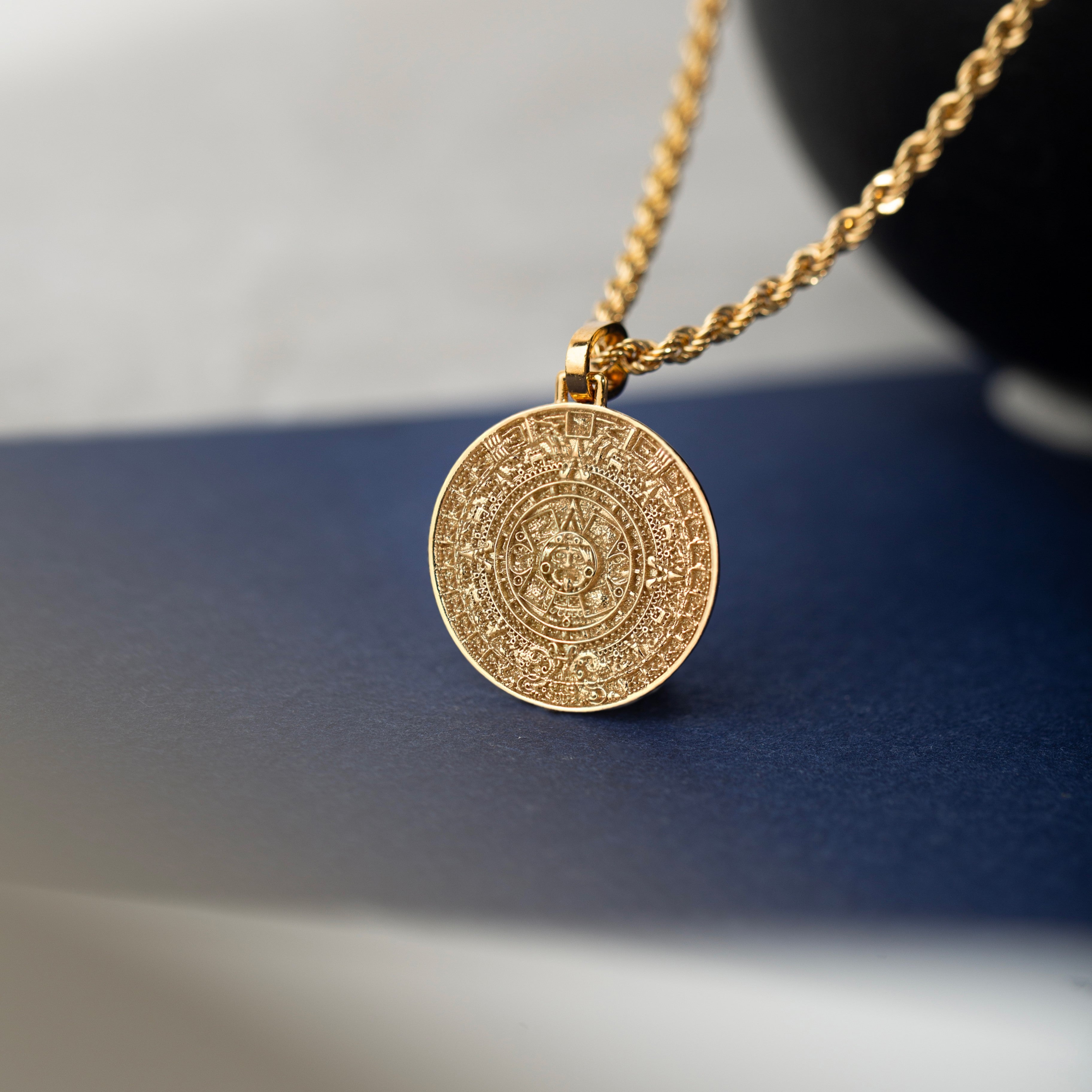 Our collection of round pendants with unique designs on top are made for both men and women. Our Aztec Calendar necklace can be personalized on the back with a custom message of your choice.