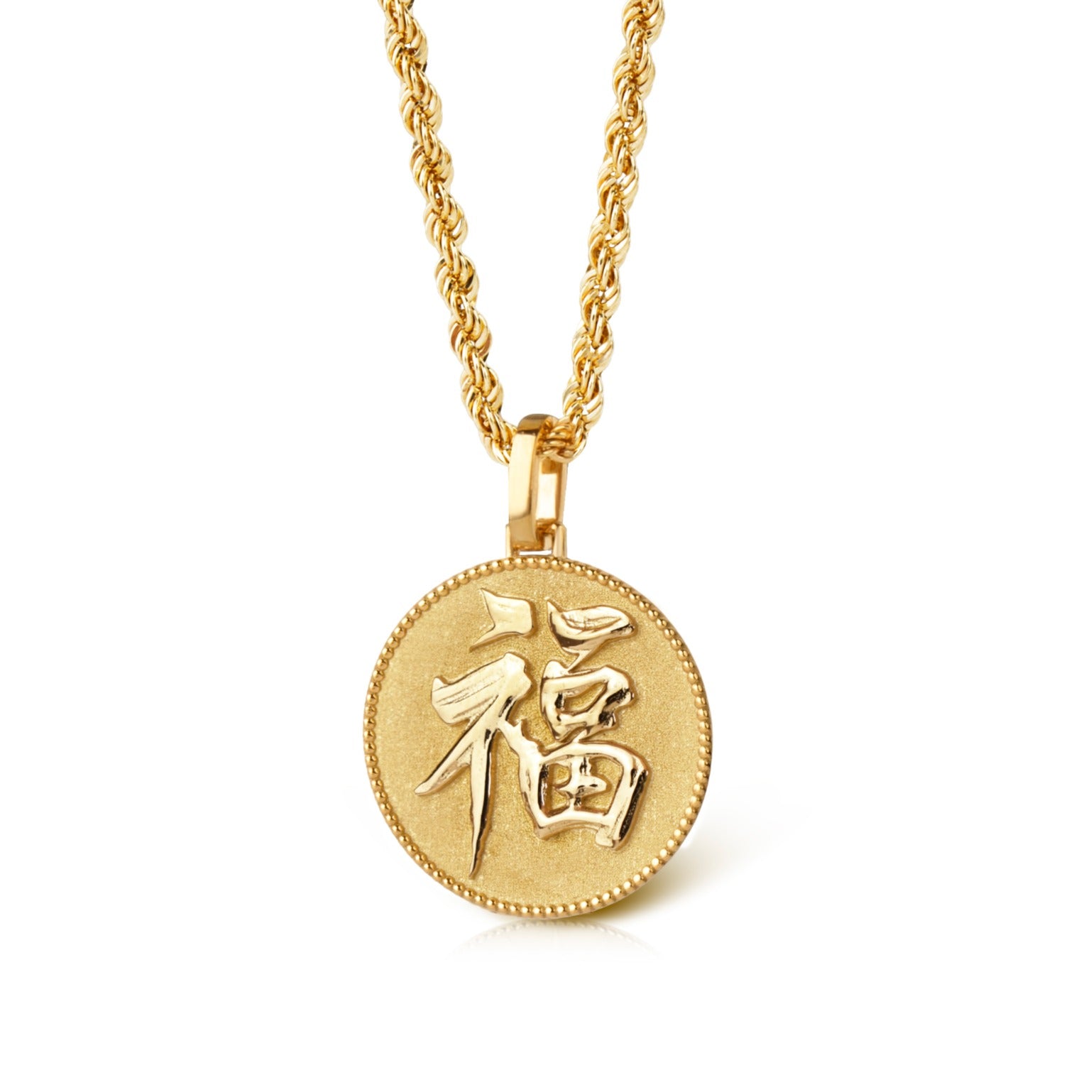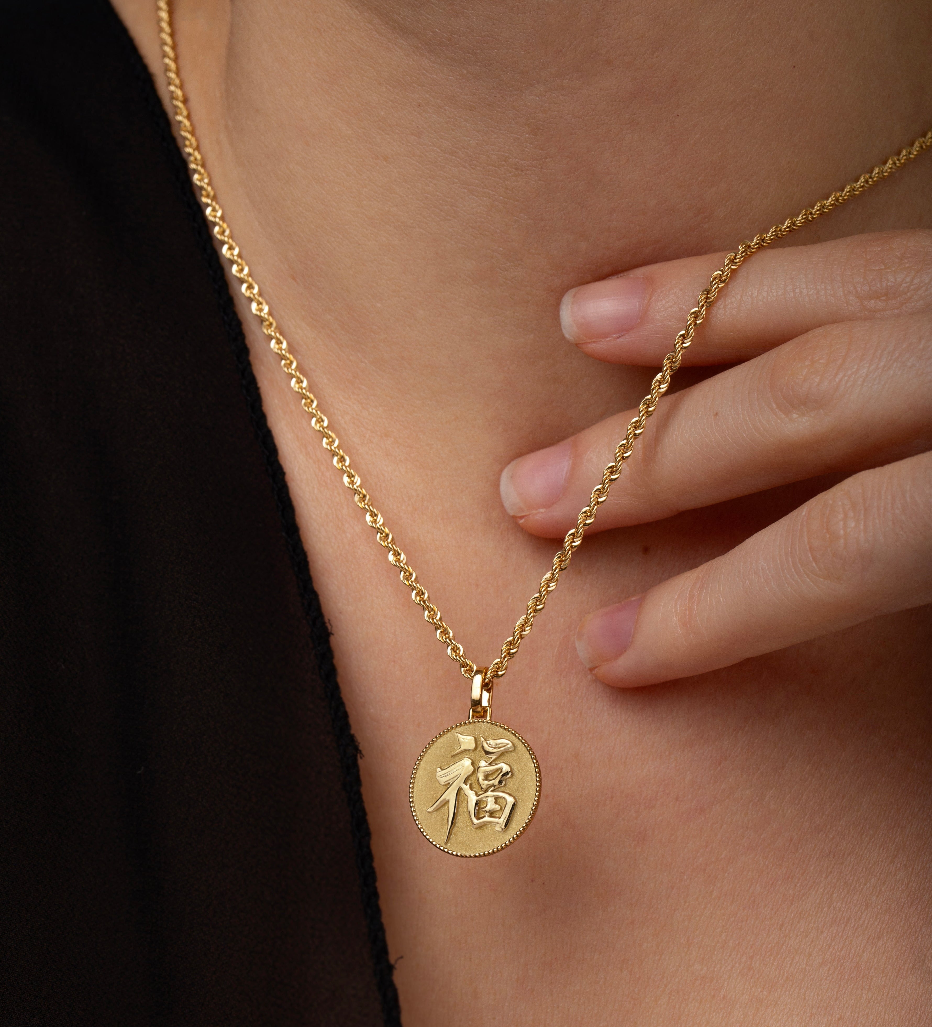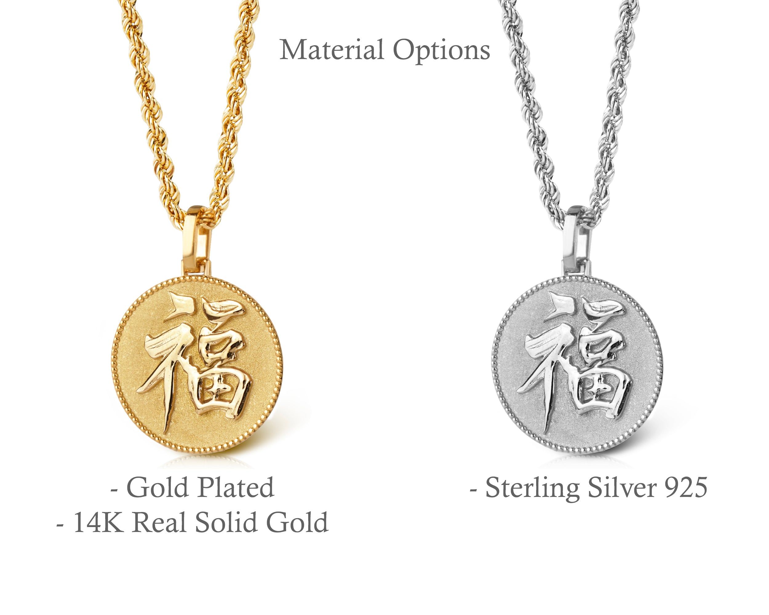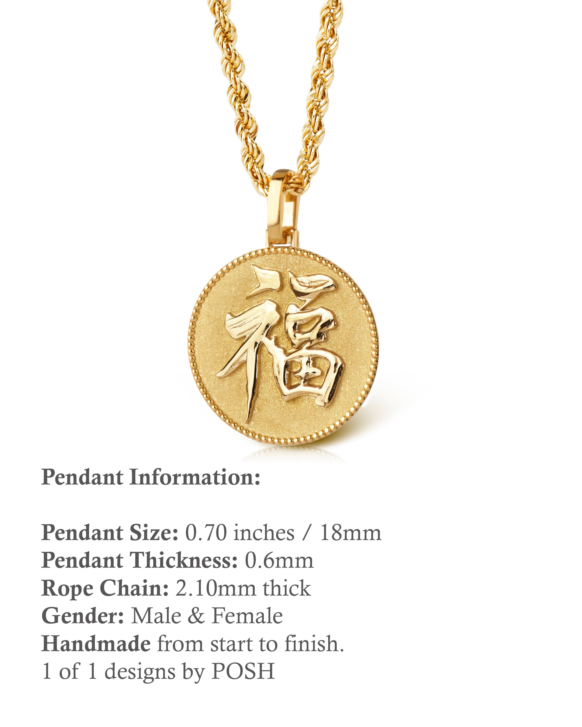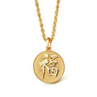 Our collection of round pendants with unique designs on top are made for both men and women. Our Chinese new year coin necklace can be personalized on the back with a custom message of your choice.