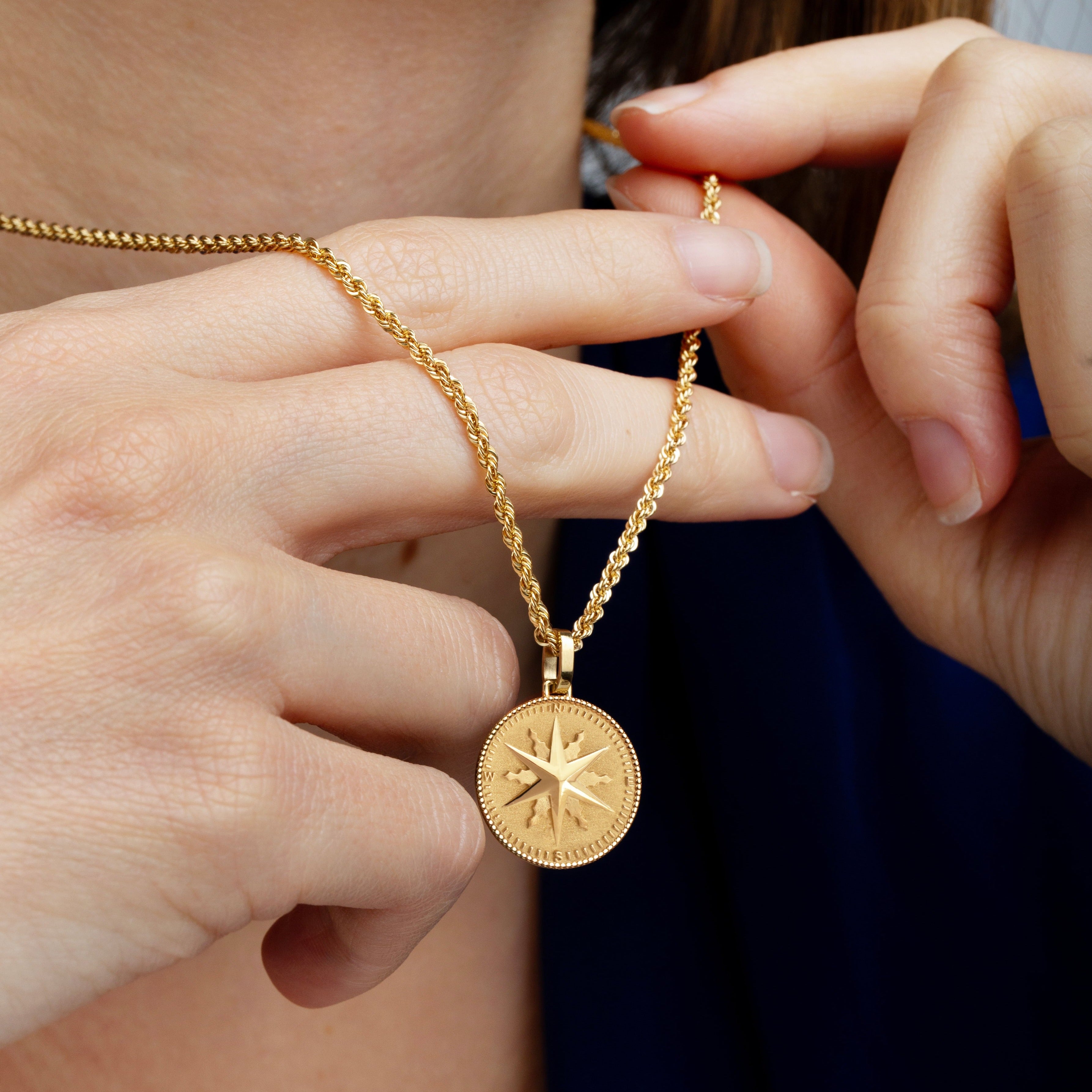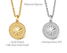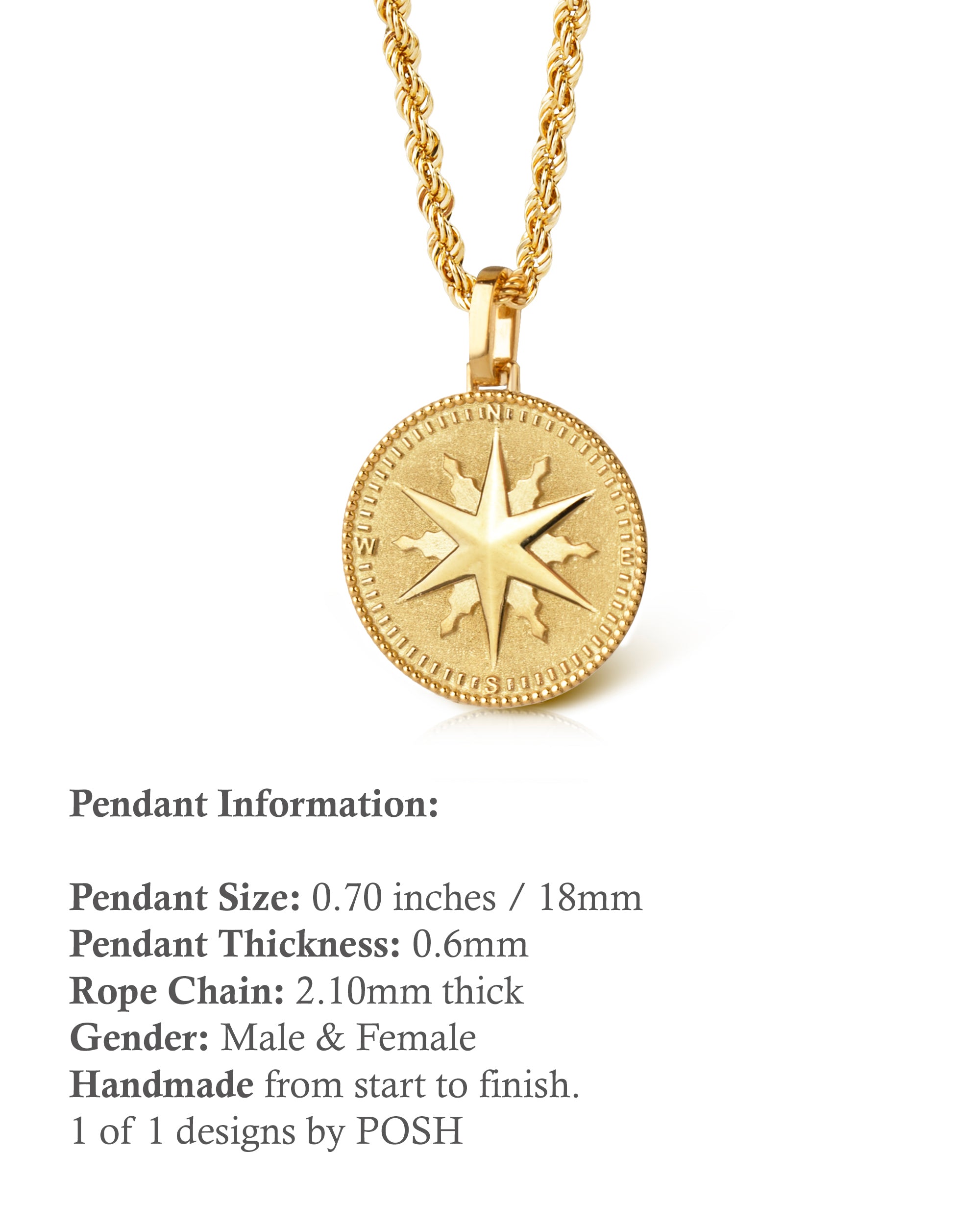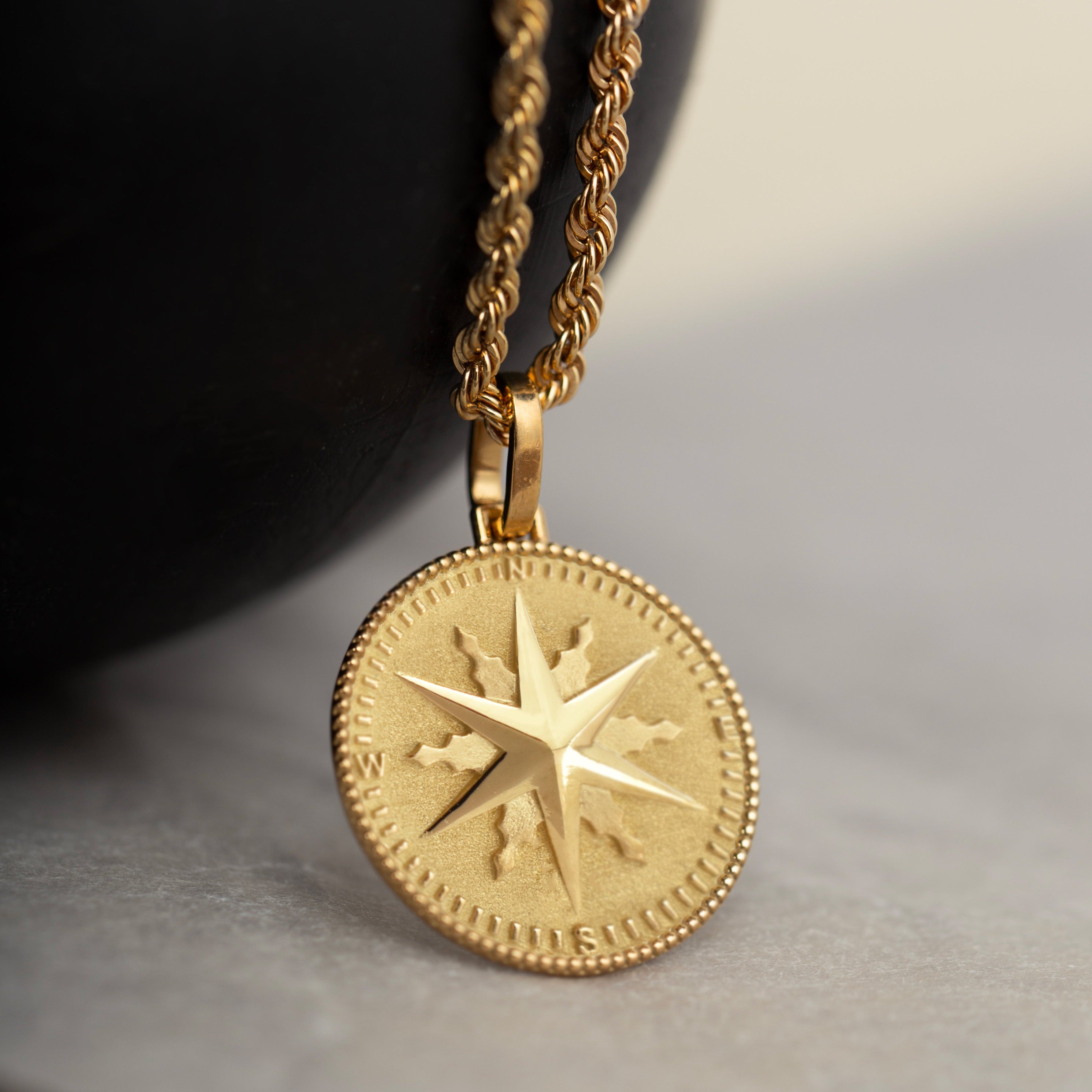 Our collection of round pendants with unique designs on top are made for both men and women. Our Compass necklace can be personalized on the back with a custom message of your choice.