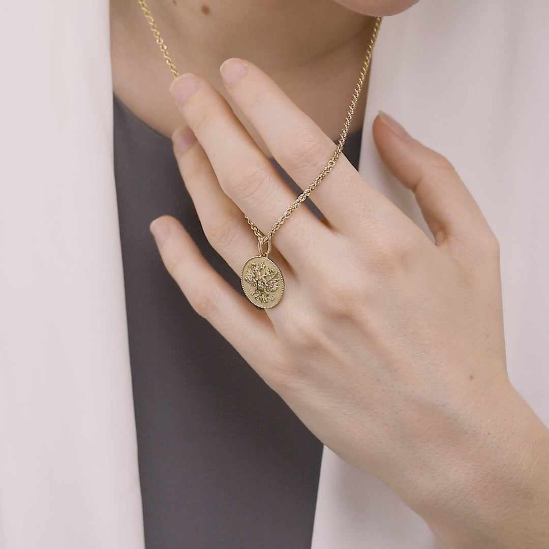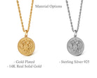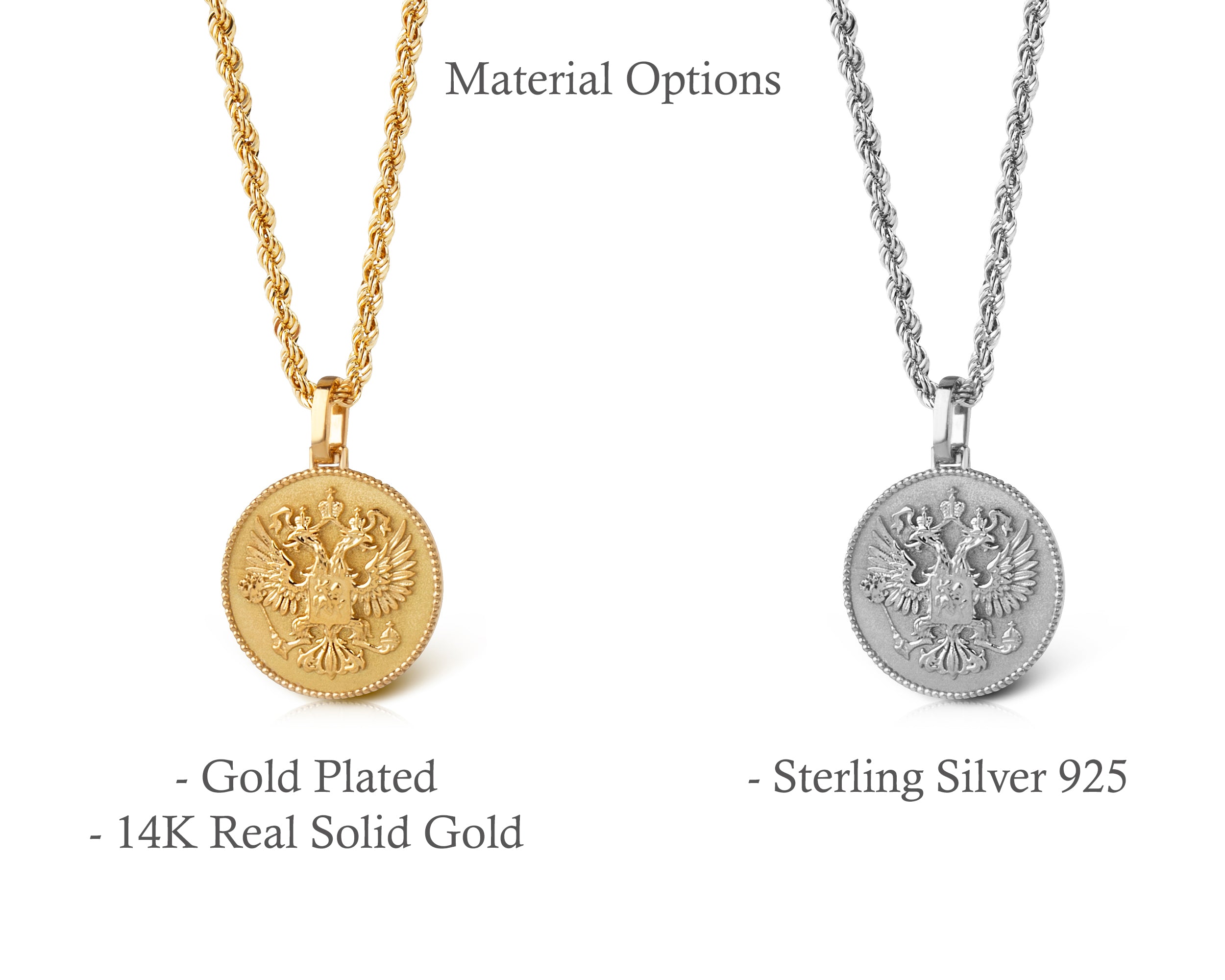 Our collection of round pendants with unique designs on top are made for both men and women. Our Double-headed eagle necklace can be personalized on the back with a custom message of your choice.