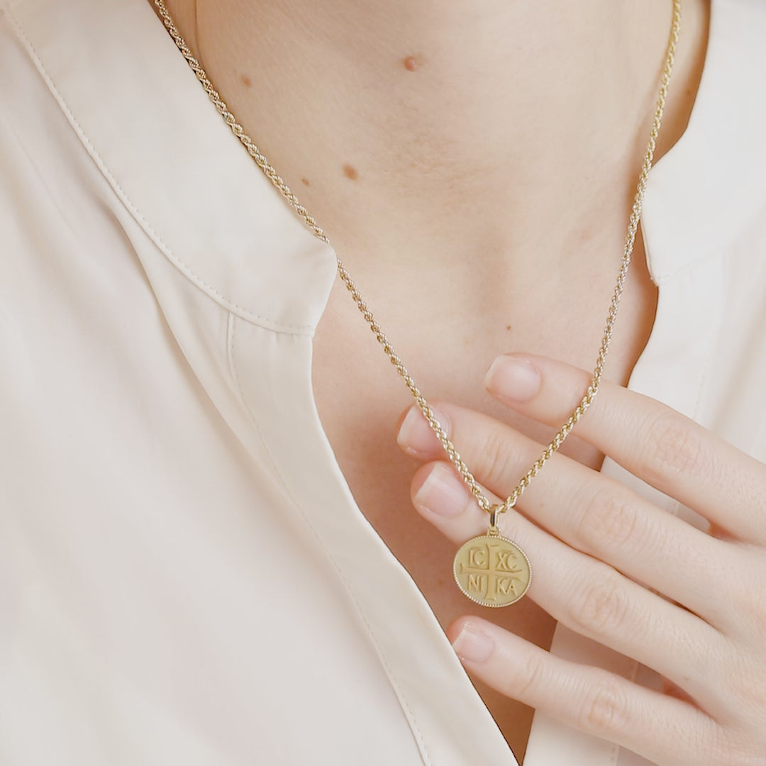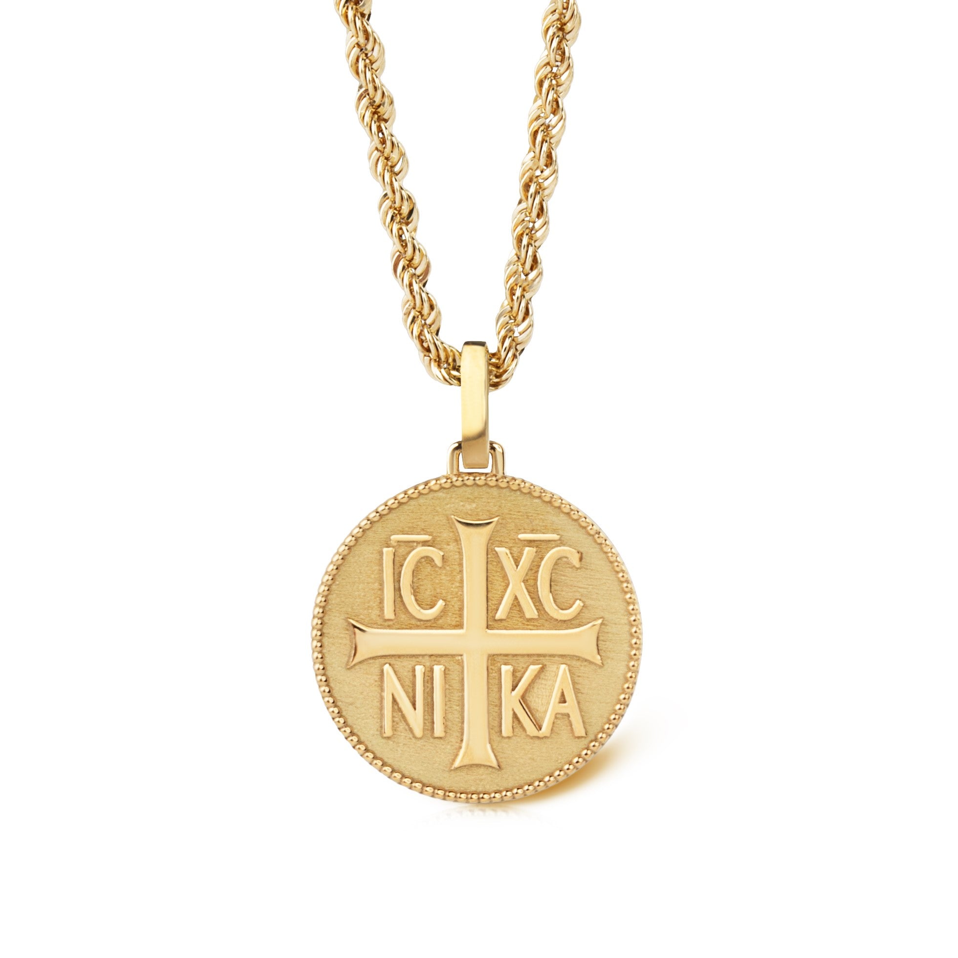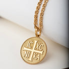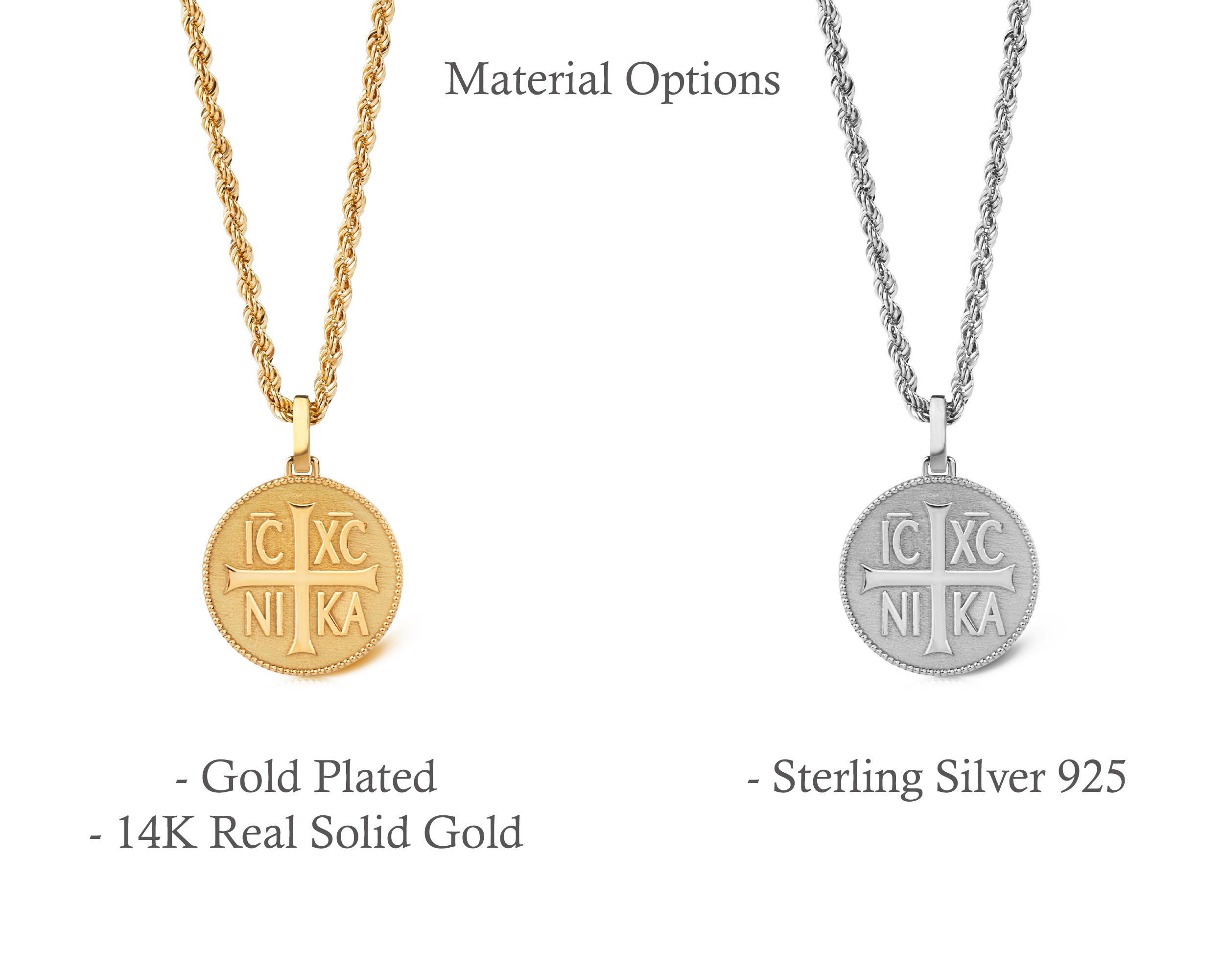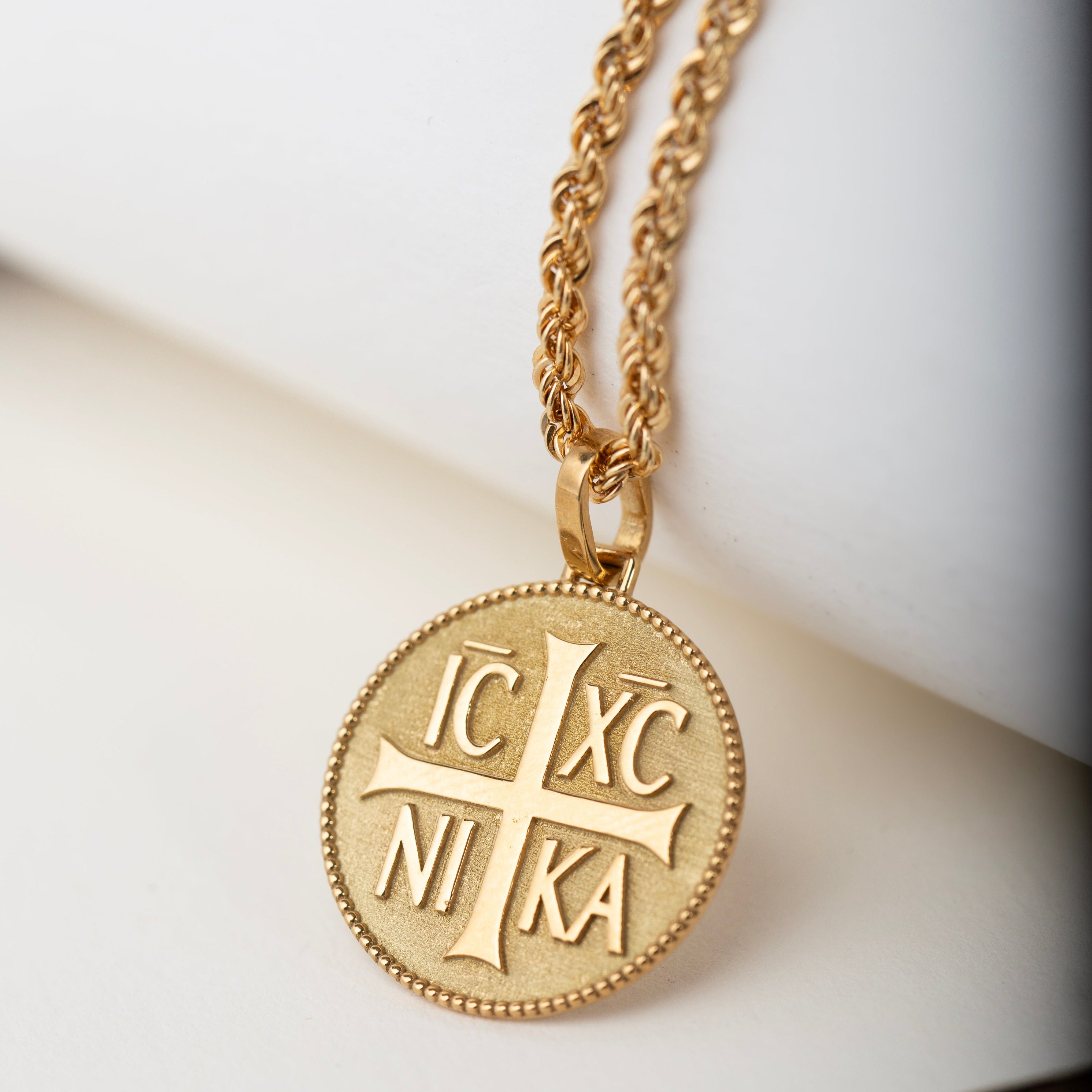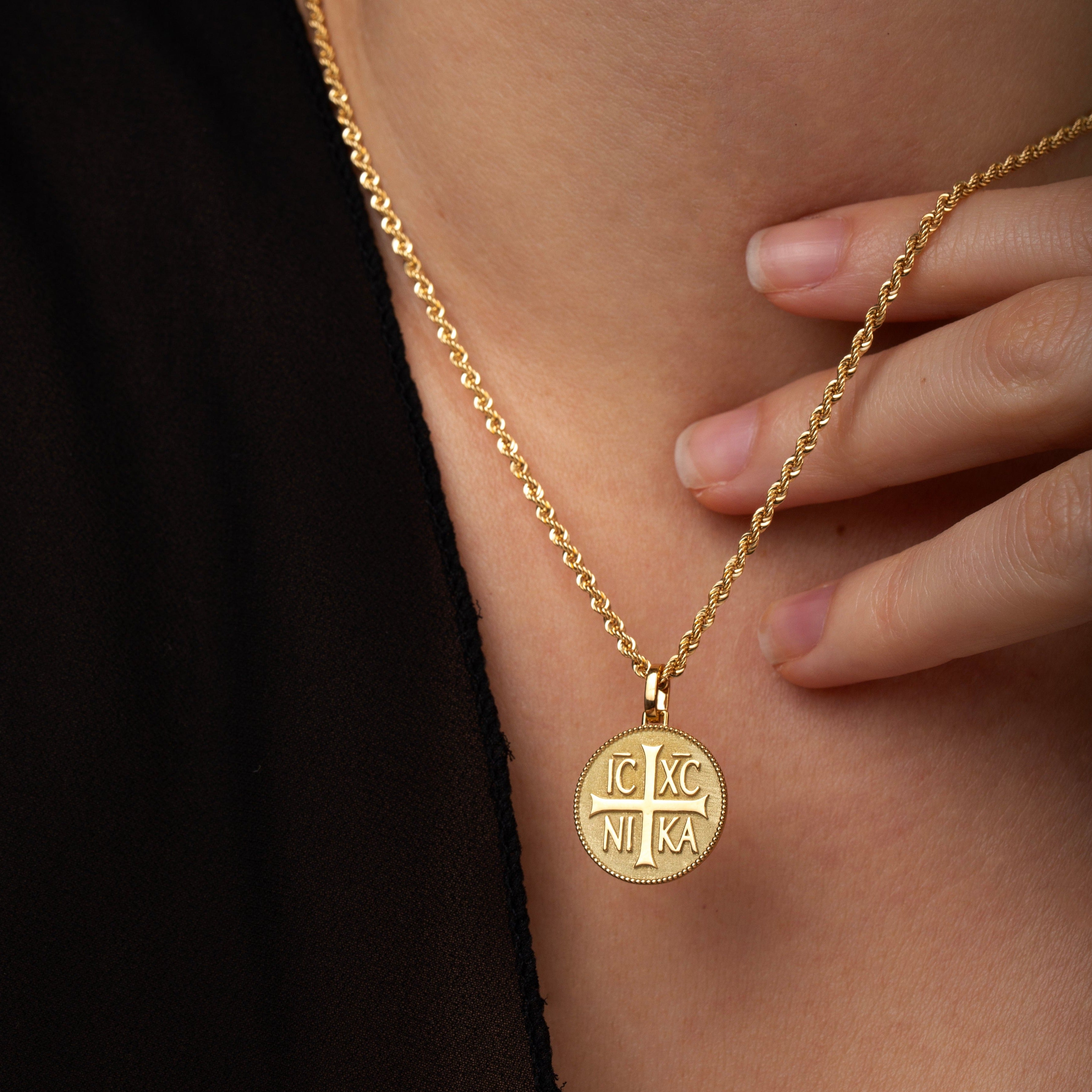 Our collection of round pendants with unique designs on top are made for both men and women. Our ICXC Nika necklace can be personalized on the back with a custom message of your choice.