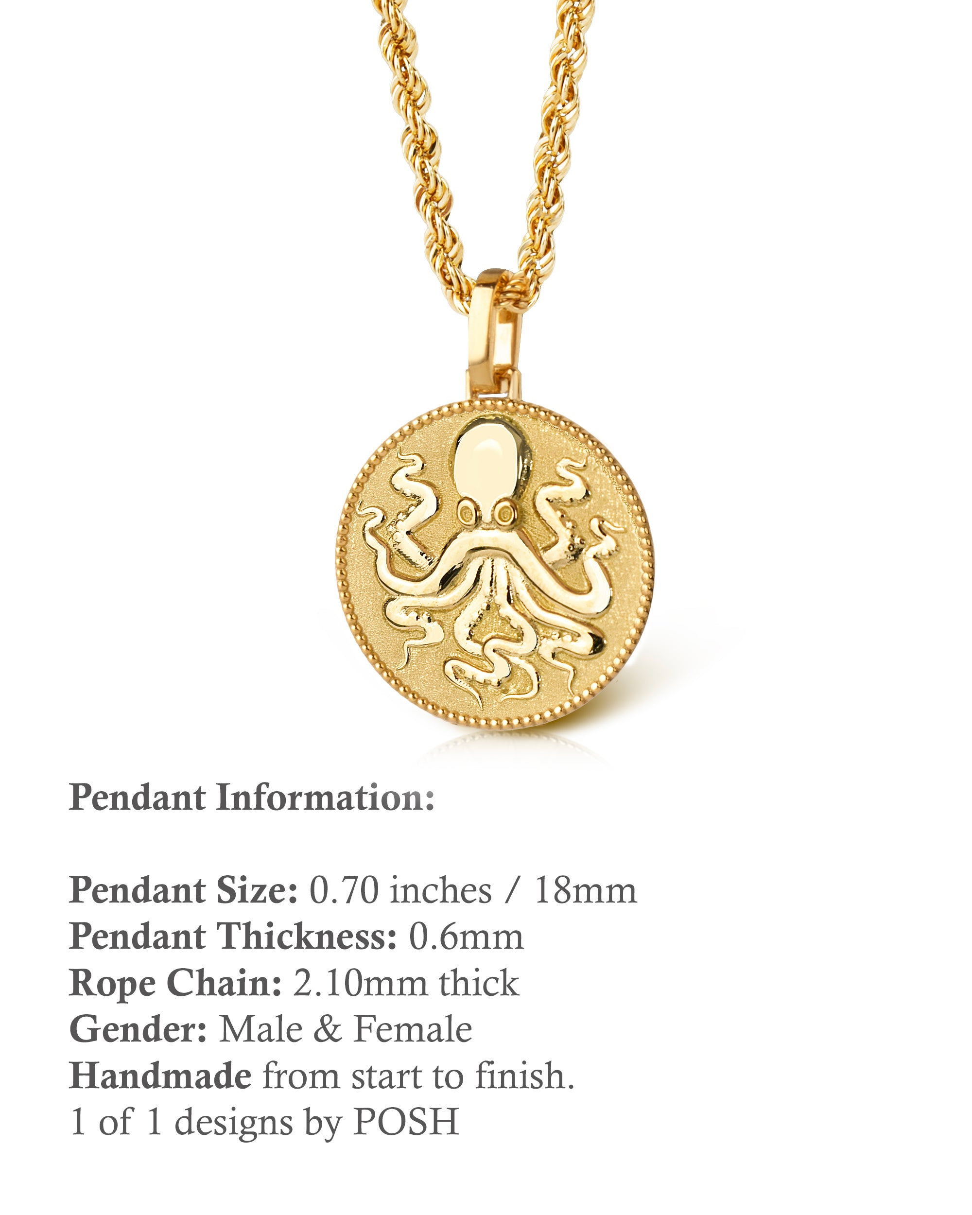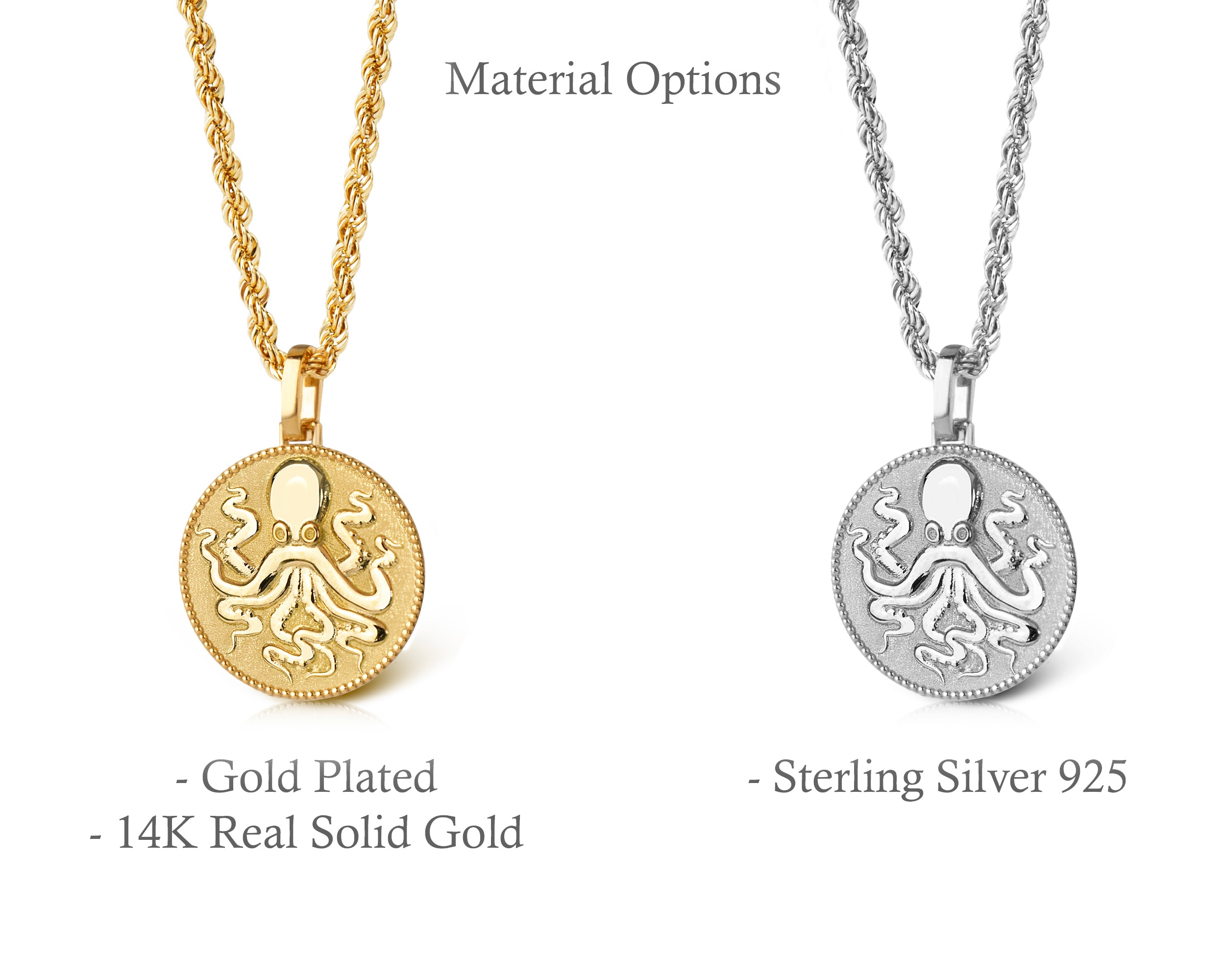 Our collection of round pendants with unique designs on top are made for both men and women. Our octopus necklace can be personalized on the back with a custom message of your choice.