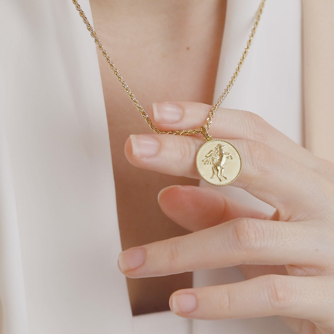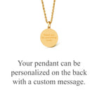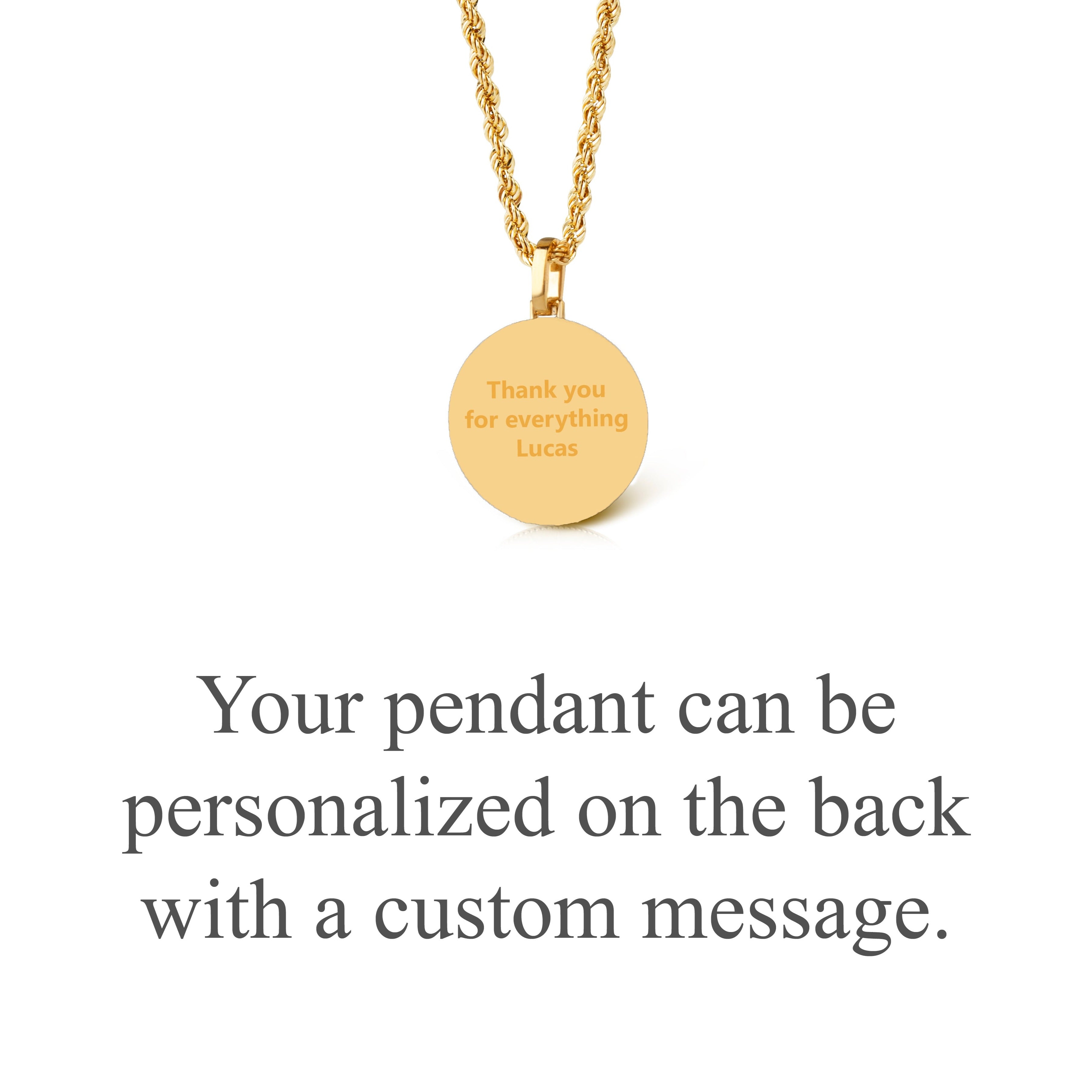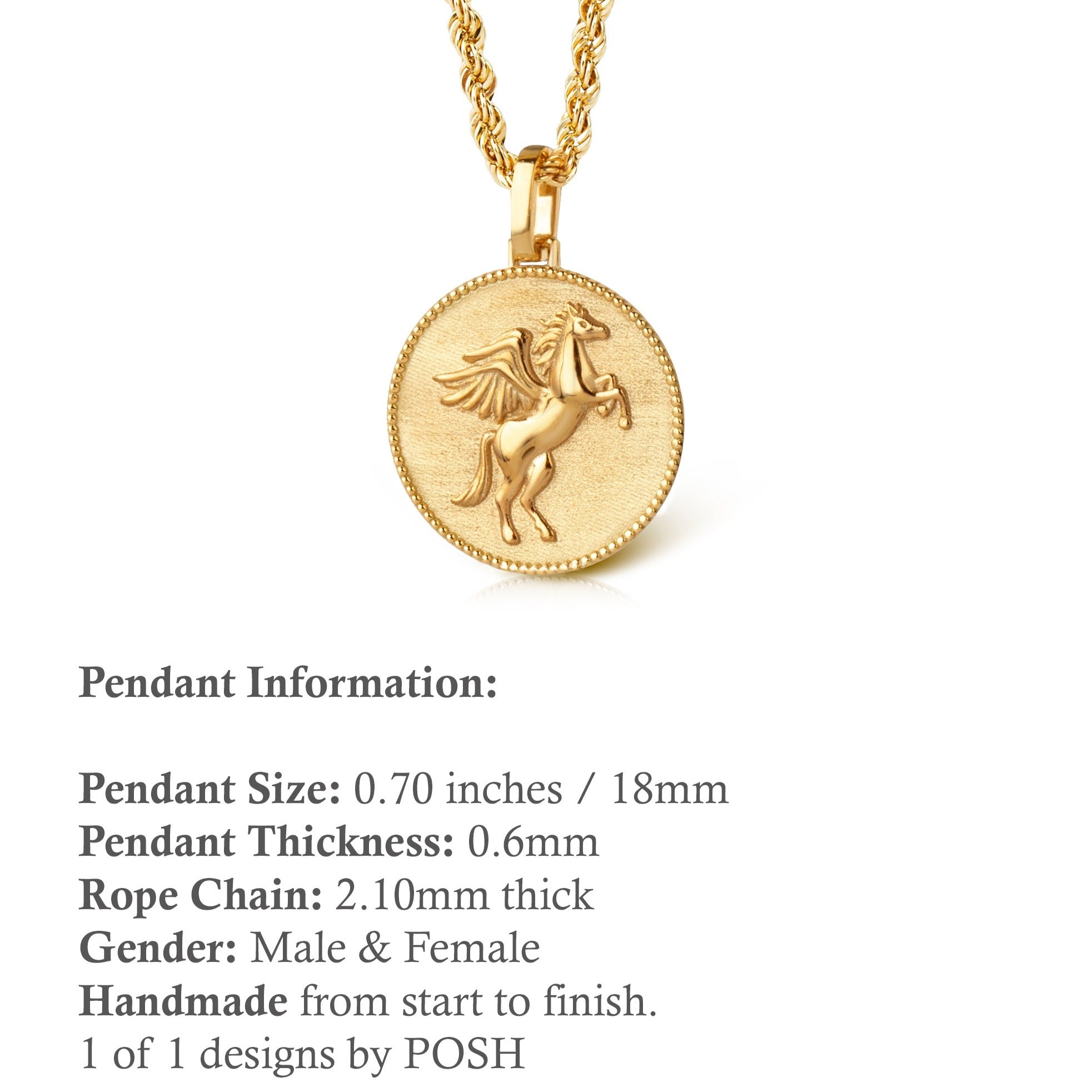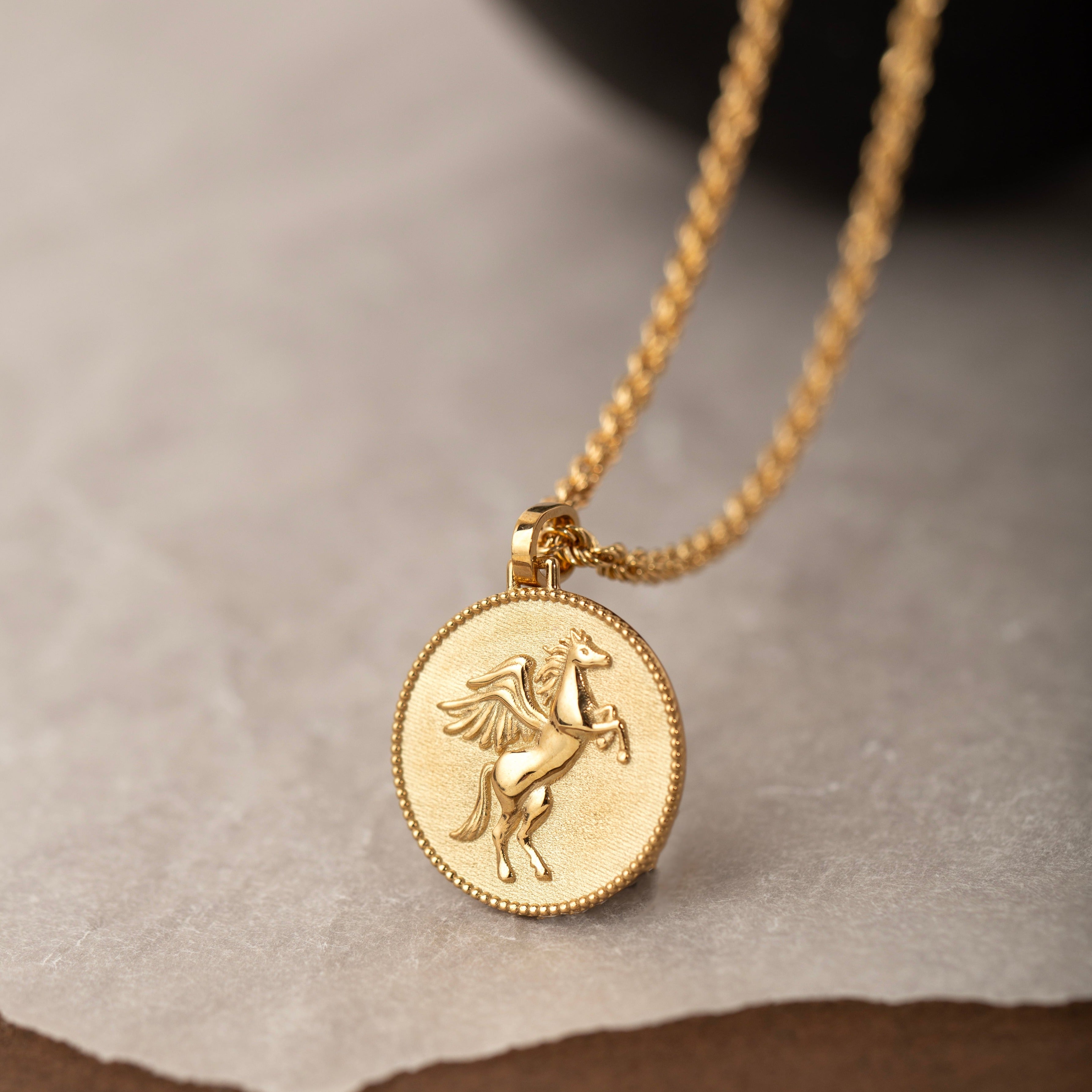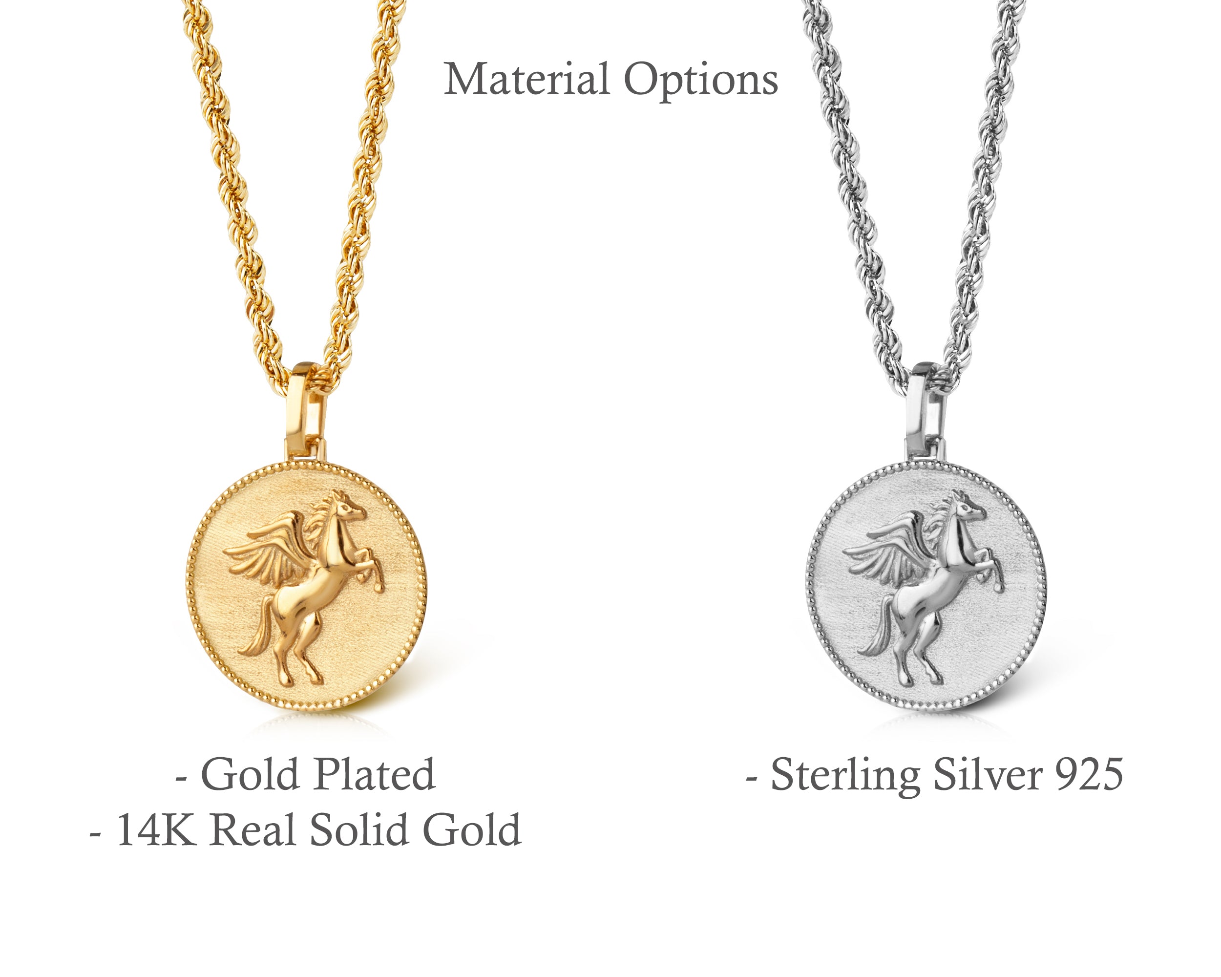 Our collection of round pendants with unique designs on top are made for both men and women. Our pegasus necklace can be personalized on the back with a custom message of your choice.