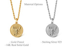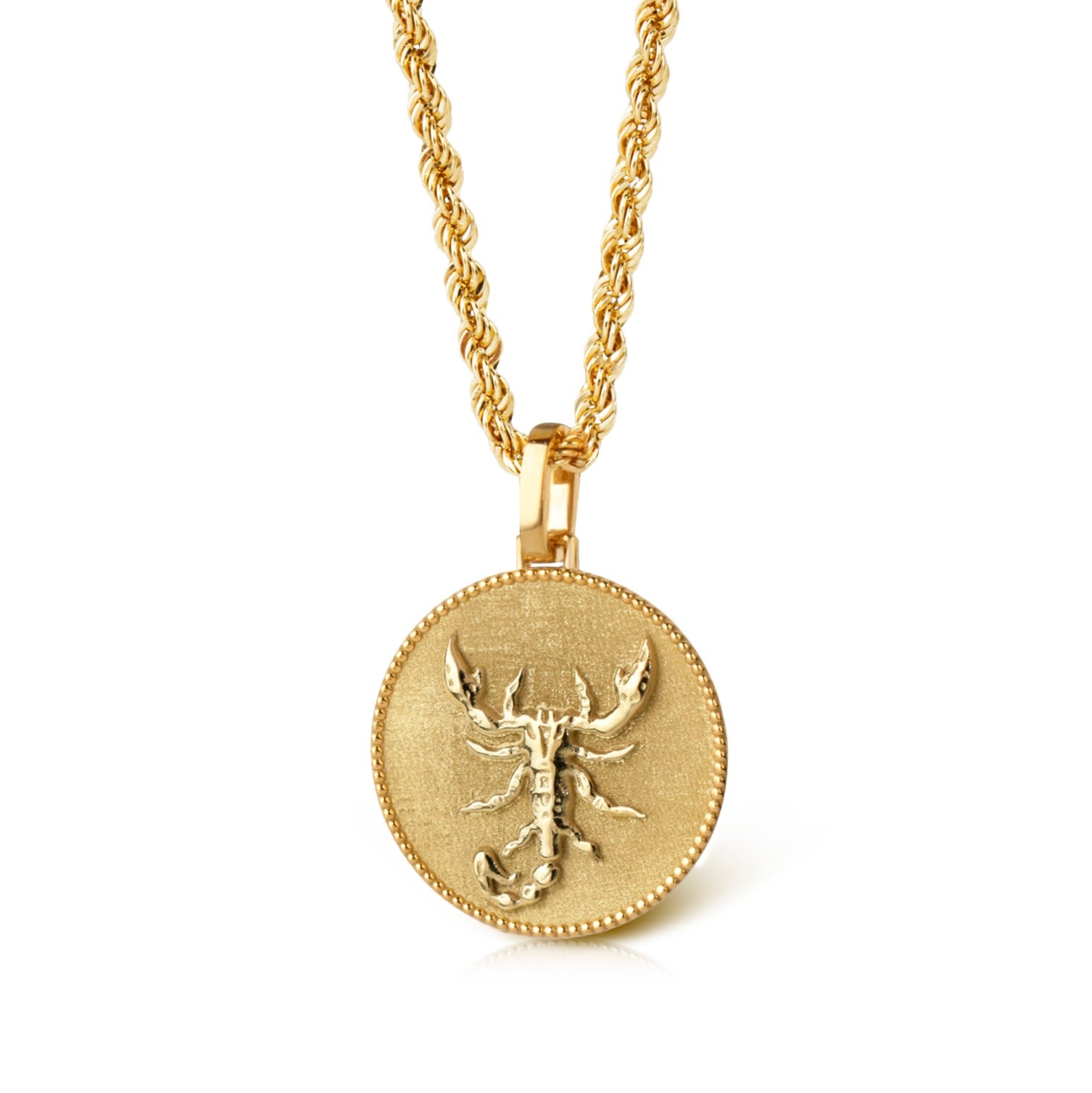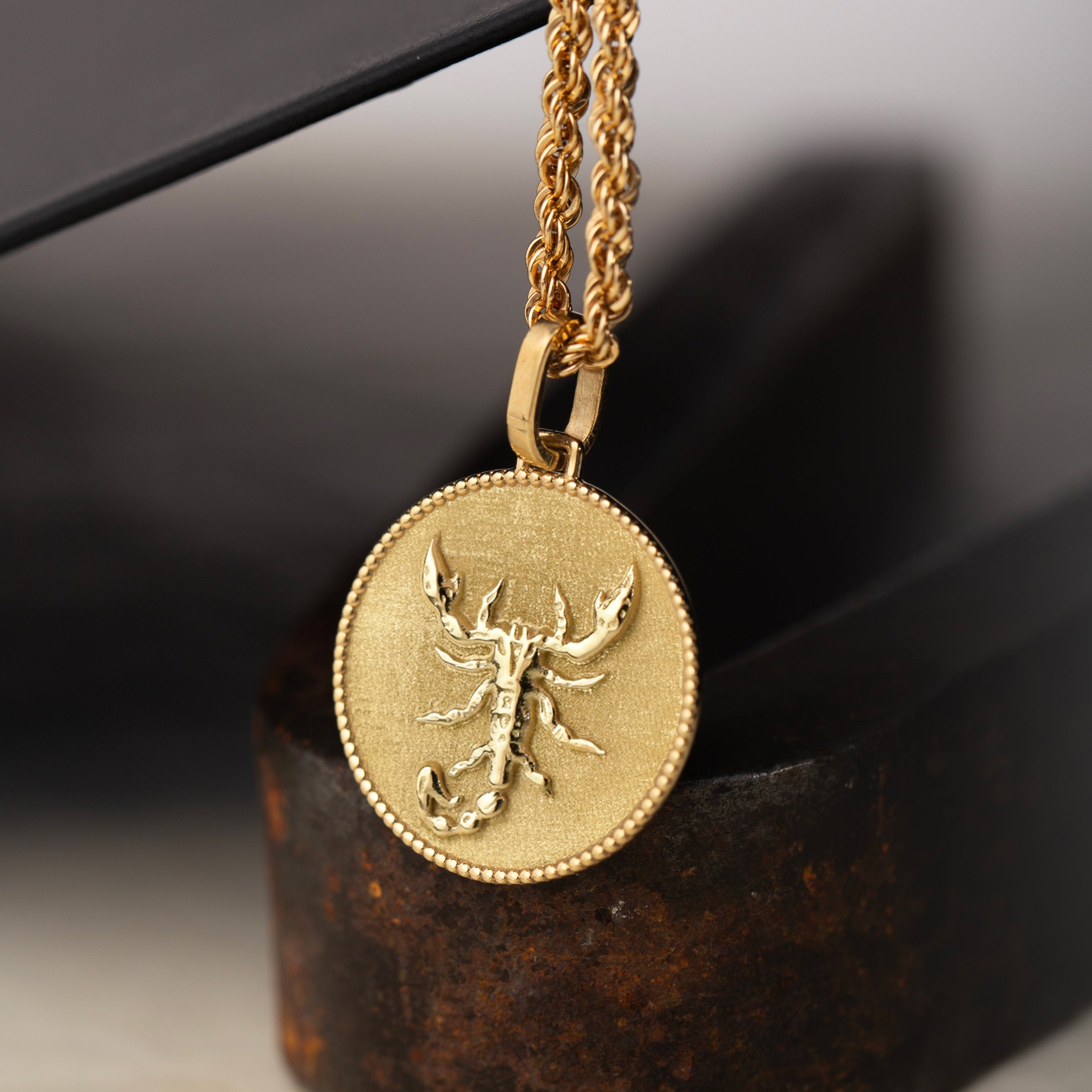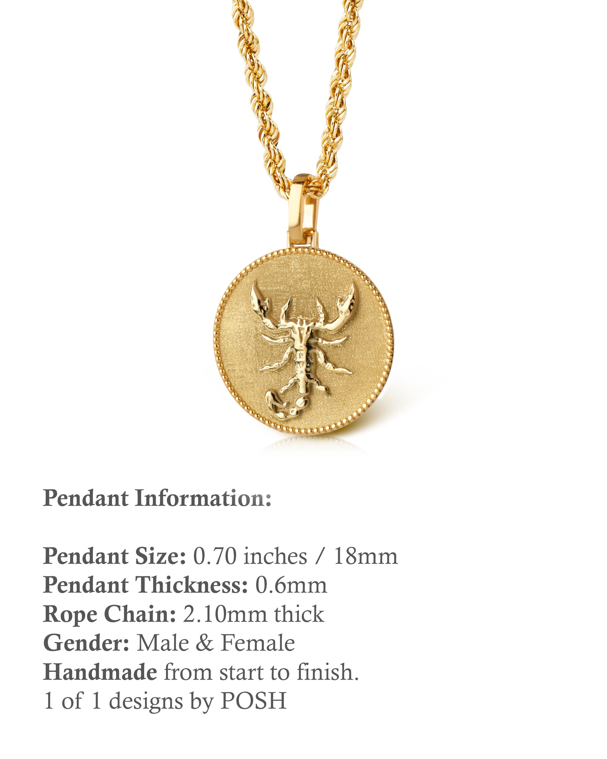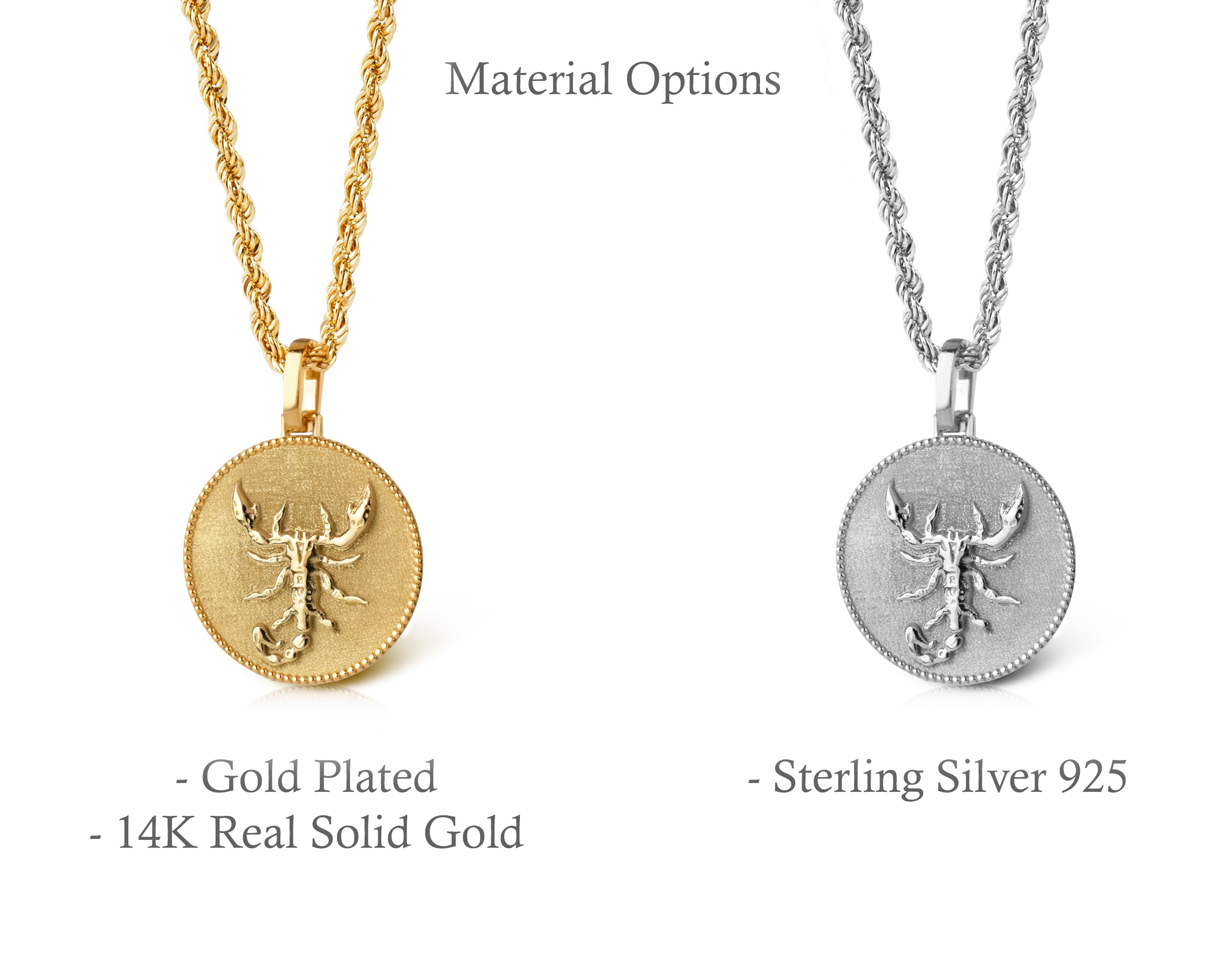 Our collection of round pendants with unique designs on top are made for both men and women. Our scorpion necklace can be personalized on the back with a custom message of your choice.