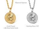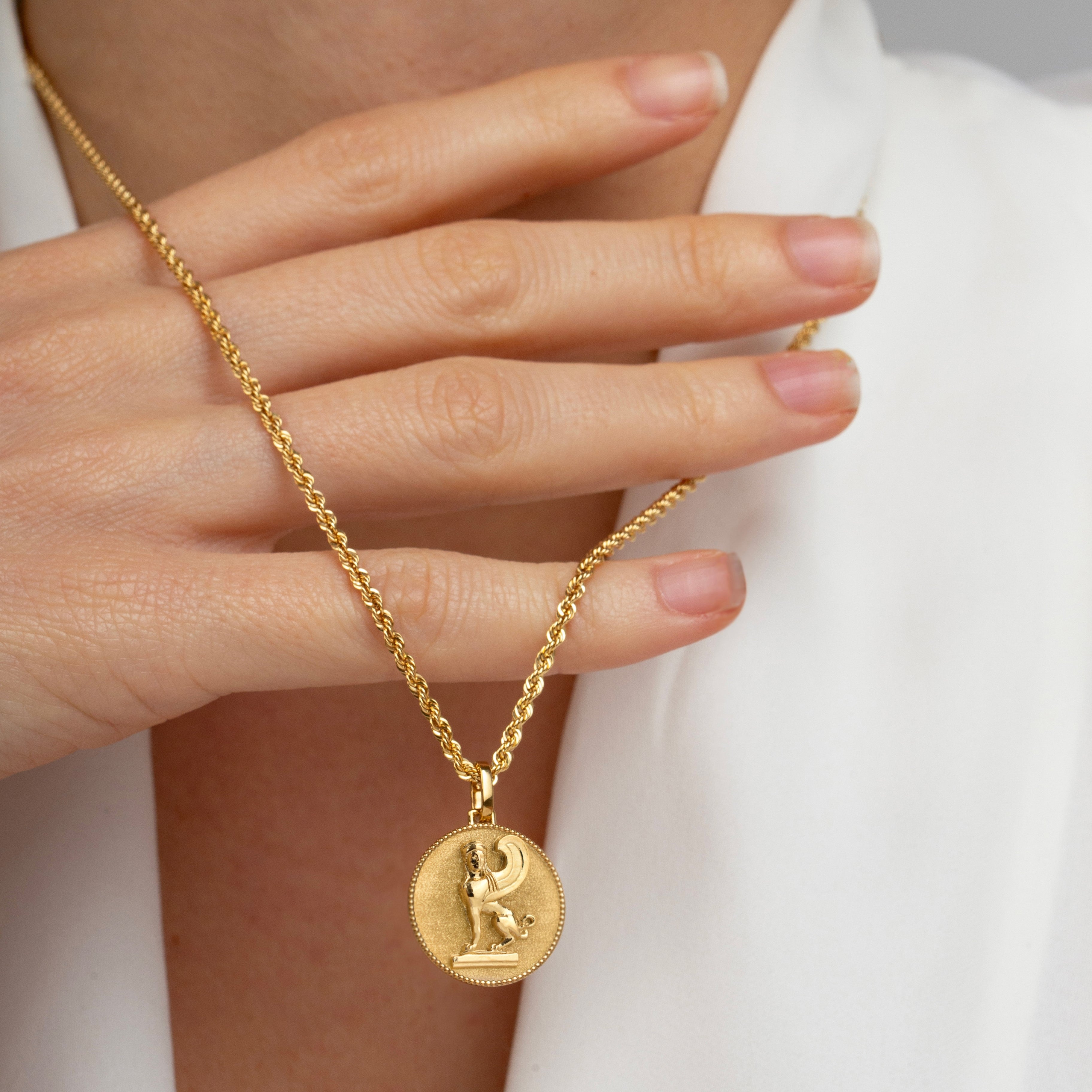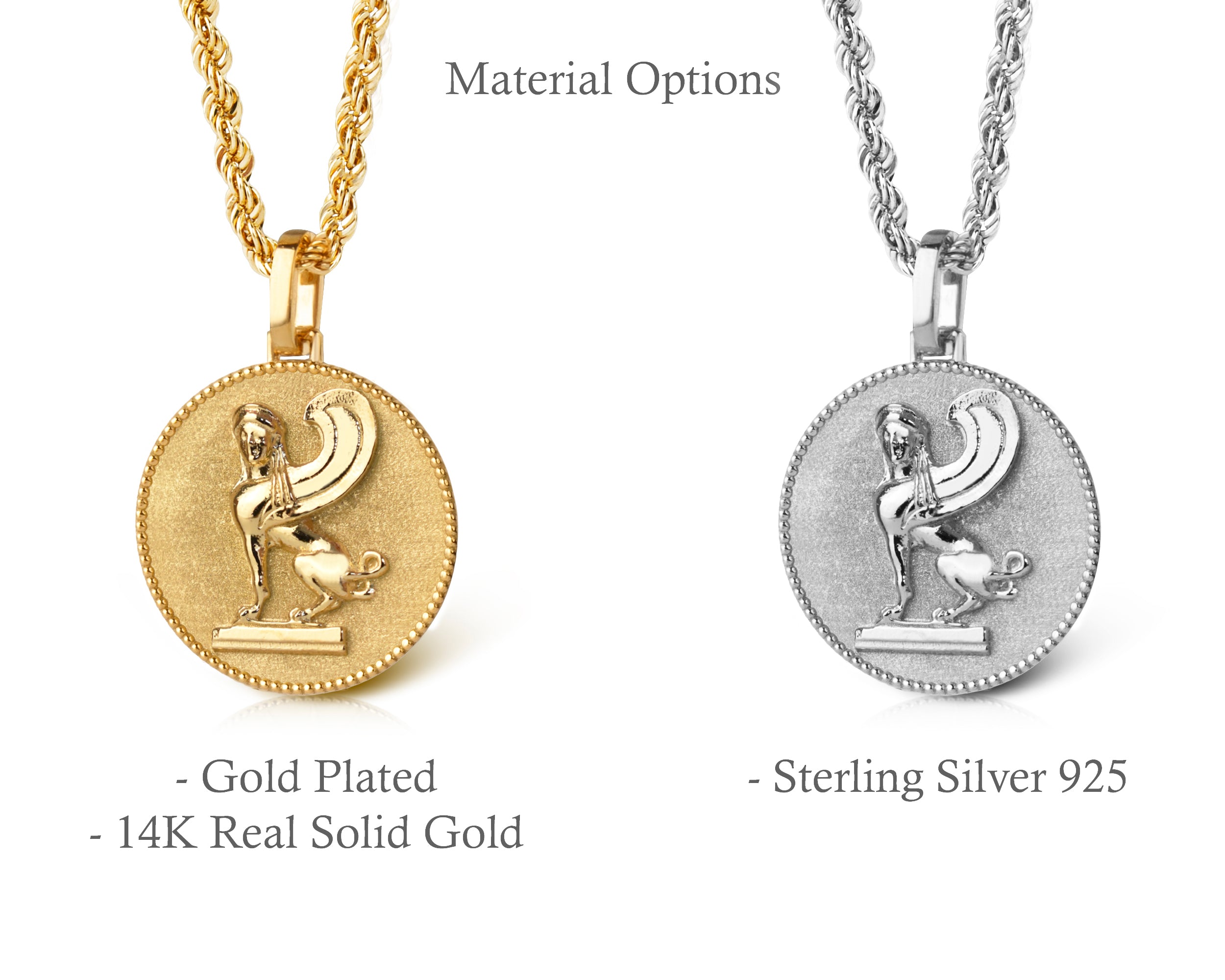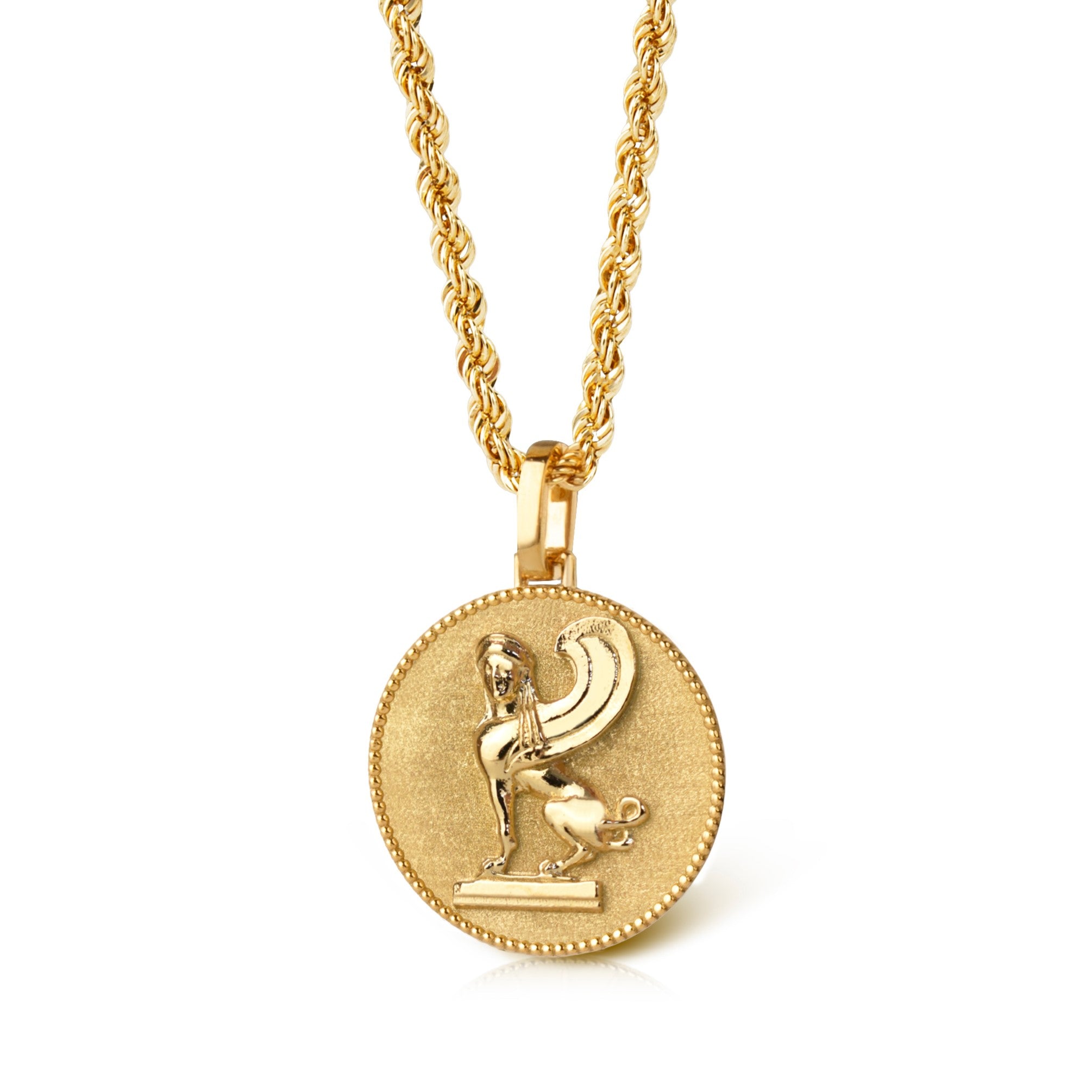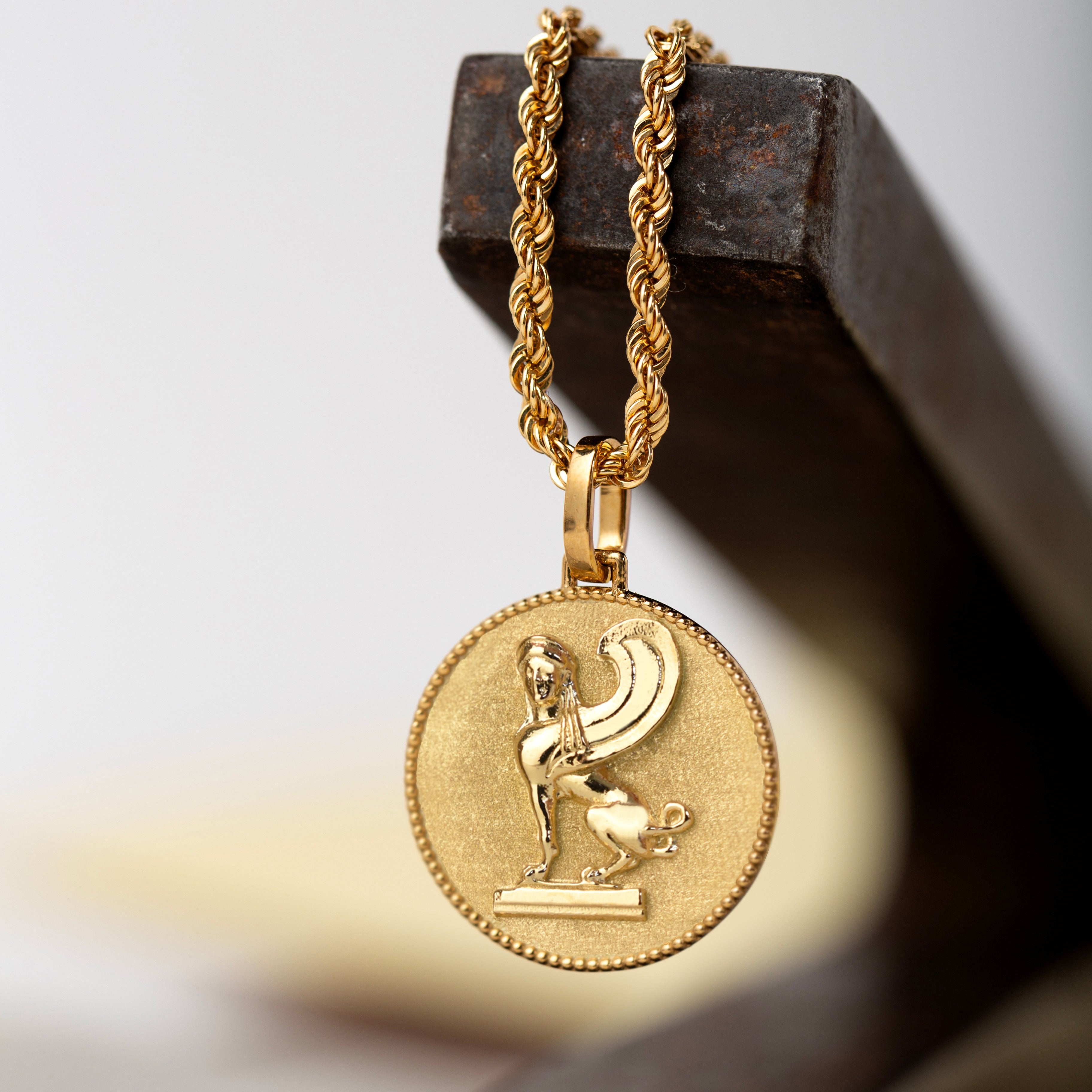 Our collection of round pendants with unique designs on top are made for both men and women. Our Sphinx necklace can be personalized on the back with a custom message of your choice.