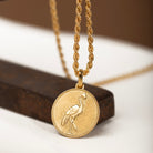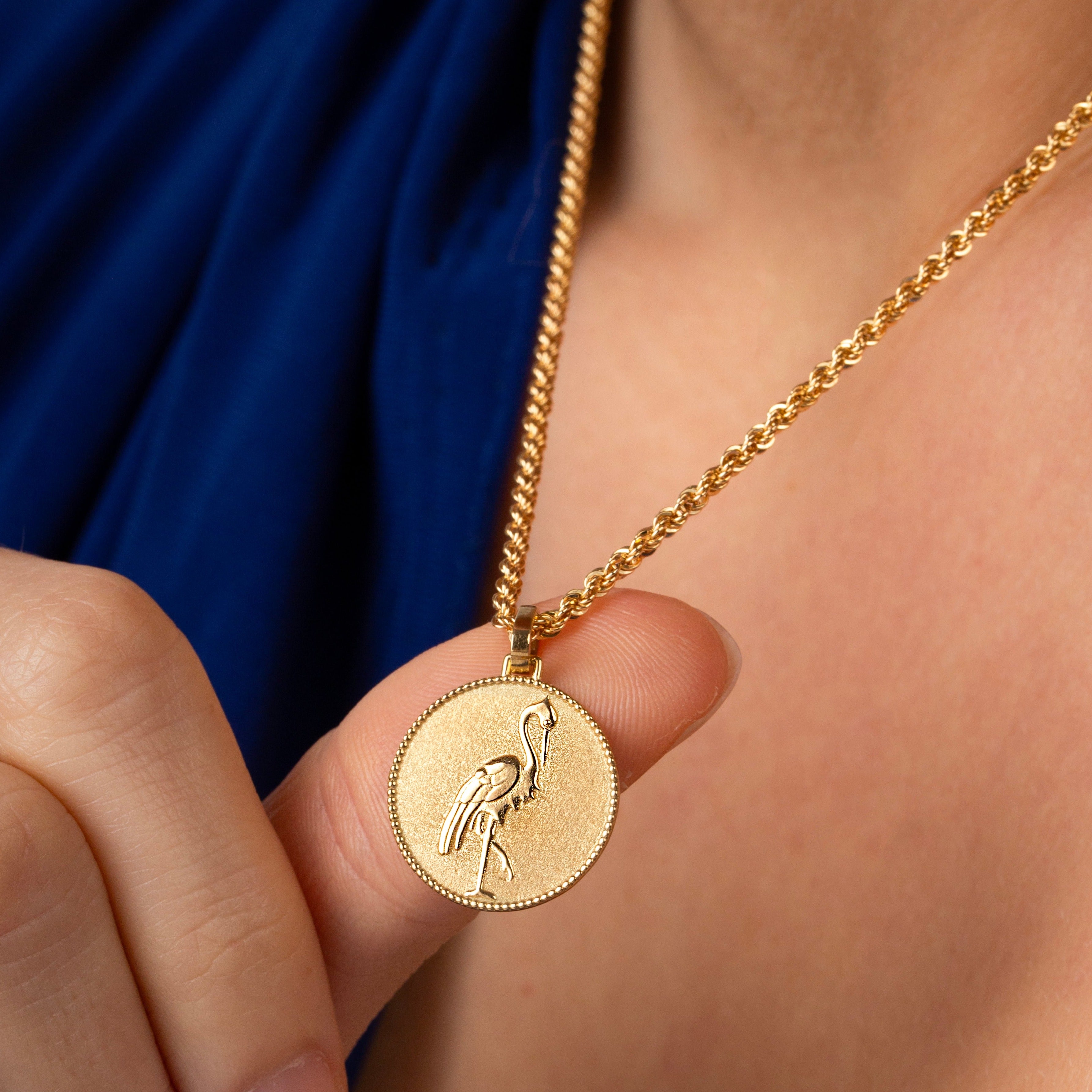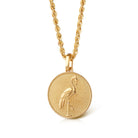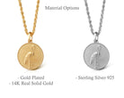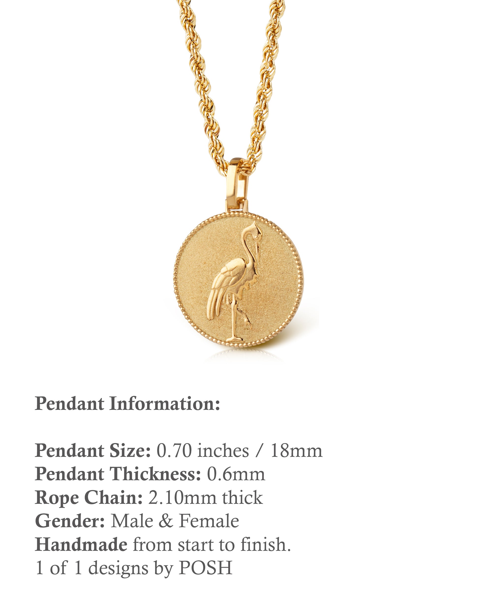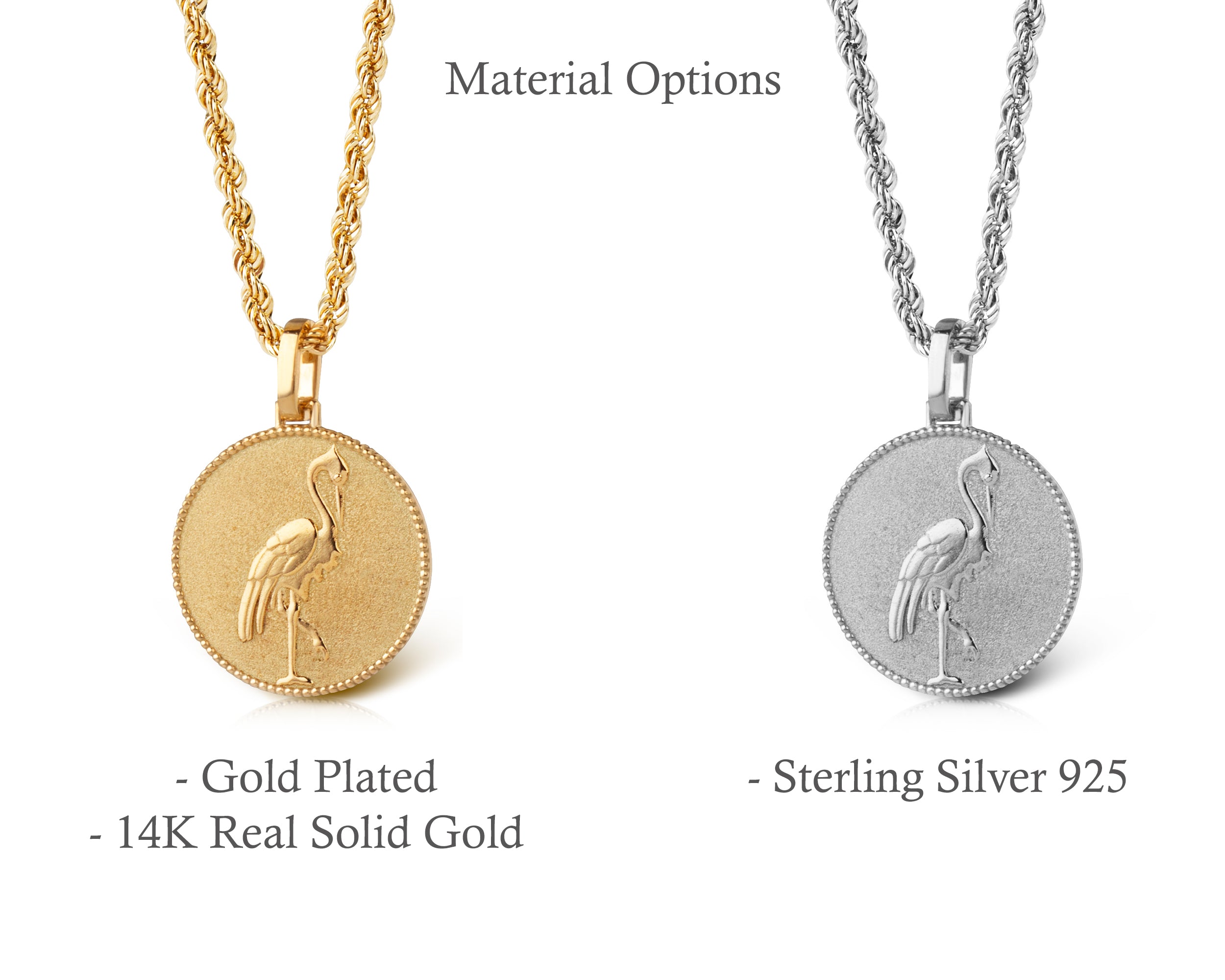 Our collection of round pendants with unique designs on top are made for both men and women. Our stork necklace can be personalized on the back with a custom message of your choice.