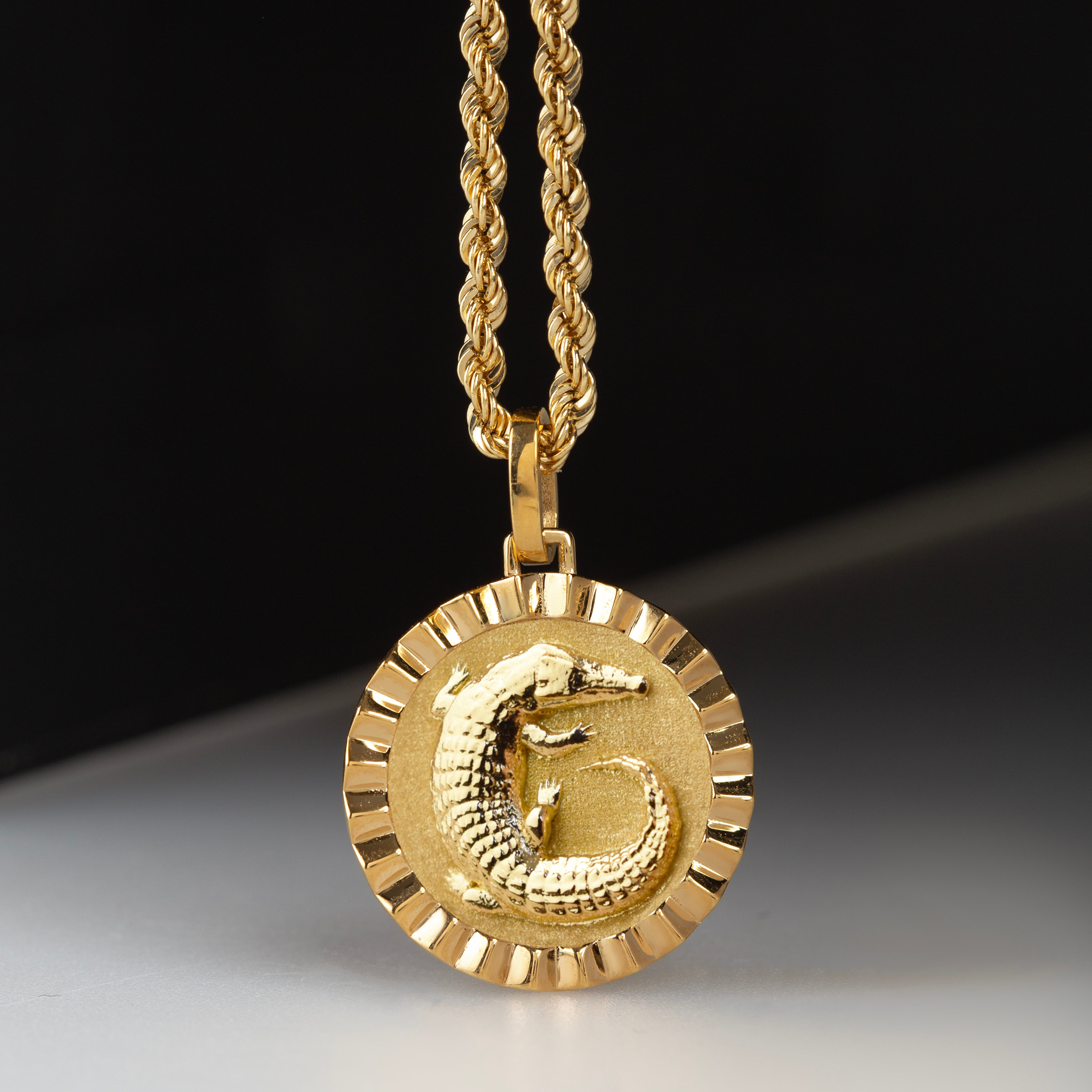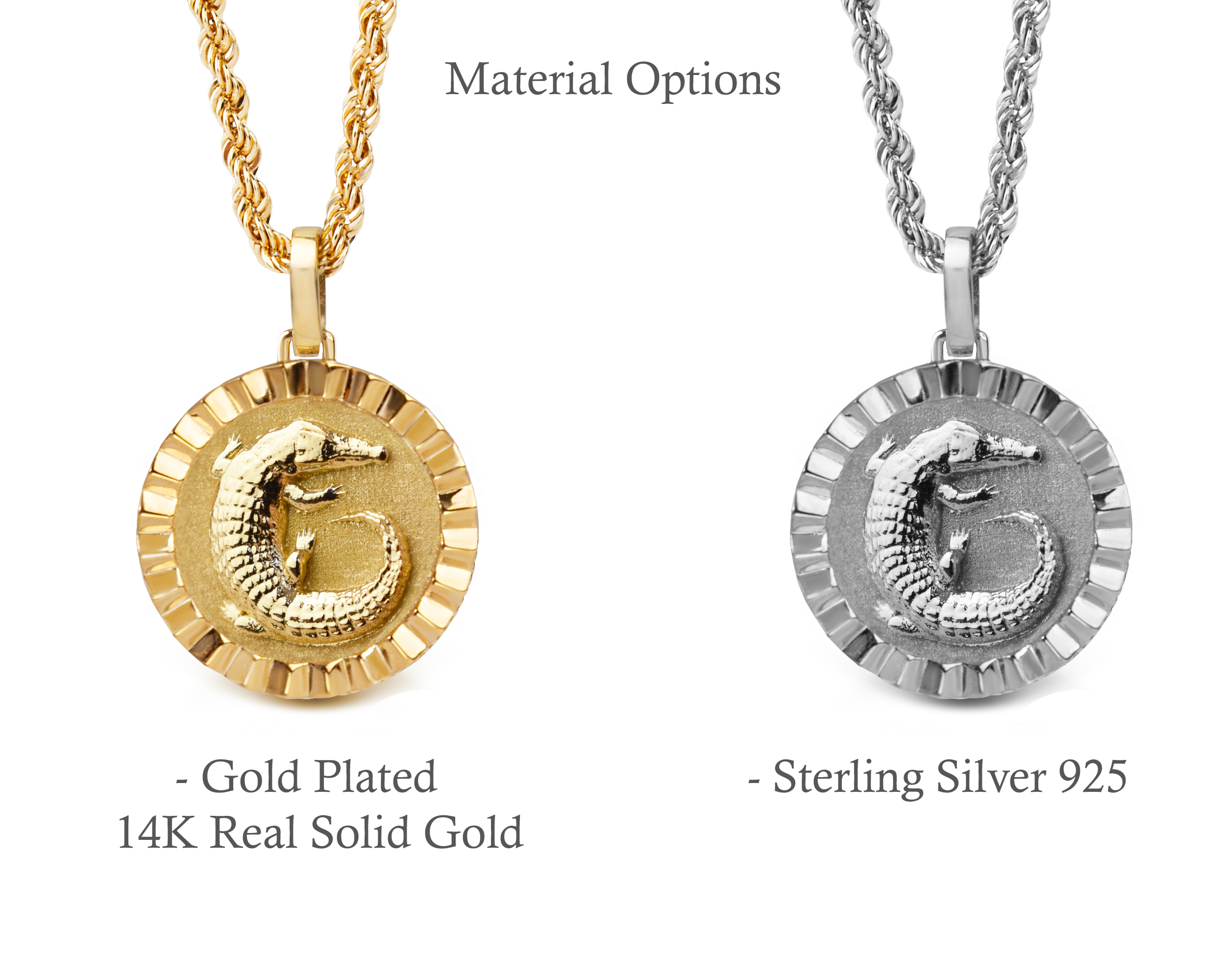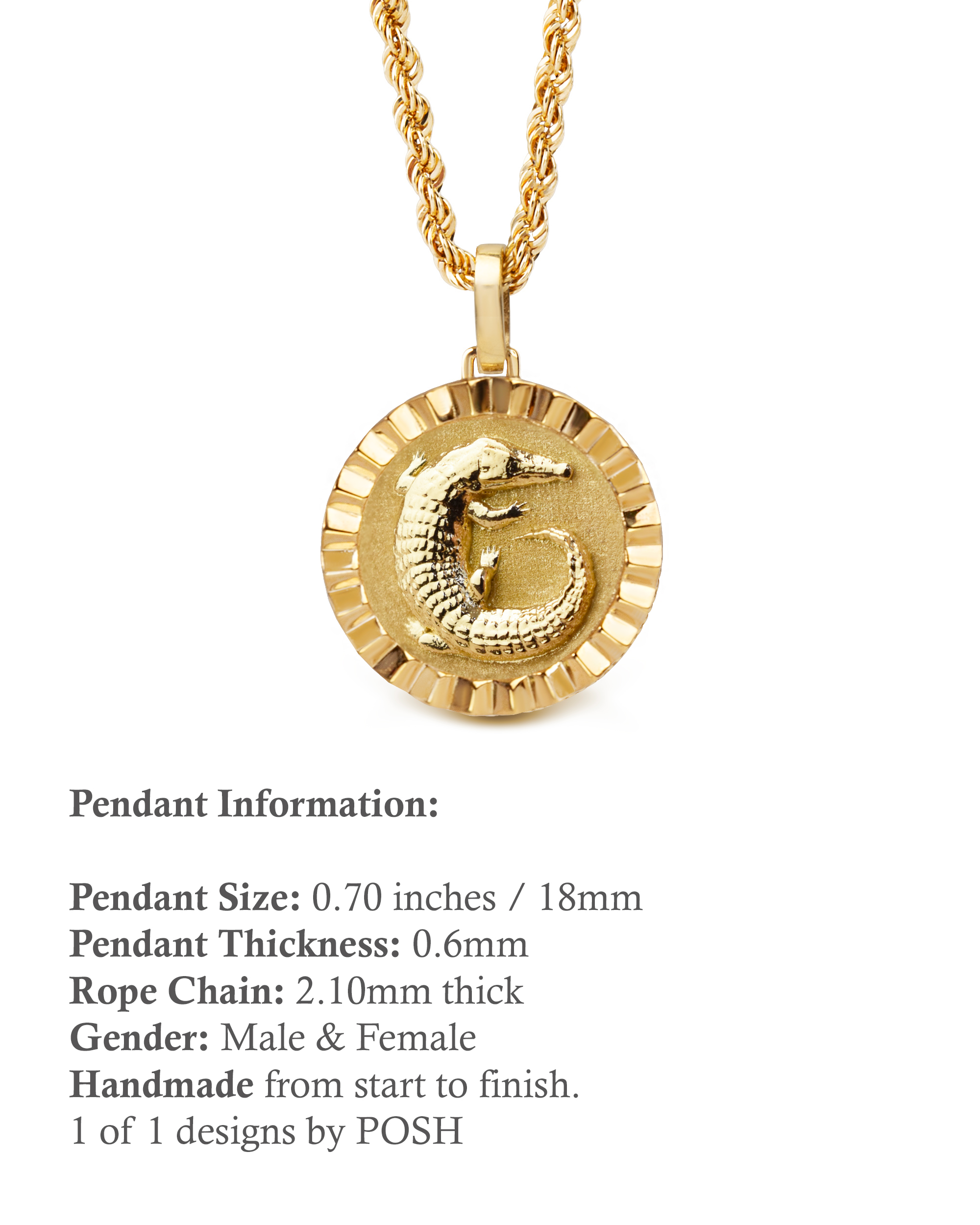 Our collection of round pendants with unique designs on top are made for both men and women. Our Crocodile necklace can be personalized on the back with a custom message of your choice.