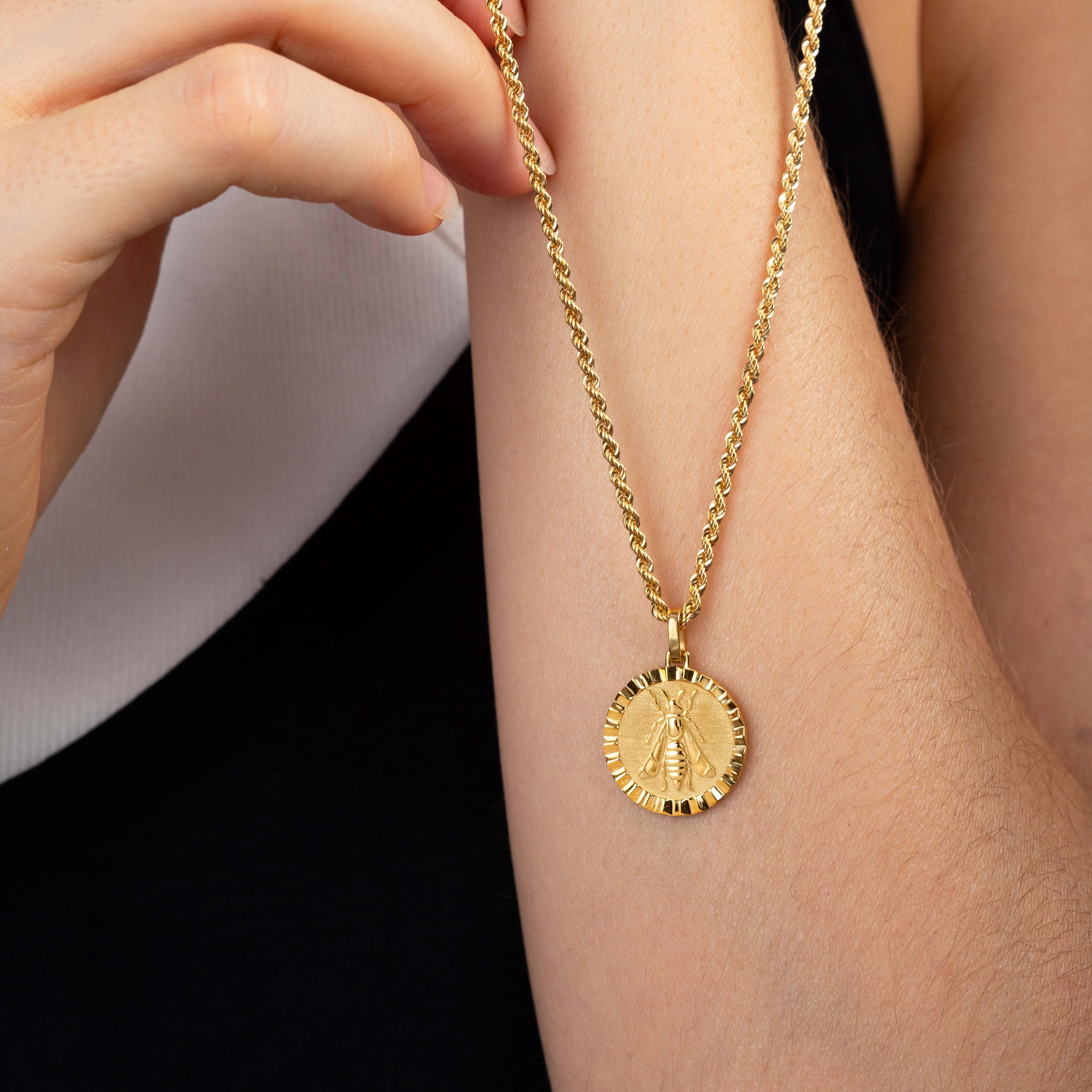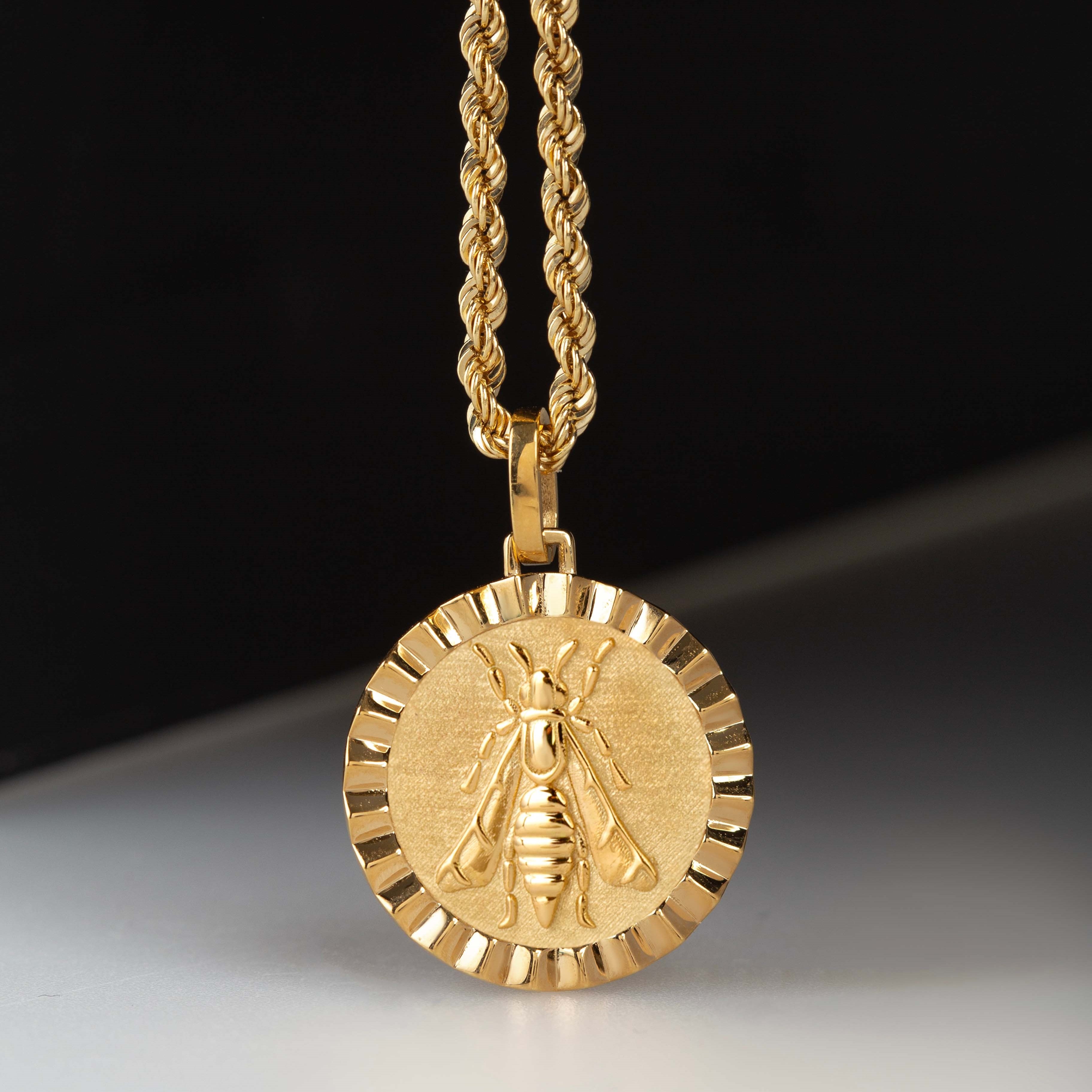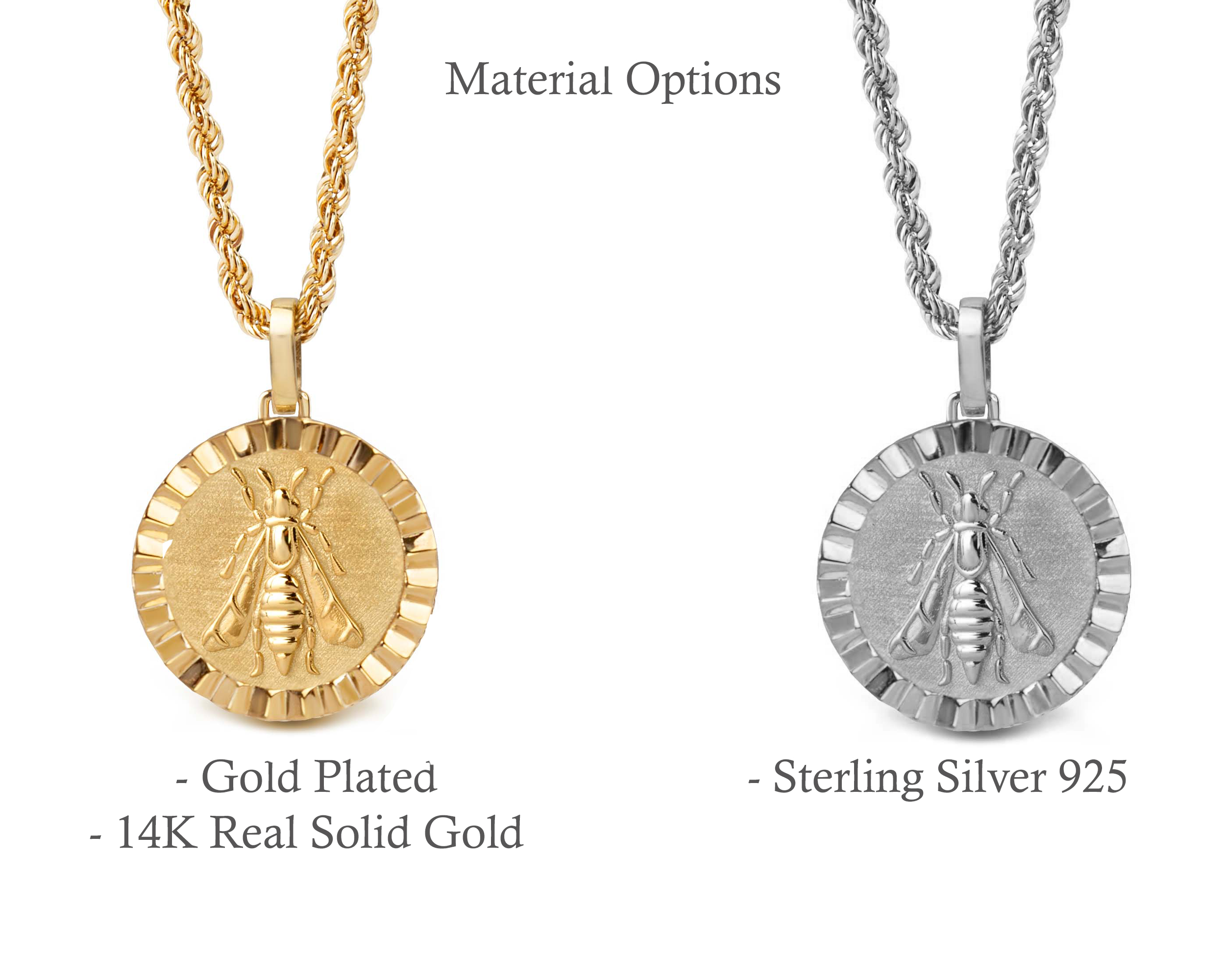 Our collection of round pendants with unique designs on top are made for both men and women. Our Honeybee necklace can be personalized on the back with a custom message of your choice.