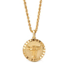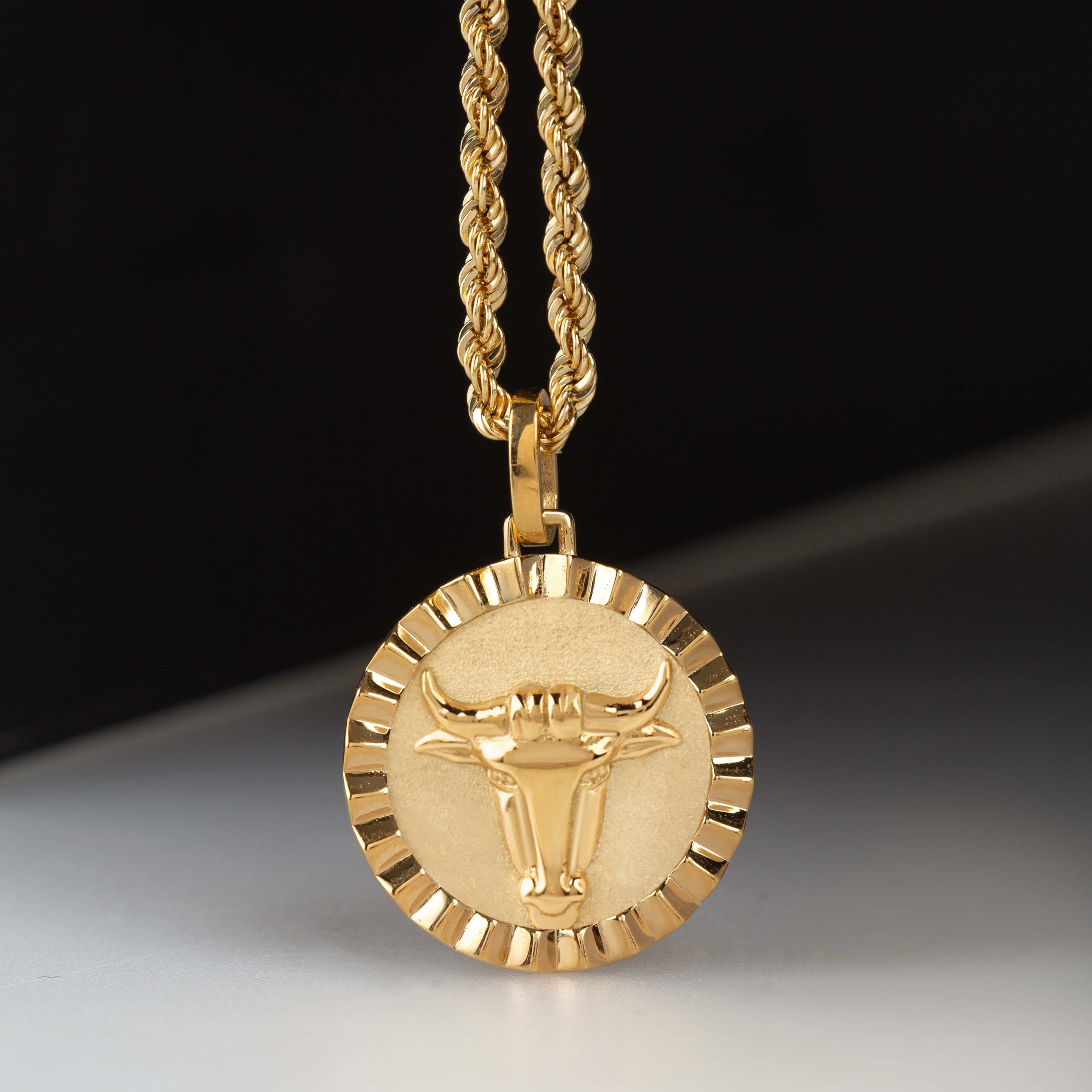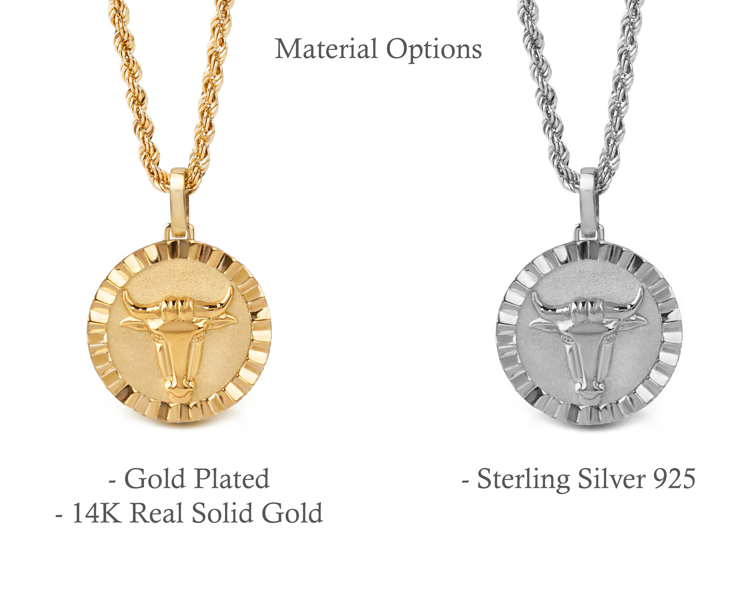 Our collection of round pendants with unique designs on top are made for both men and women. Our Bull necklace can be personalized on the back with a custom message of your choice.