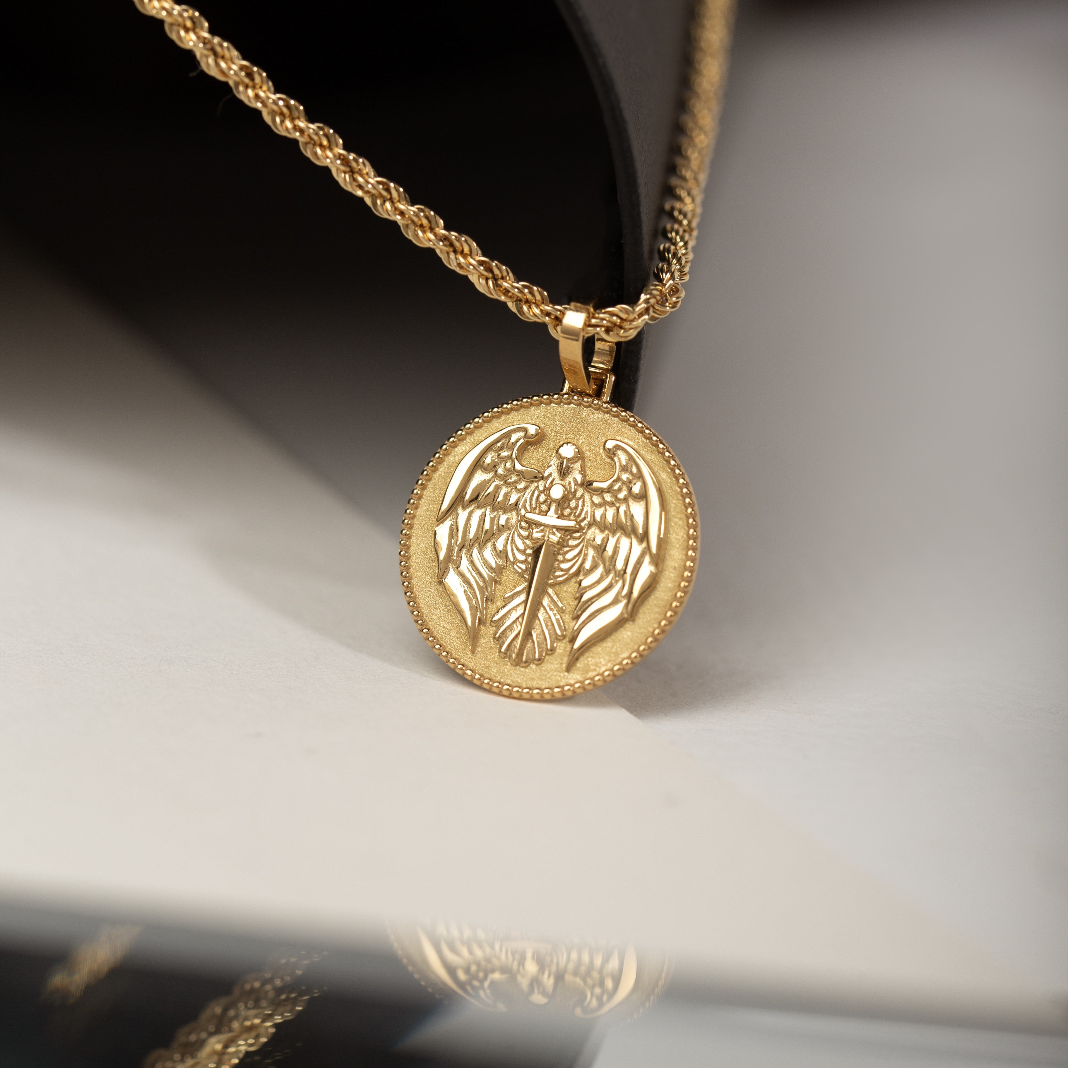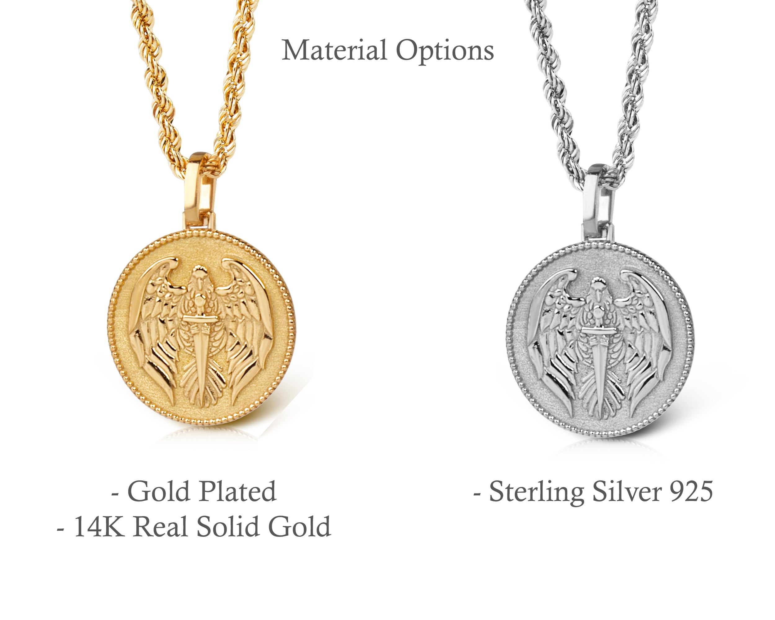 Our collection of round pendants with unique designs on top are made for both men and women. Our Sword Eagle necklace can be personalized on the back with a custom message of your choice.