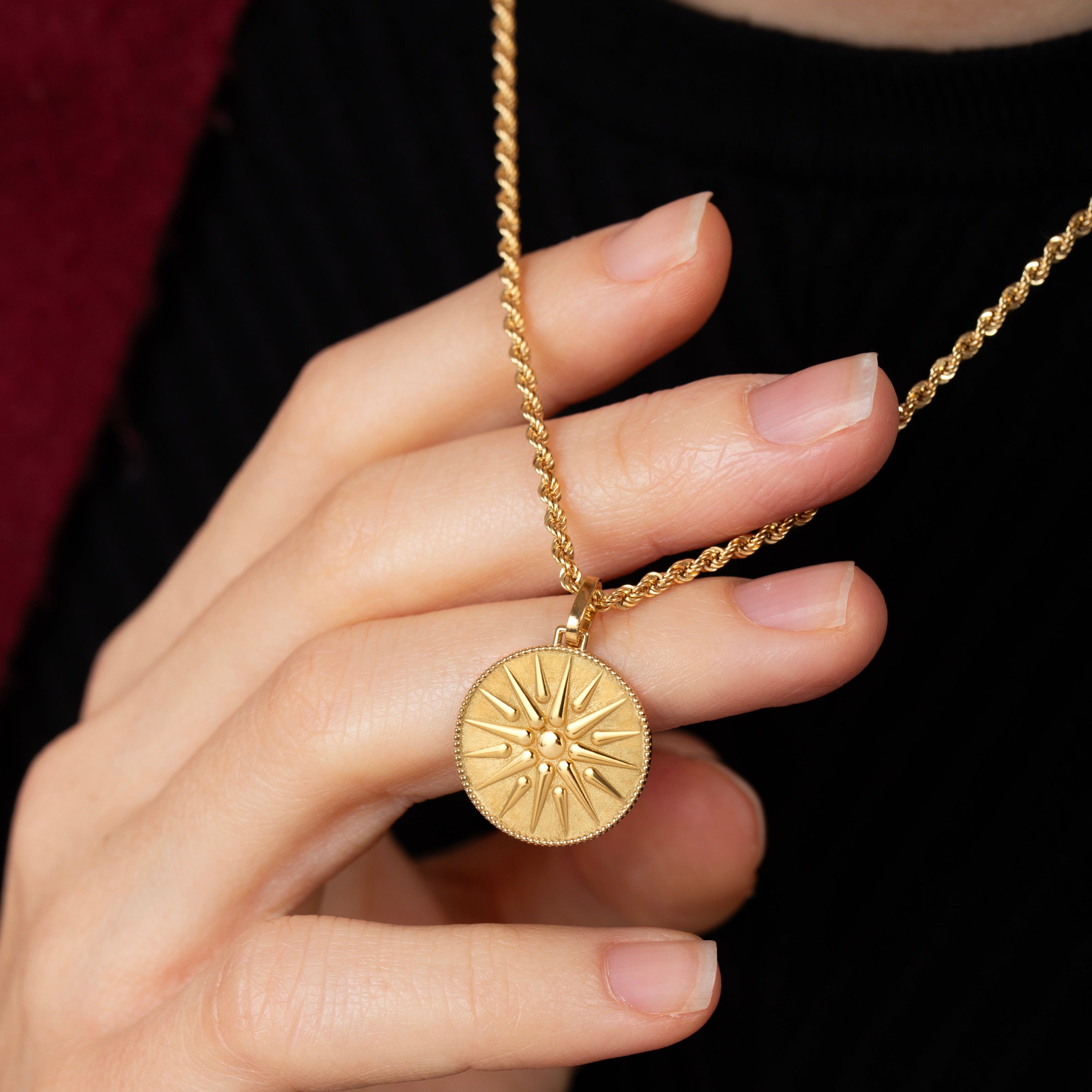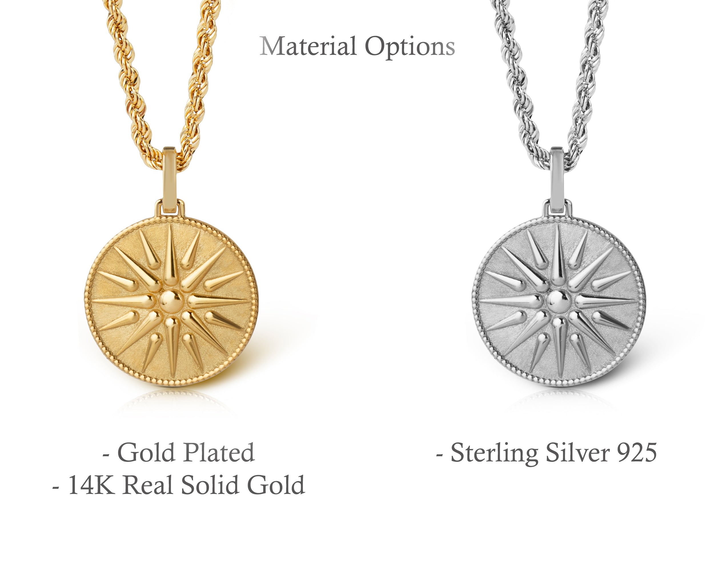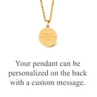 Our collection of round pendants with unique designs on top are made for both men and women. Our vergina sun necklace can be personalized on the back with a custom message of your choice.