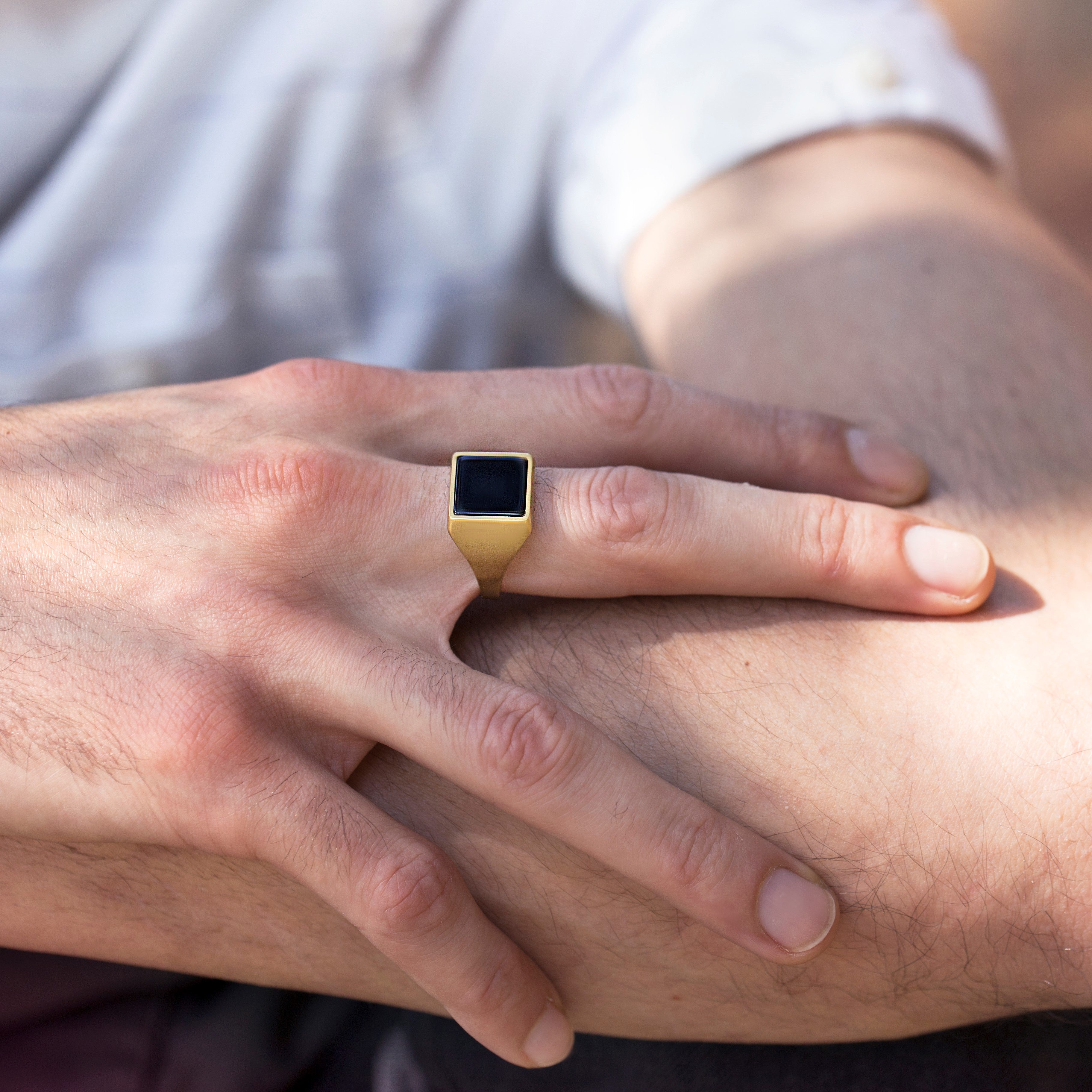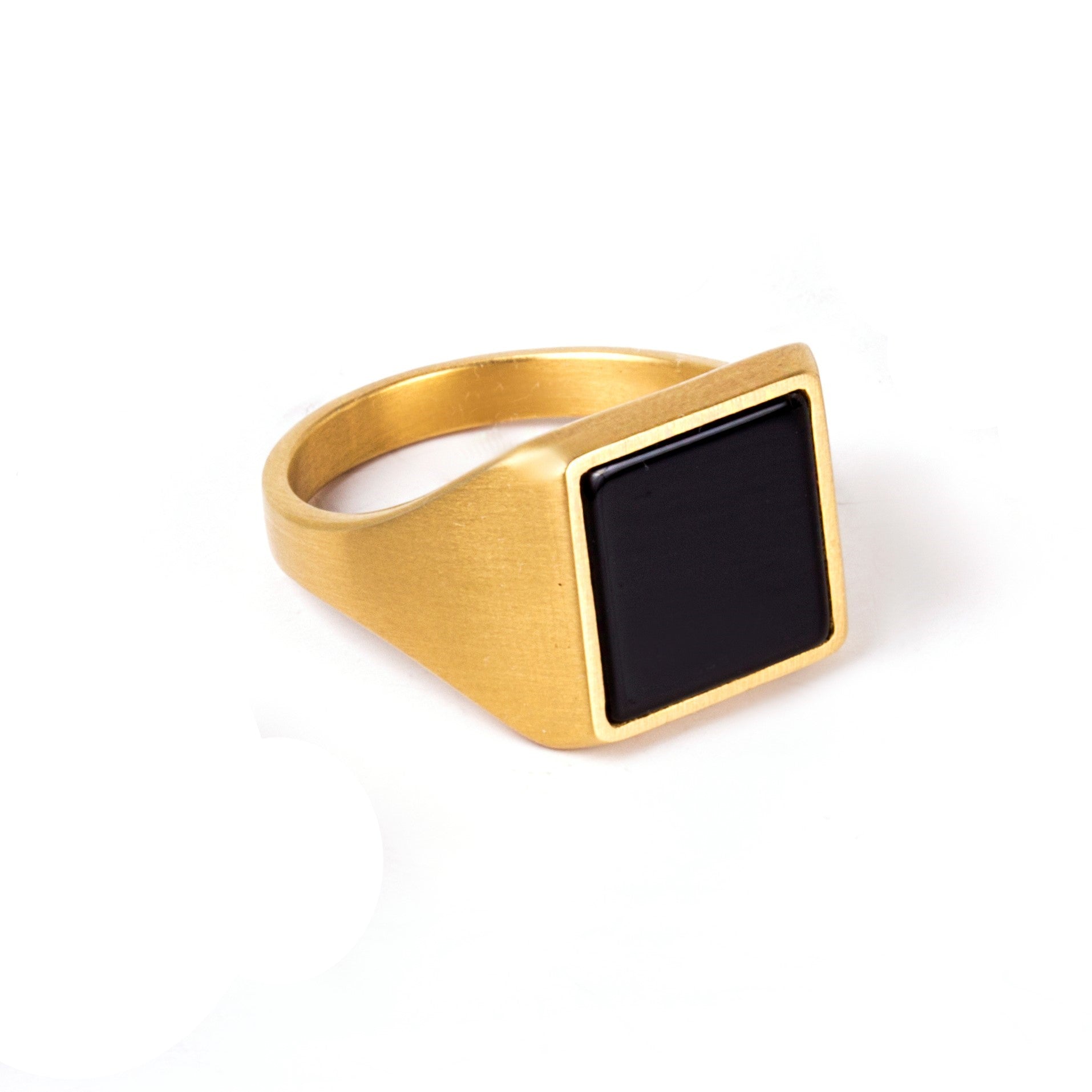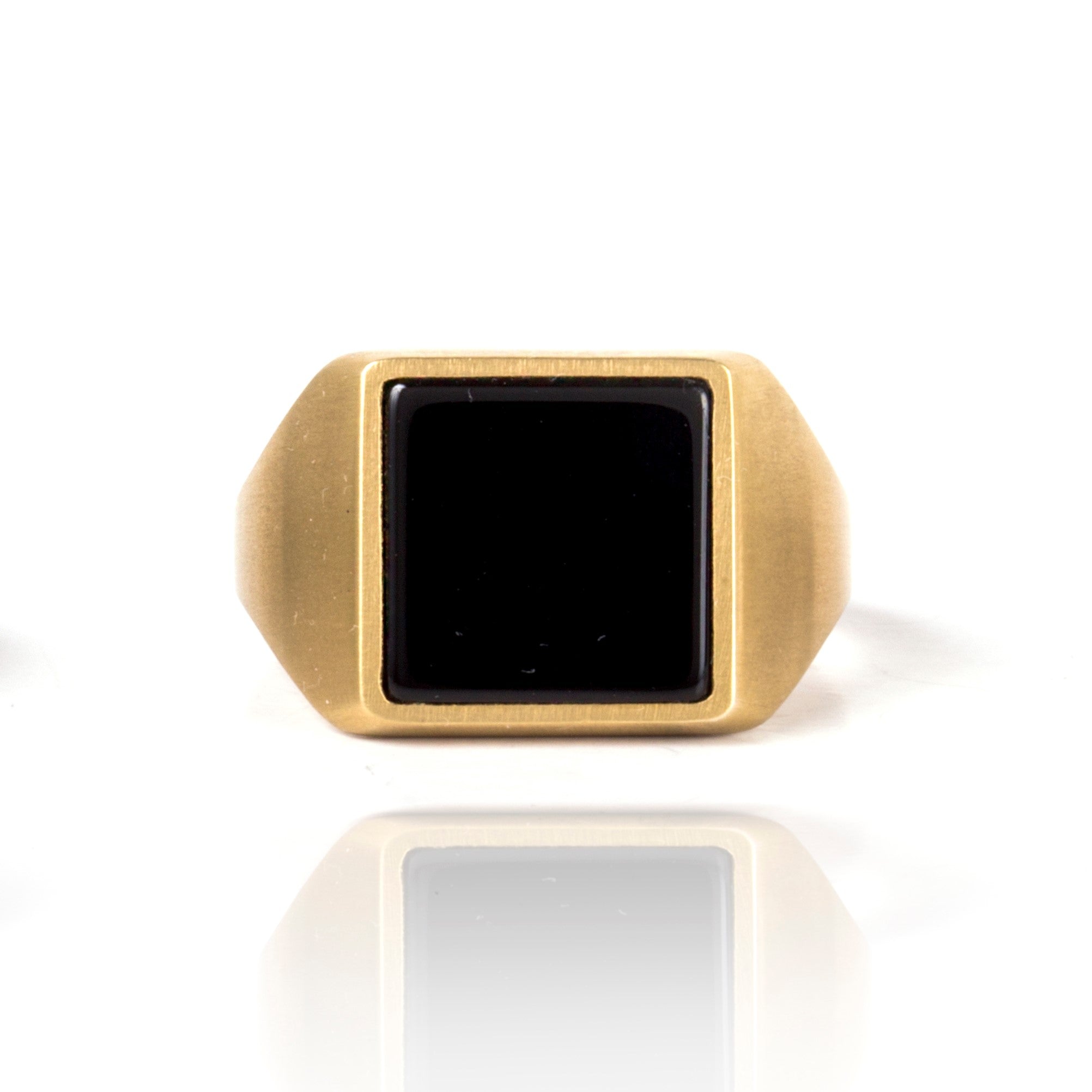 A unique Onyx signet ring made out of 9K Solid Gold, 14K Solid Gold, or 18K Solid Gold. Choose a Yellow Gold, White Gold, or a Rose Gold finish.