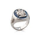 A beautiful blue and black agate family crest signet ring made out of 9K Solid Gold, 14K Solid Gold, or 18K Solid Gold. Choose a Yellow Gold, White Gold, or a Rose Gold finish.