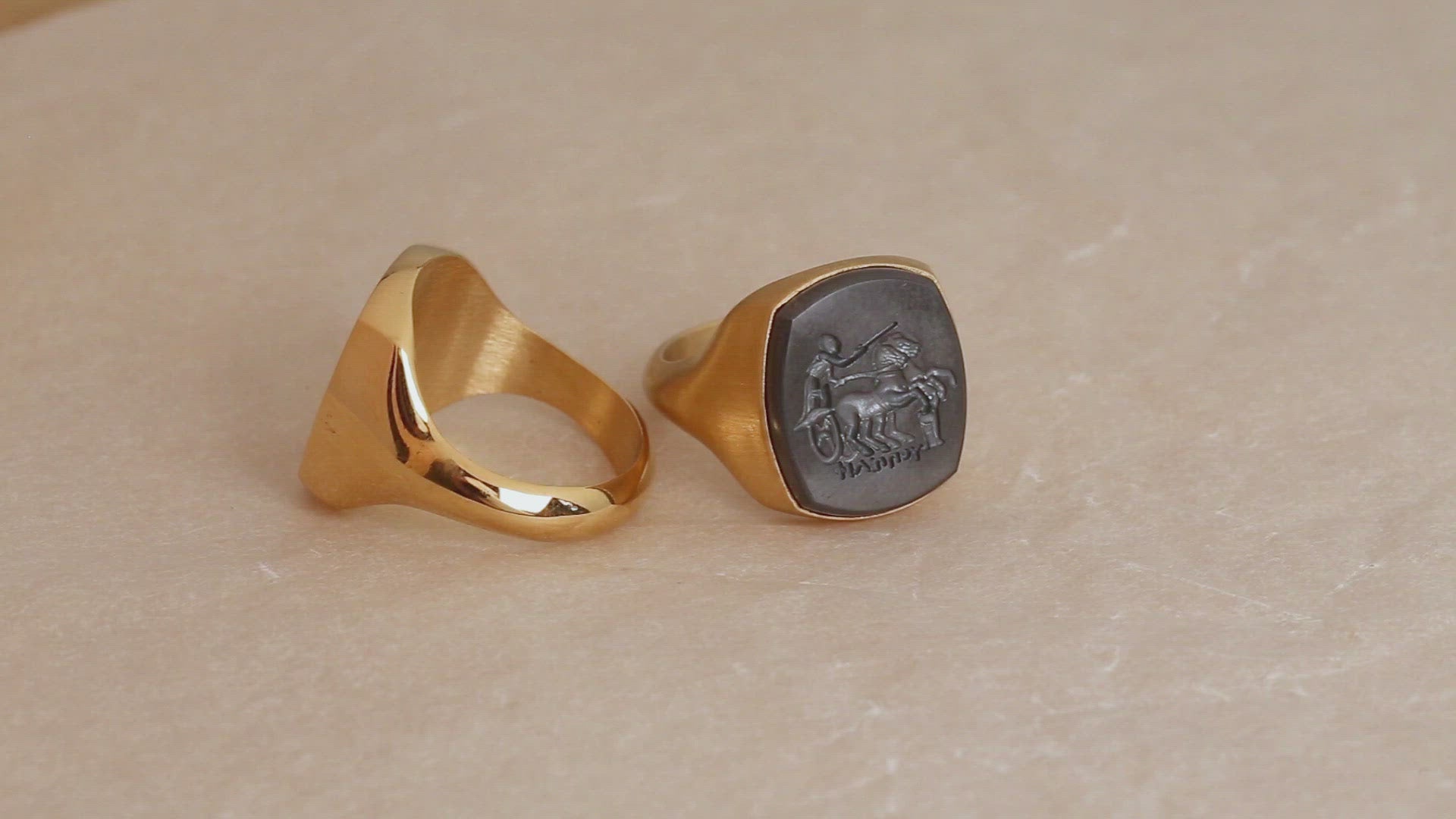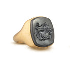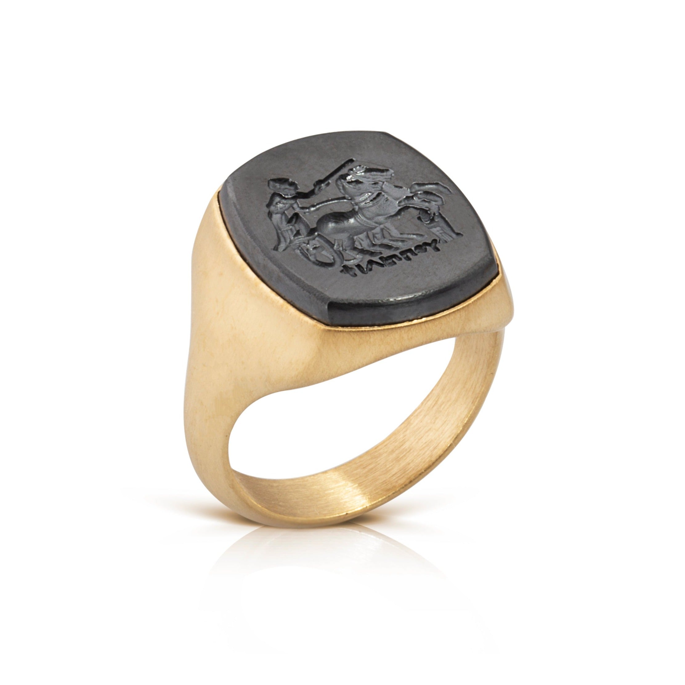 A hematite signet ring that has been carved with a design inspired by "Filippou, Riding Horses".