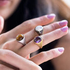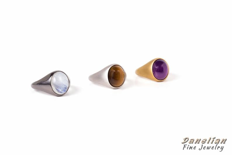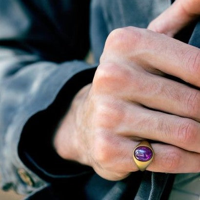 A beautiful purple natural amethyst signet ring made out of 9K Solid Gold, 14K Solid Gold or 18K Solid Gold. Available in Yellow Gold, White Gold or Rose Gold matte finish.